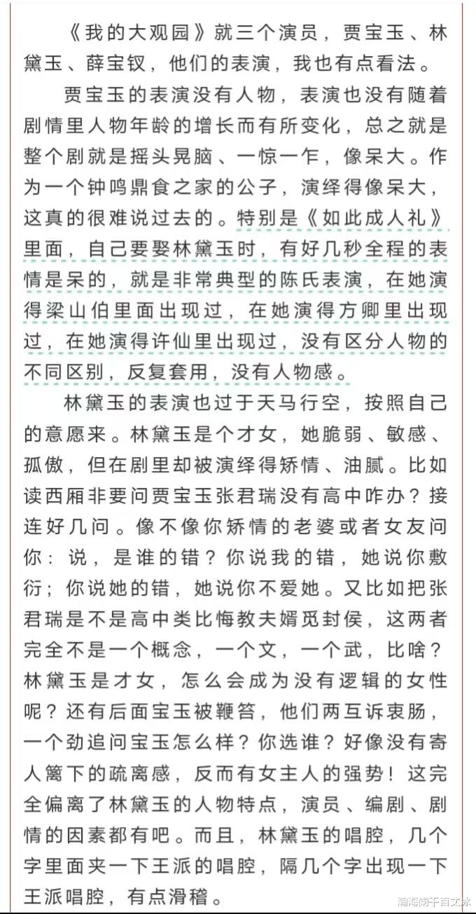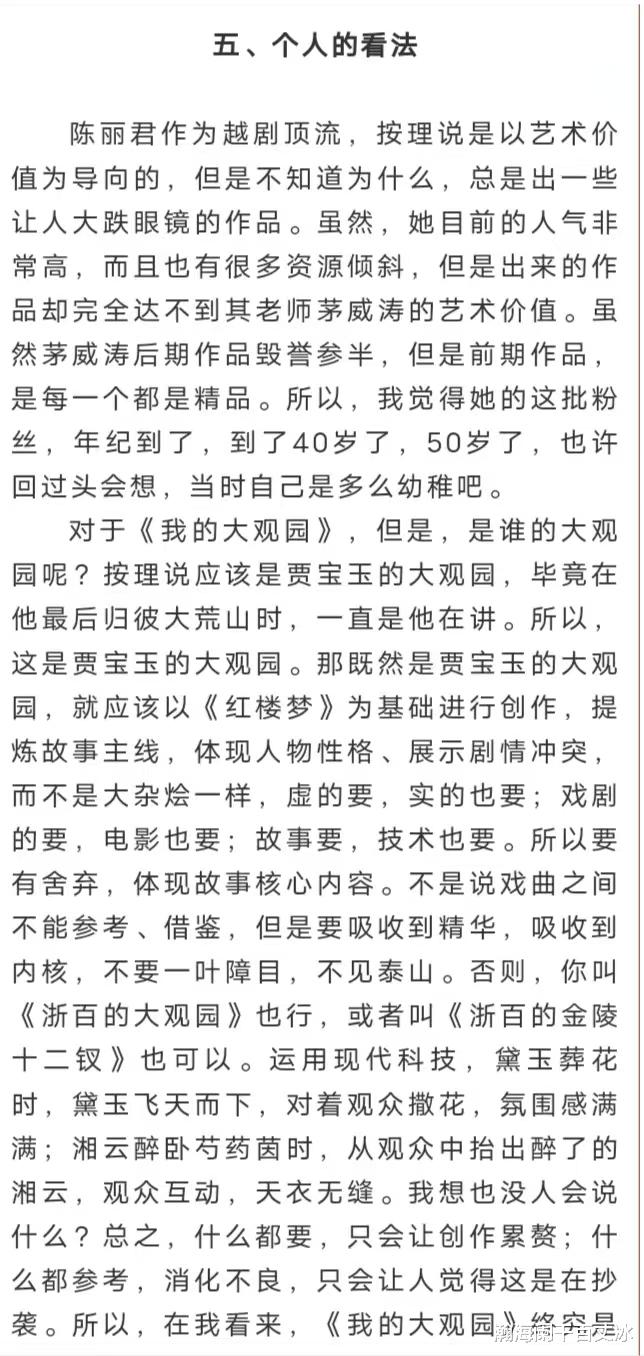 我只想说的是:浙百方面应该好好打磨一下剧本;陈丽君静下心来多读书多学习,虚心听取并接纳观众的建议;粉丝们也坐下来好好看看《红楼梦》,再来看《我的大观园》,这样才有话语权。(一个啥都不懂的人,是没资格在这谈贾宝玉的)。