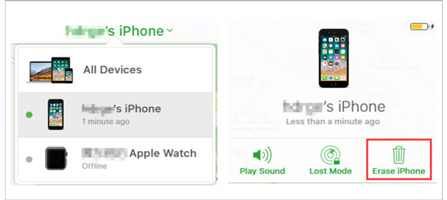 第 2 步。选择“查找我的 iPhone”>“所有设备”,然后单击已禁用的 iPhone > 点击“擦除 iPhone”。