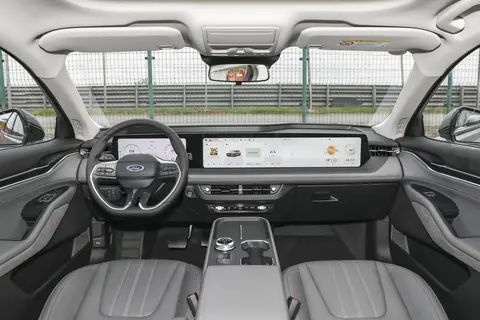 步入车内,科技感与高级感是新蒙迪欧混动运动版座舱给人的第一印象。环抱式的座舱布局以驾驶者为中心,营造出强烈的包裹感。最引人注目的无疑是那块由12.3英寸全液晶仪表盘与27英寸4K中控巨幅屏组成的超大尺寸联屏,其总长度超过1.1米,无论是显示的细腻程度还是操作的流畅性,都达到了相当不错的水准。内饰用料方面,大面积的软性材质包覆配合精致的缝线工艺,有效提升了整体的档次感。此版本采用了独特的皮织混搭座椅,在保证透气性的同时,也提供了良好的摩擦力和支撑性,与车型的运动定位十分契合。在细节设计上,悬浮式的中央扶手区、电子式旋钮换挡机构,以及新增的空调实体按键,都体现了设计师在追求科技感与实用便利性之间的平衡。车内总计高达43L的储物空间,加上前后排共5个USB/Type-C接口的配置,充分照顾到了车内每一位乘客的储物与充电需求。