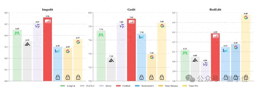 对比结果显示,FireRed-Image-Edit凭借更精准的理解力、更强的ID保持度及高效的架构,在多项权威测试中脱颖而出,在ImgEdit、GEdit等多个榜单中取得了SOTA,达到业界领先水平。