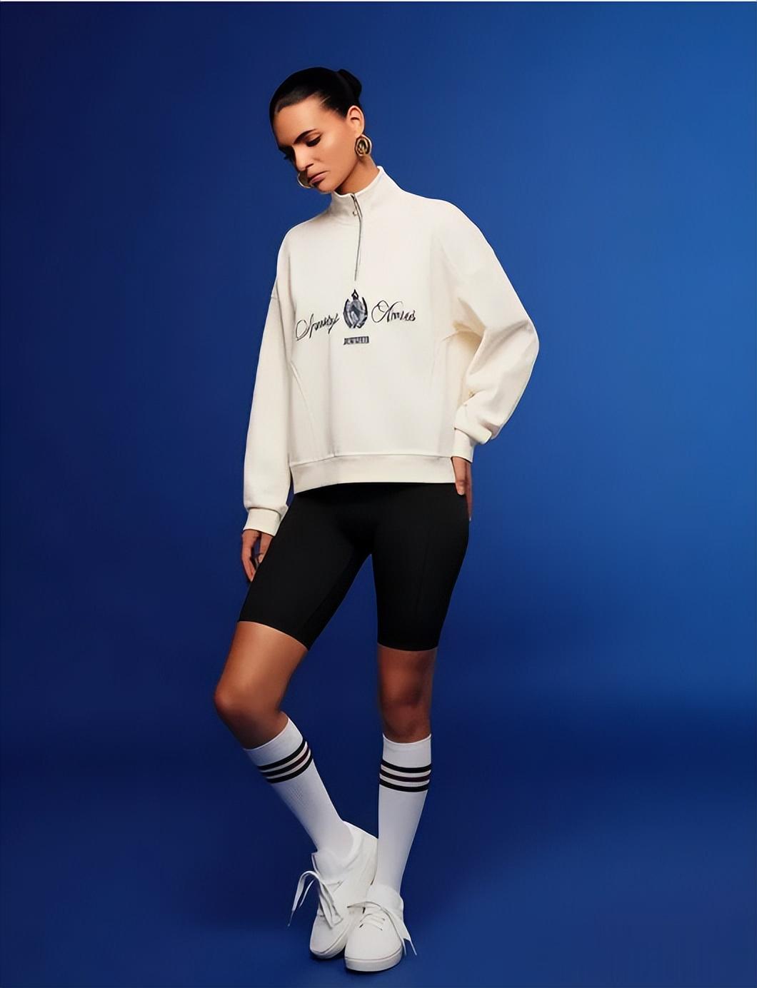 模特穿上图1服饰,版型宽松。搭配黑色、材质为氨纶、纯色、紧身、长度至大腿中部的骑行短裤,再搭配金色圆环耳环。