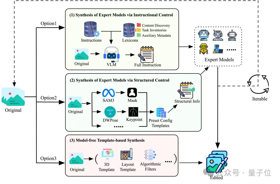 首先来看数据引擎方面,FireRed-Image-Edit构建了一套图像编辑数据生产引擎,从“快速、可控、精准”出发,将复杂编辑需求拆解为可组合的子任务,并通过三条路径规模化产出训练对:
