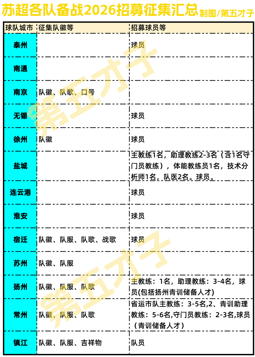泰州、无锡、徐州、盐城、连云港、淮安、宿迁、扬州、常州、镇江都有招募球员等人员计划。泰州仅招募球员,未提及招募主教练。而2025赛季主教练周高萍已表示离开,如果2026还用长春泰州U21的话,也有可能将高敬刚扶正。而泰州招人,是否意味不和亚泰U21合作了?