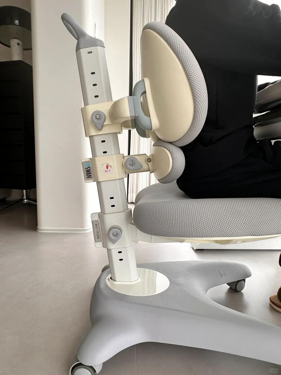 搭配的学习椅是符合孩子人体工学的,3D双背全包裹的靠背设计,坐上边写字看书都不会驼背。通过精准卡位旋钮+卡扣进行调节不论什么身高的孩子都能调试到合适的高度。