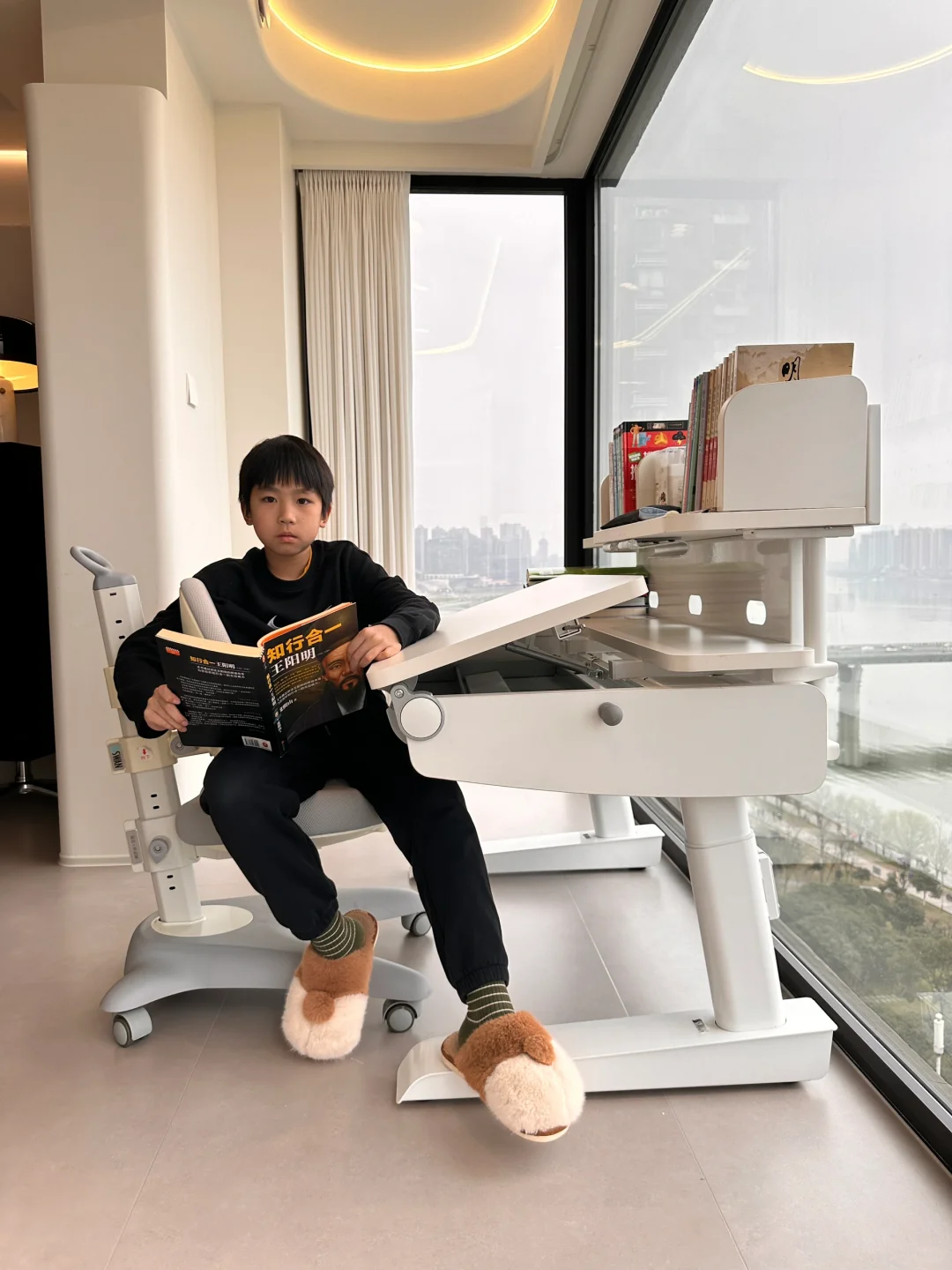 设计上也很合理,现在小朋友作业都比较多,桌面比较宽,自带悬停锁定系统,可以任意调节角度,写作业画画看书都可以。
