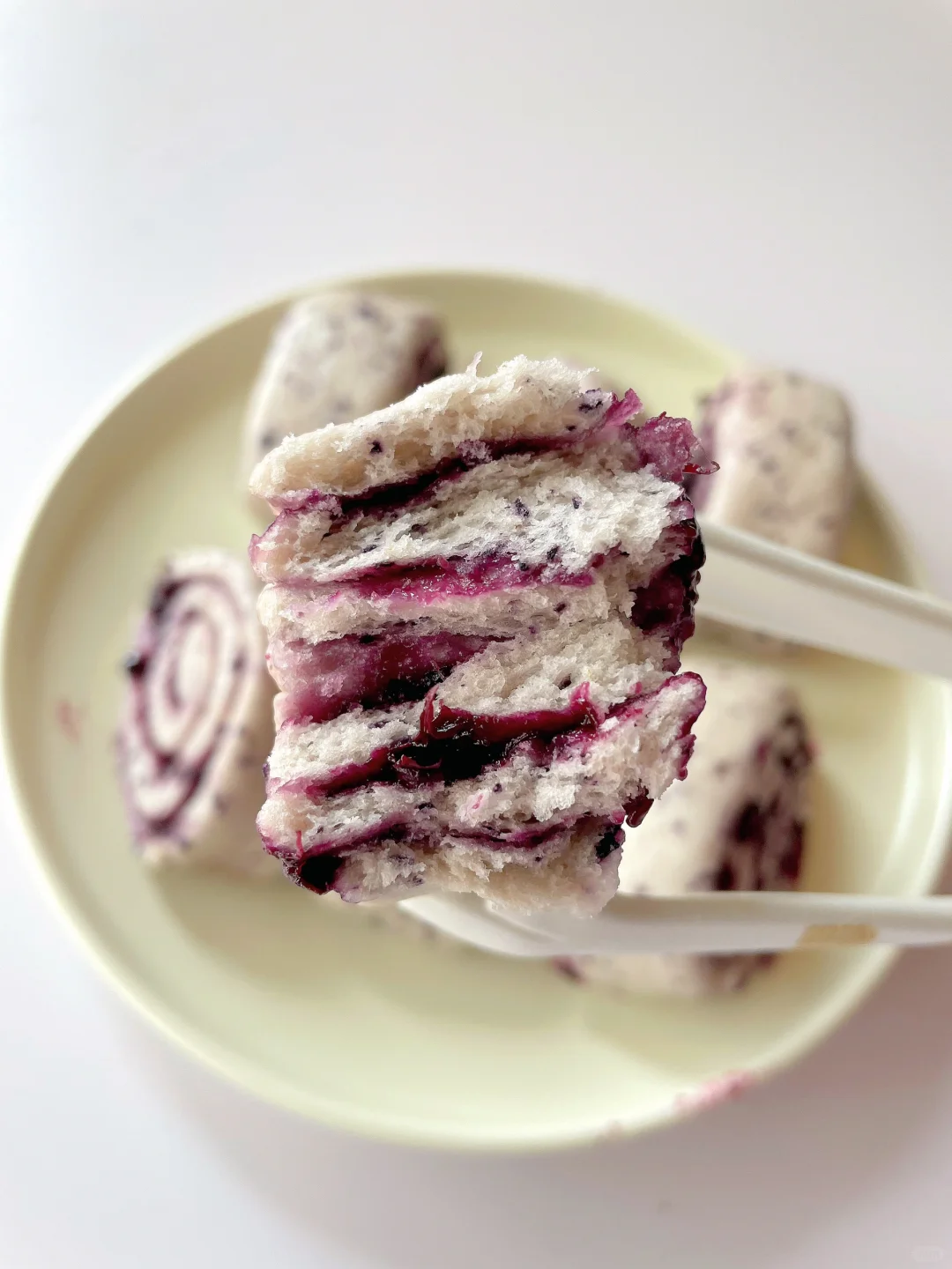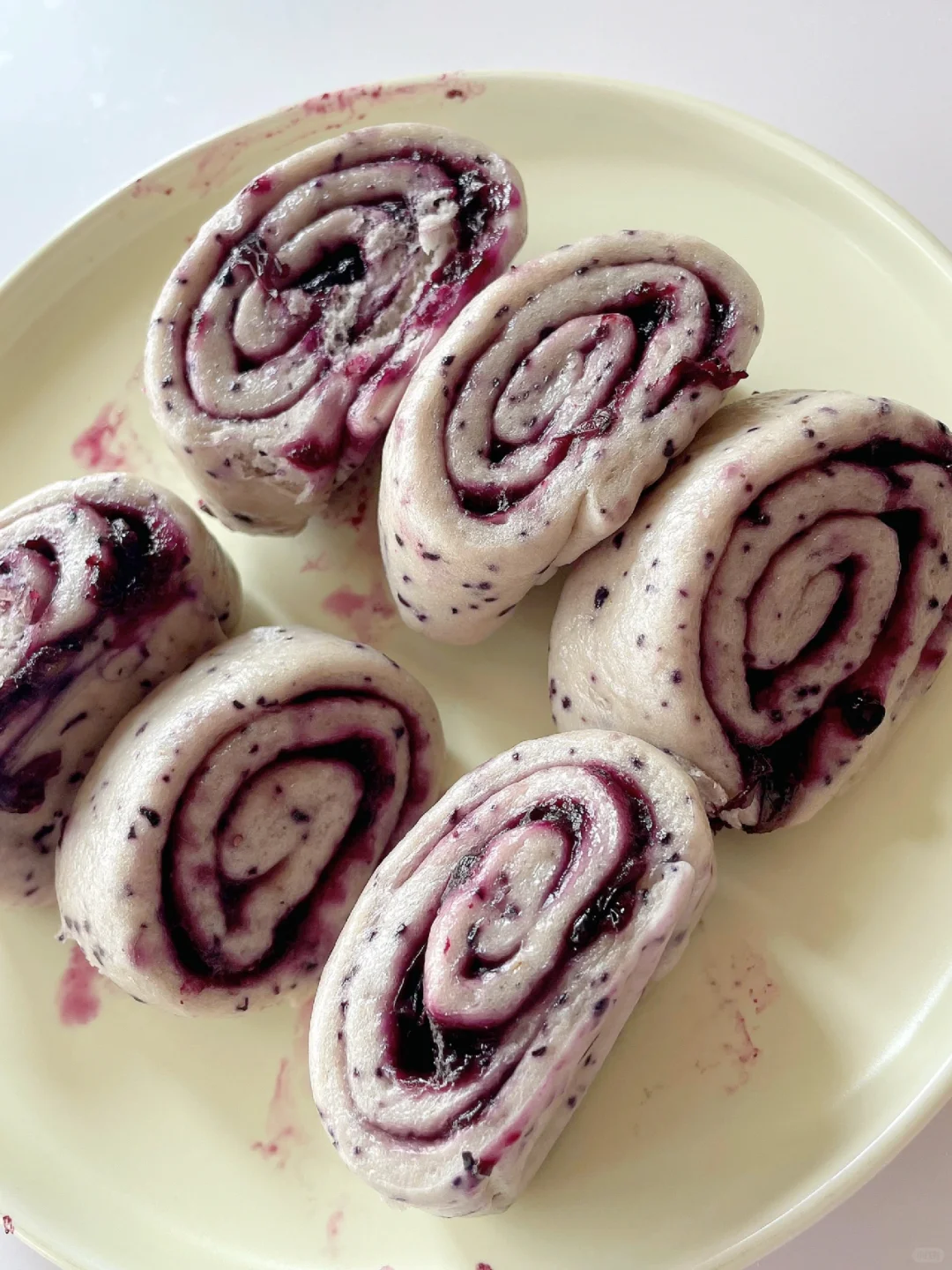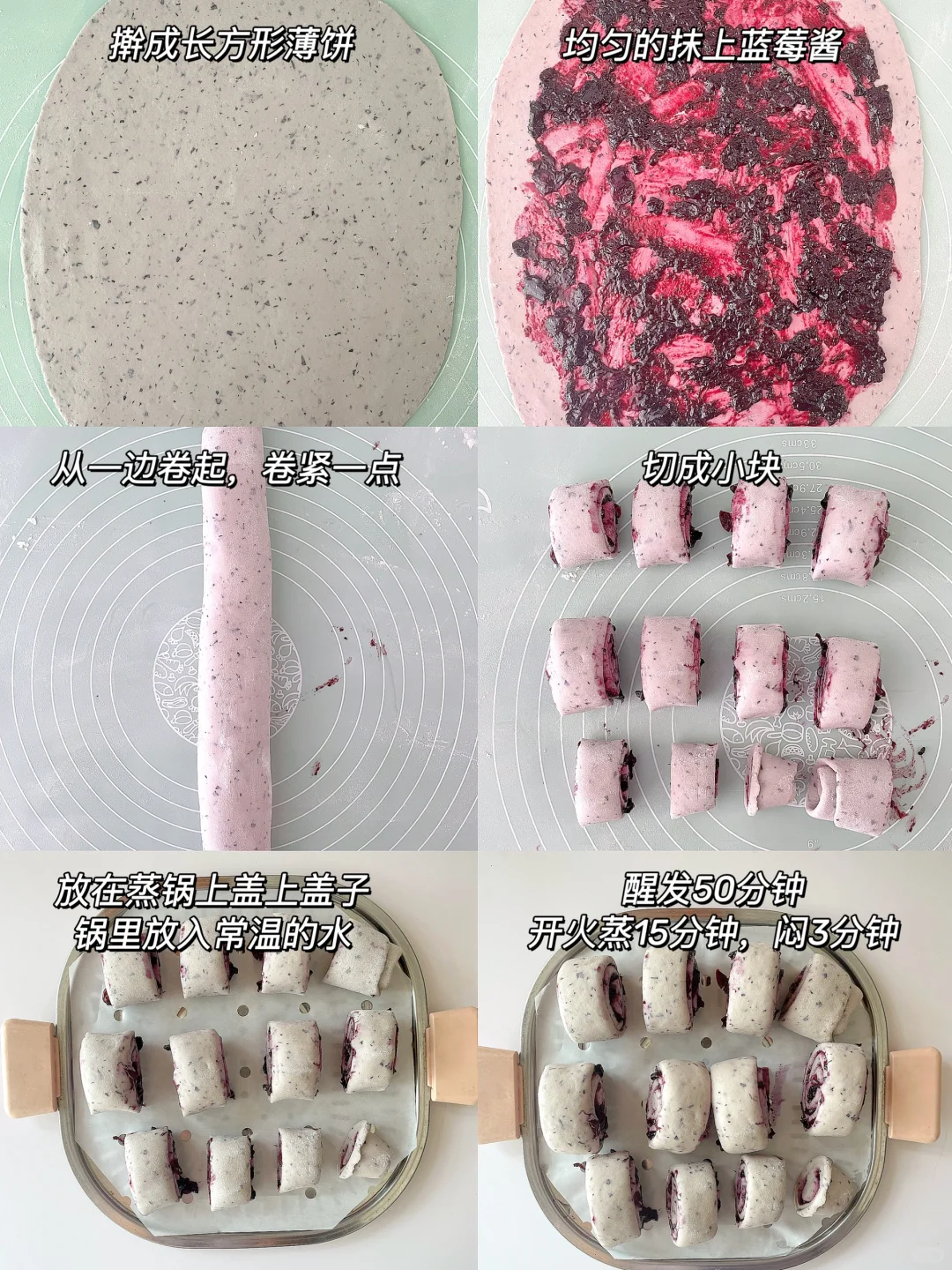 🌈酸甜的蓝莓酱搭配奶香的馒头~ 🎈准备食材: 1️⃣蓝莓酱:蓝莓120克,白糖10克(可不加); 2️⃣面胚:面粉200克,酵母2克,蓝莓60克,牛奶80克; 🎈制作步骤: 1️⃣蓝莓酱:蓝莓和糖倒入不粘锅中,开最小火熬,蓝莓膨胀后用硅胶铲压扁,熬成果酱备用; 2️⃣蓝莓和牛奶倒入料理机中打成糊,倒入碗中,然后把其它食材都倒入碗中; 3️⃣用筷子搅拌成絮状,再用手揉成面团,密封醒发15分钟,再揉成光滑的面团; 4️⃣把面团擀成长方形的薄饼,把蓝莓酱均匀的摸在面饼上,然后沿着长的那边卷起,一定要卷紧点哦; 5️⃣卷成长条后切成如图的小块,把面胚放在蒸笼上,蒸锅里放常温水,蒸笼放上盖上盖子,醒发50分钟左右,醒发至原来的1.5倍大; 🎈开火蒸15分钟,闷3分钟