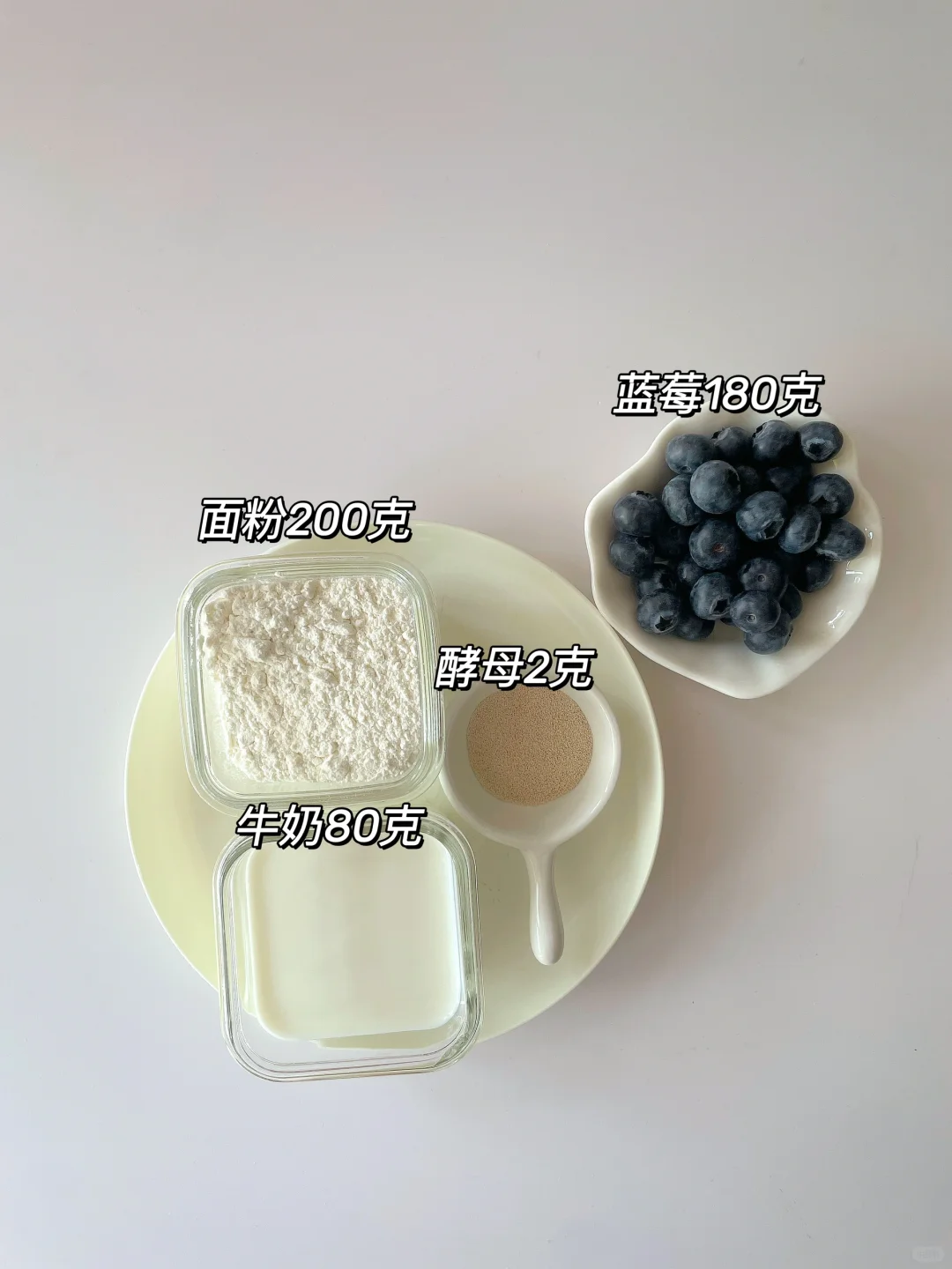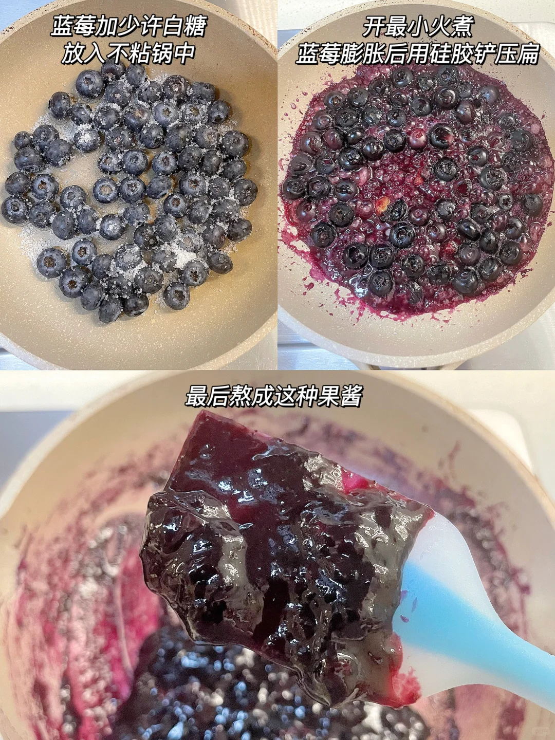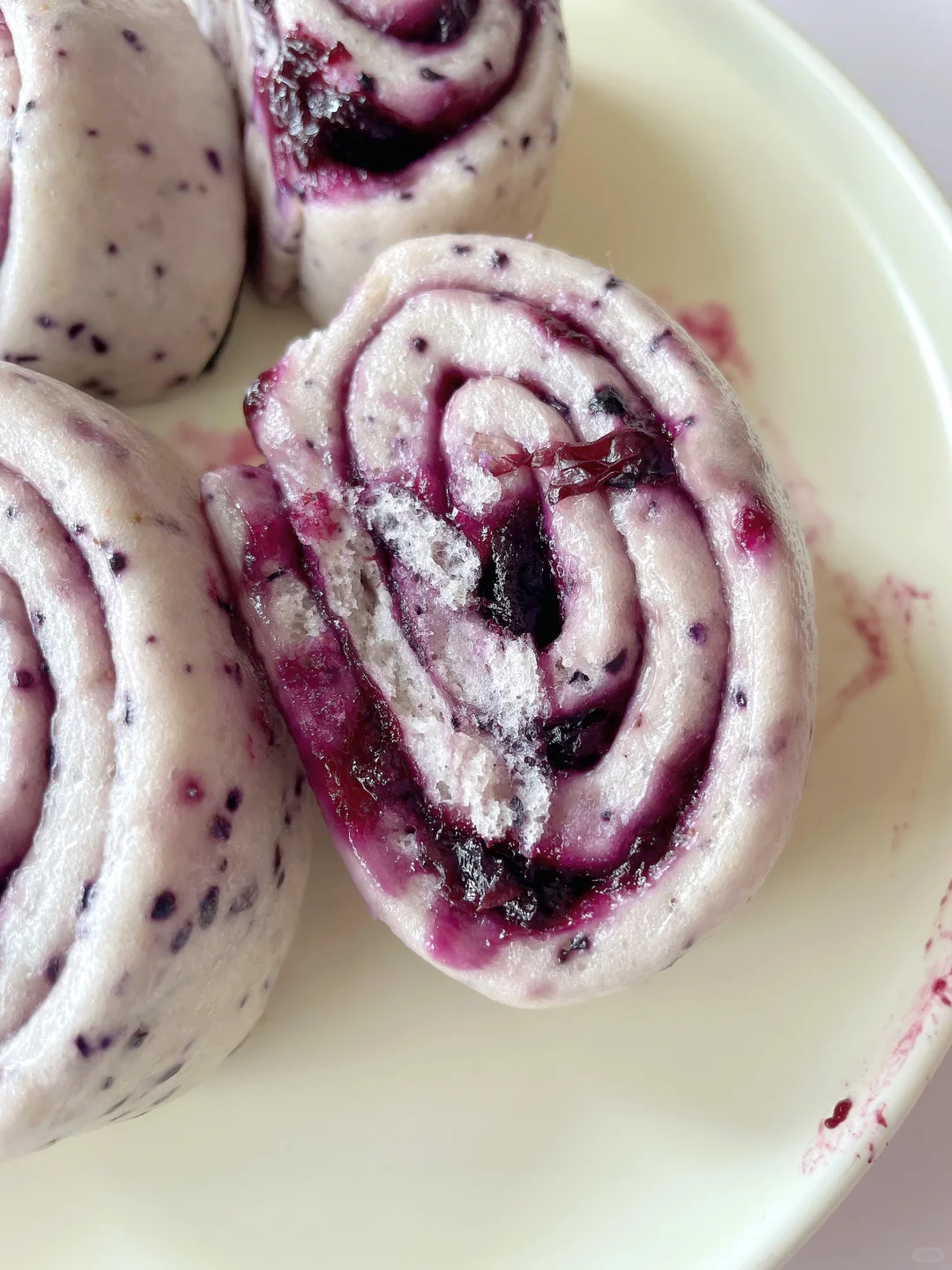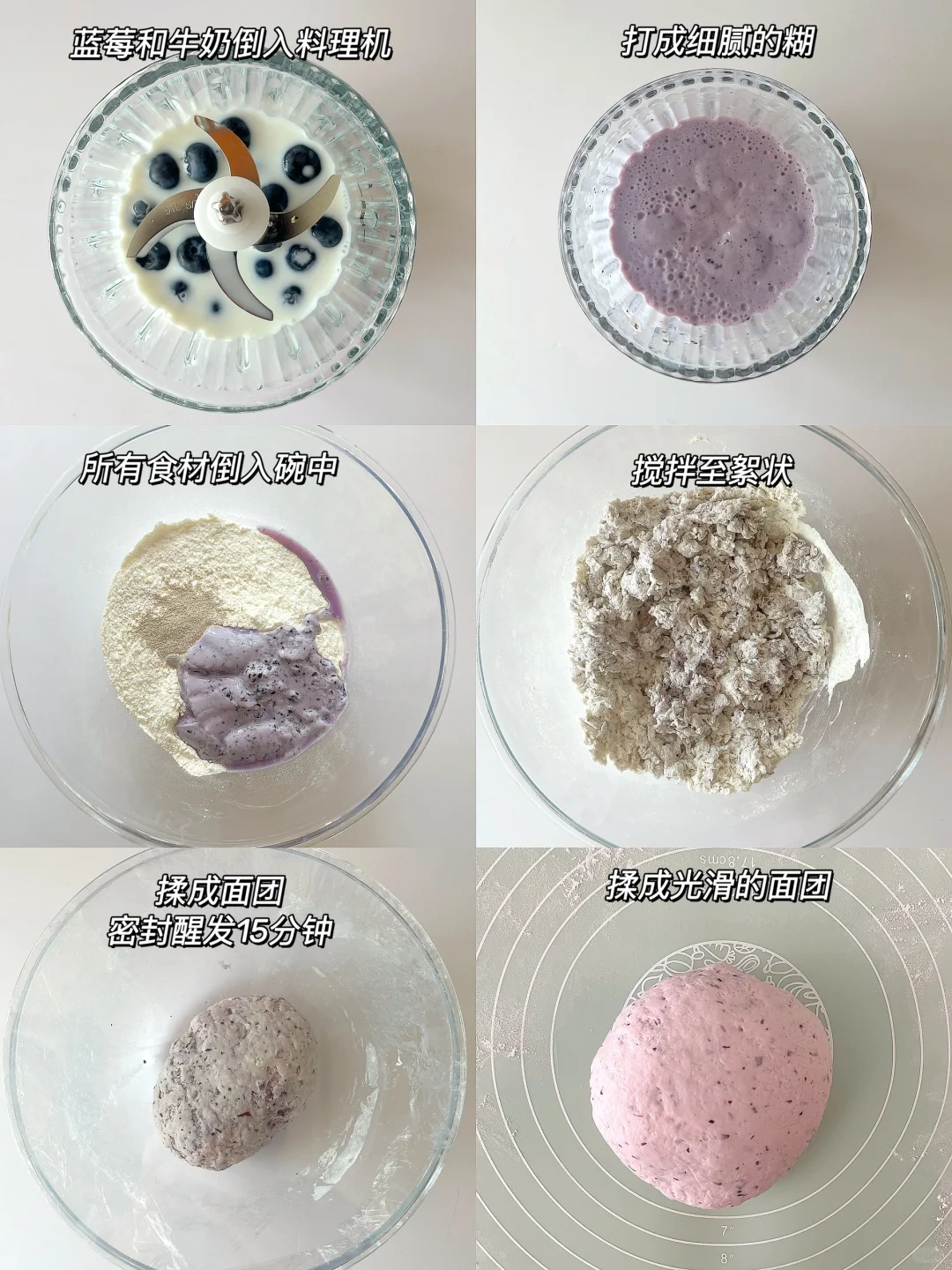 🌈酸甜的蓝莓酱搭配奶香的馒头~ 🎈准备食材: 1️⃣蓝莓酱:蓝莓120克,白糖10克(可不加); 2️⃣面胚:面粉200克,酵母2克,蓝莓60克,牛奶80克; 🎈制作步骤: 1️⃣蓝莓酱:蓝莓和糖倒入不粘锅中,开最小火熬,蓝莓膨胀后用硅胶铲压扁,熬成果酱备用; 2️⃣蓝莓和牛奶倒入料理机中打成糊,倒入碗中,然后把其它食材都倒入碗中; 3️⃣用筷子搅拌成絮状,再用手揉成面团,密封醒发15分钟,再揉成光滑的面团; 4️⃣把面团擀成长方形的薄饼,把蓝莓酱均匀的摸在面饼上,然后沿着长的那边卷起,一定要卷紧点哦; 5️⃣卷成长条后切成如图的小块,把面胚放在蒸笼上,蒸锅里放常温水,蒸笼放上盖上盖子,醒发50分钟左右,醒发至原来的1.5倍大; 🎈开火蒸15分钟,闷3分钟