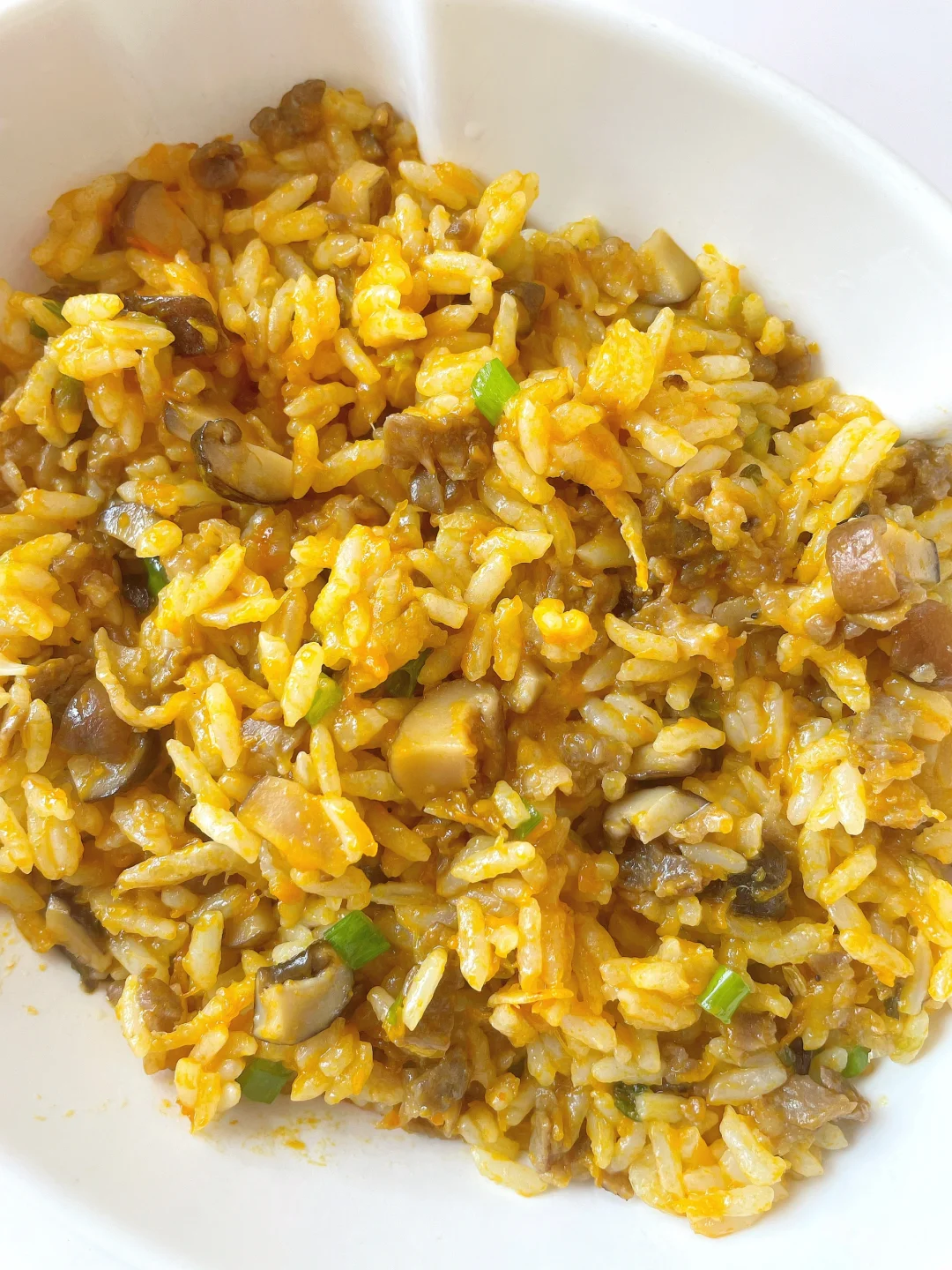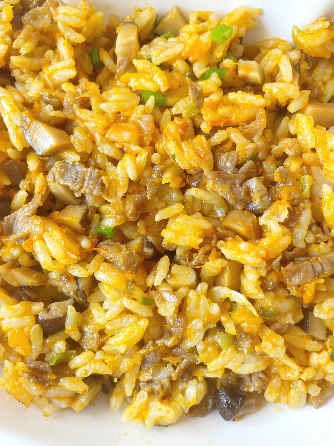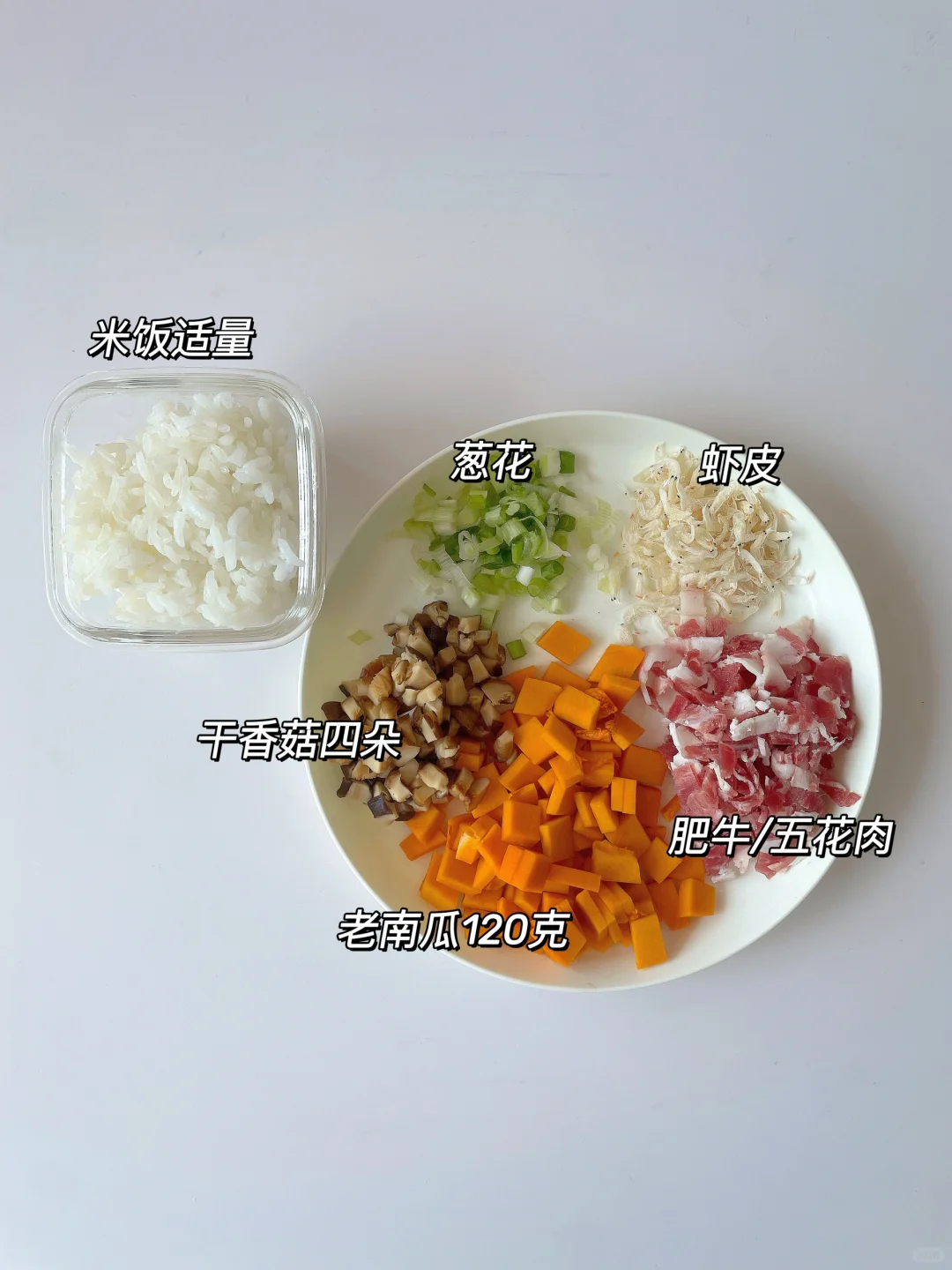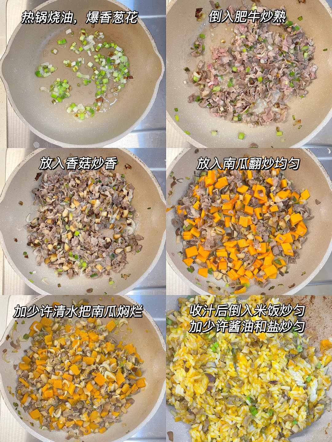 🌈鲜香软糯的烩饭~ 🎈准备食材: 1️⃣老南瓜120克,干香菇四朵,五花肉/肥牛适量,葱花适量,虾皮少许,米饭适量; 🎈制作步骤: 1️⃣食材处理好后备用; 2️⃣热锅烧油,倒入葱花爆香,放入肥牛炒熟,加入香菇丁炒香,再倒入南瓜翻炒均匀; 3️⃣倒入少许清水焖煮,把南瓜煮烂后收汁,倒入米饭炒匀,再加少许酱油和盐炒匀,出锅前可以撒入少许葱花~