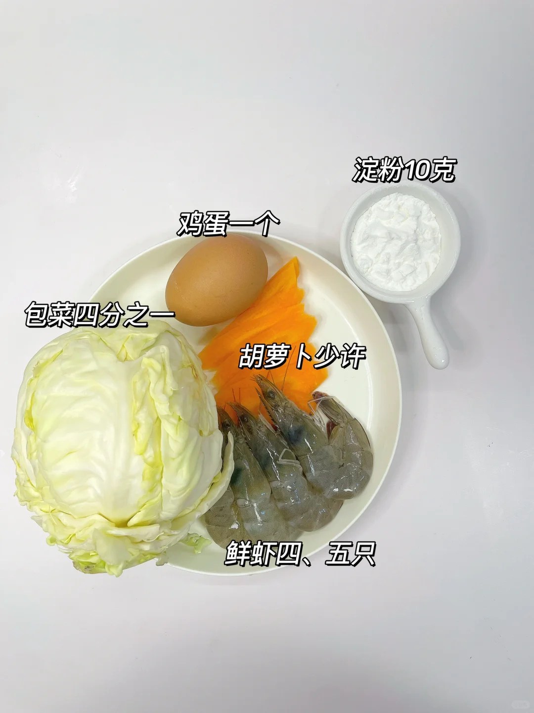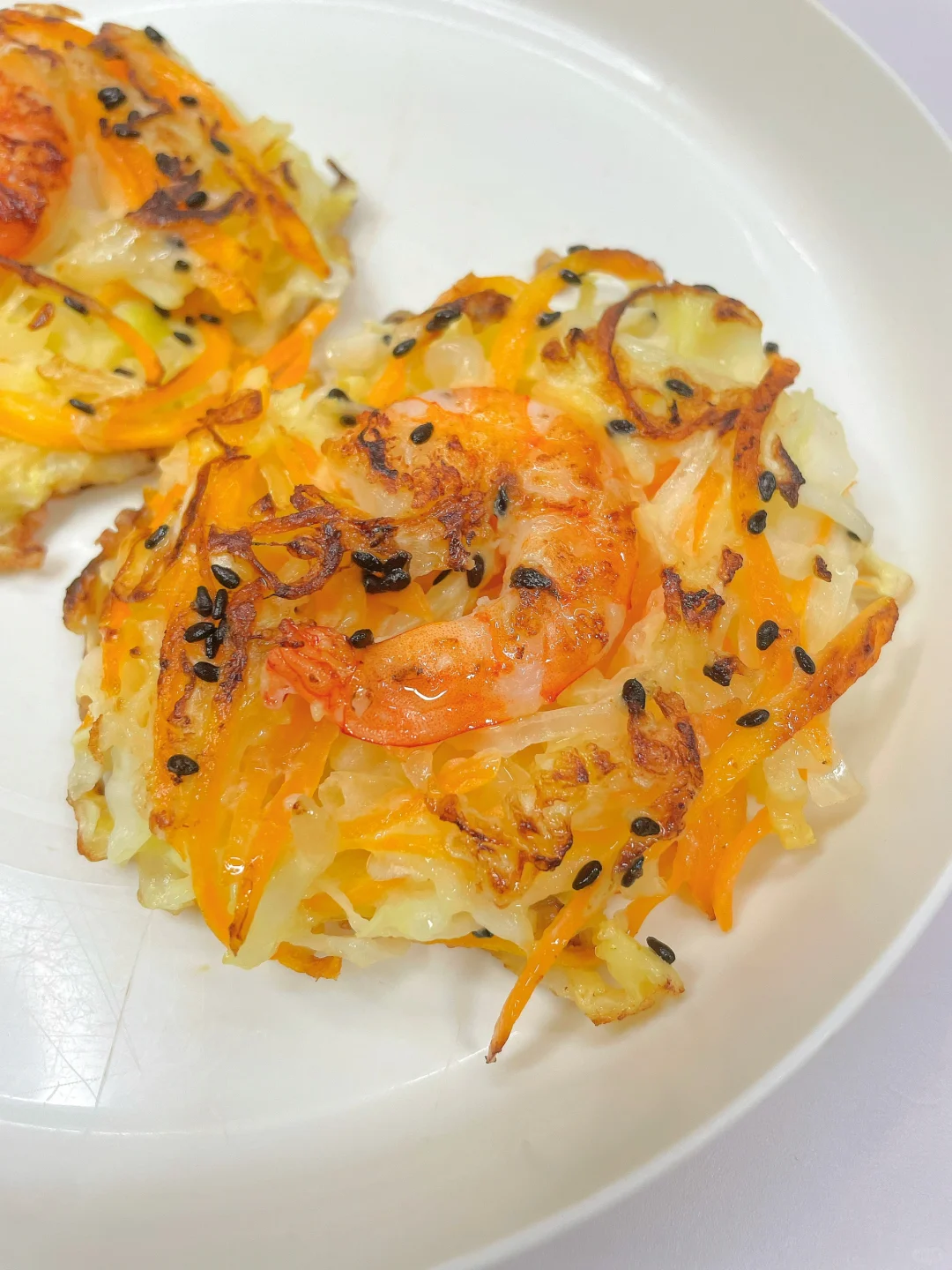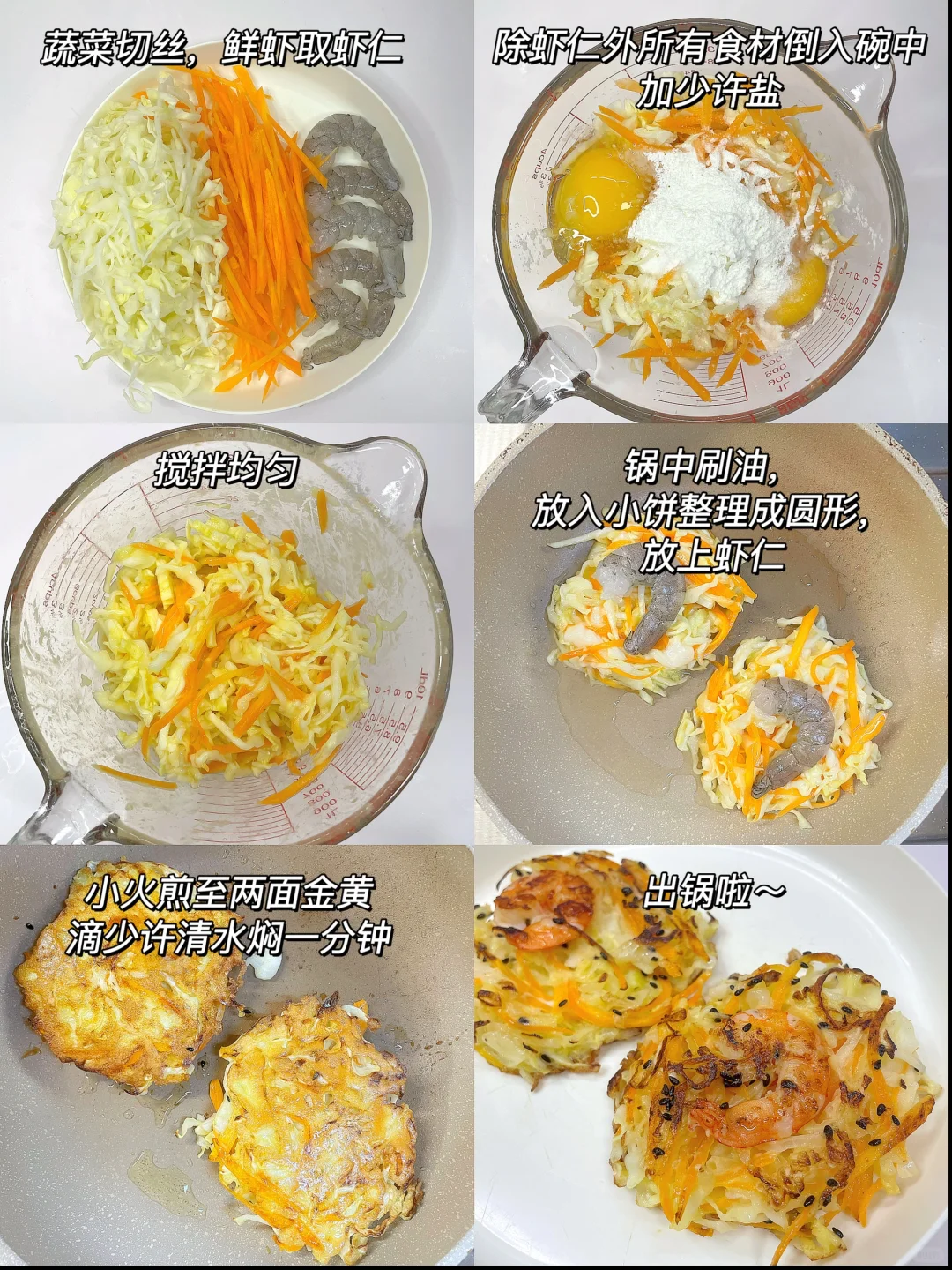🌈鲜香又清甜的蔬菜虾饼,营养又美味~ 🎈准备食材: 1️⃣包菜四分之一个,胡萝卜小半根,鸡蛋一个,鲜虾四只左右,淀粉10克; 🎈制作步骤: 1️⃣蔬菜切丝,鲜虾取虾仁; 2️⃣把除虾仁外的所有食材倒入碗中,加少许盐搅拌均匀,静置几分钟后蔬菜稍微出水后再次拌匀; 3️⃣平底锅中刷油,放入小饼整理成圆形,中间压凹进去,摆入虾仁; 4️⃣小火煎至两面金黄,滴少许清水焖一分钟保证熟透即可~