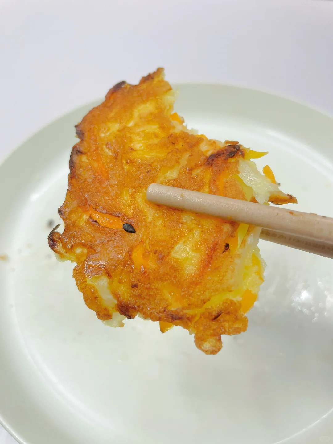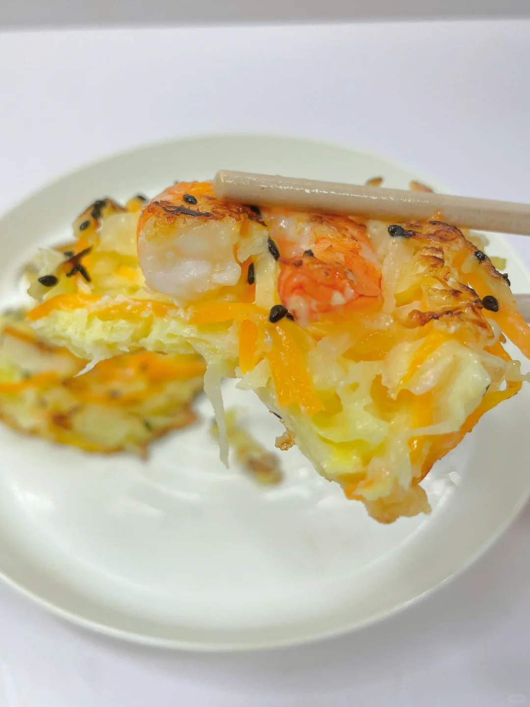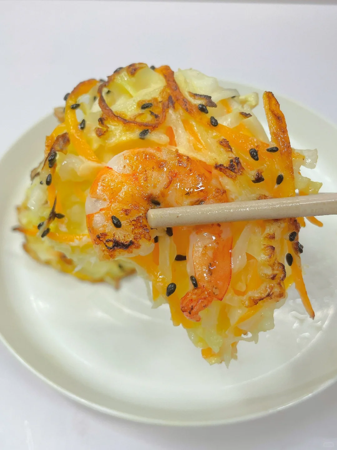 🌈鲜香又清甜的蔬菜虾饼,营养又美味~ 🎈准备食材: 1️⃣包菜四分之一个,胡萝卜小半根,鸡蛋一个,鲜虾四只左右,淀粉10克; 🎈制作步骤: 1️⃣蔬菜切丝,鲜虾取虾仁; 2️⃣把除虾仁外的所有食材倒入碗中,加少许盐搅拌均匀,静置几分钟后蔬菜稍微出水后再次拌匀; 3️⃣平底锅中刷油,放入小饼整理成圆形,中间压凹进去,摆入虾仁; 4️⃣小火煎至两面金黄,滴少许清水焖一分钟保证熟透即可~