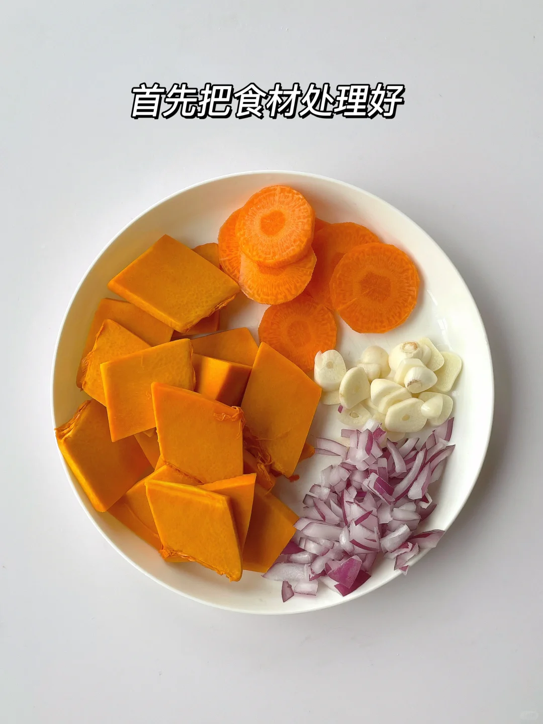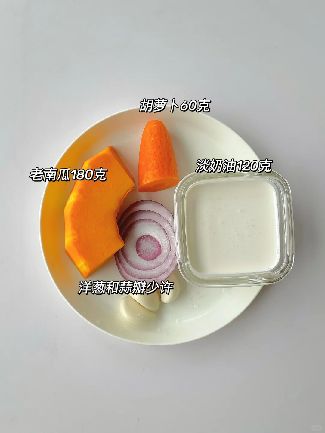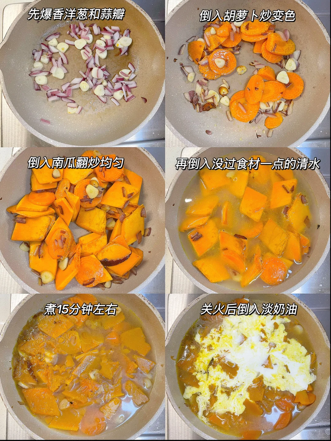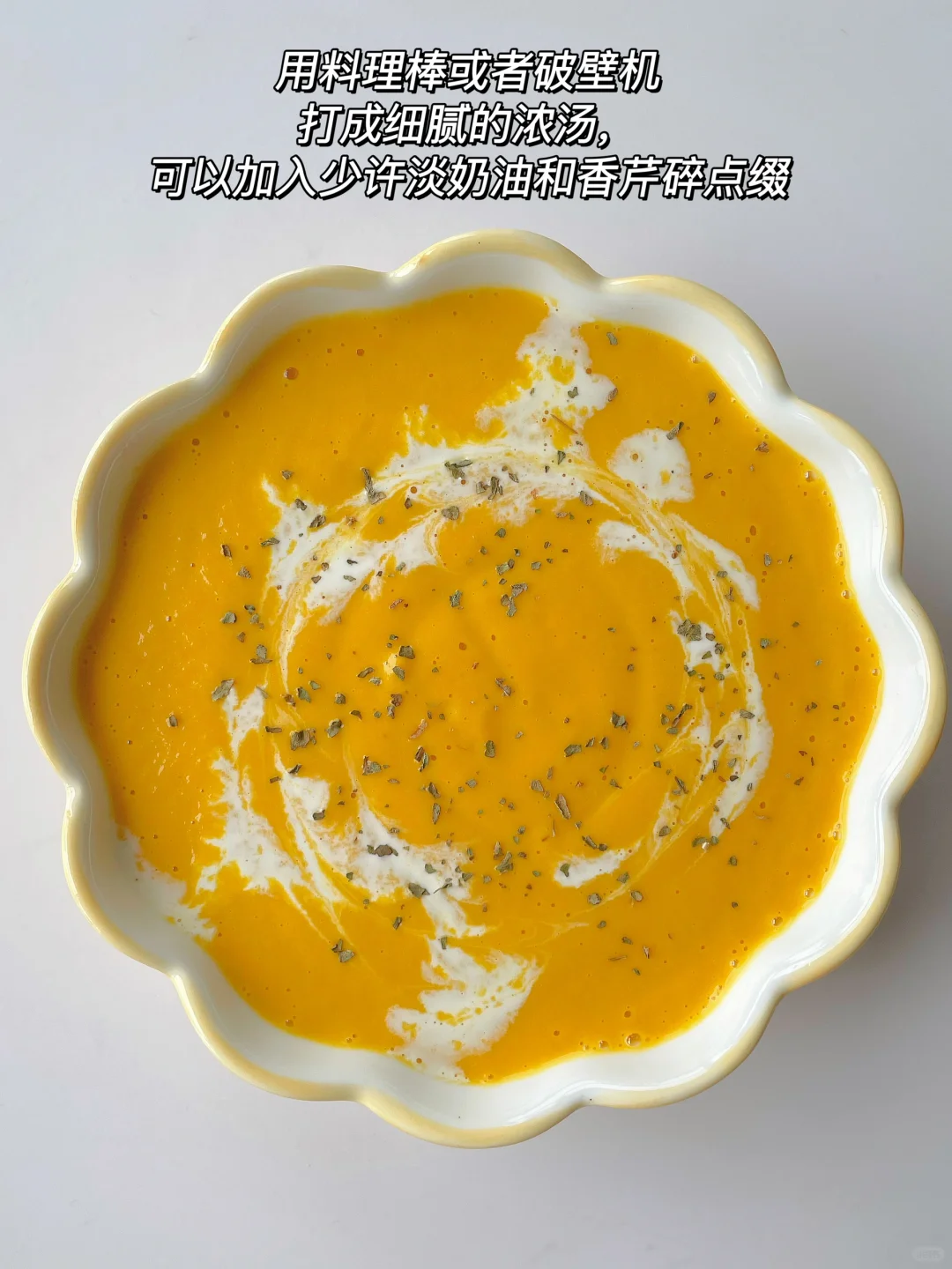 🎃超级香浓的南瓜汤,搭配脆脆的烤吐司更美味哦~ 🎈准备食材: 1️⃣老南瓜180克,胡萝卜60克,淡奶油120克,洋葱和蒜瓣少许; 🎈制作步骤: 1️⃣先把食材切好备用; 2️⃣热锅烧油,先爆香洋葱和蒜瓣,再倒入胡萝卜炒香,放入南瓜炒匀; 3️⃣倒入没过食材一点的清水,煮15分钟,关火后倒入淡奶油搅拌均匀; 4️⃣把煮好的食材倒入破壁机或者用料理棒打成细腻的浓汤,可以加点淡奶油和欧芹碎在表面点缀~