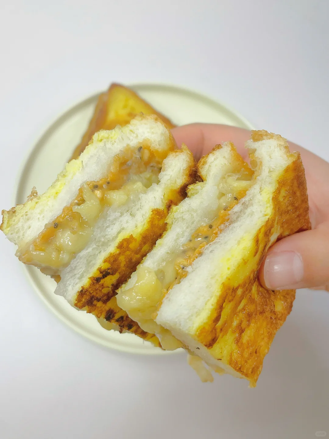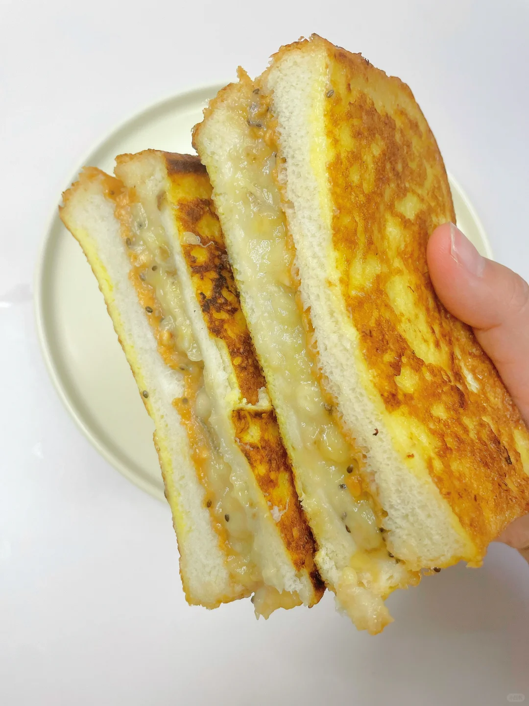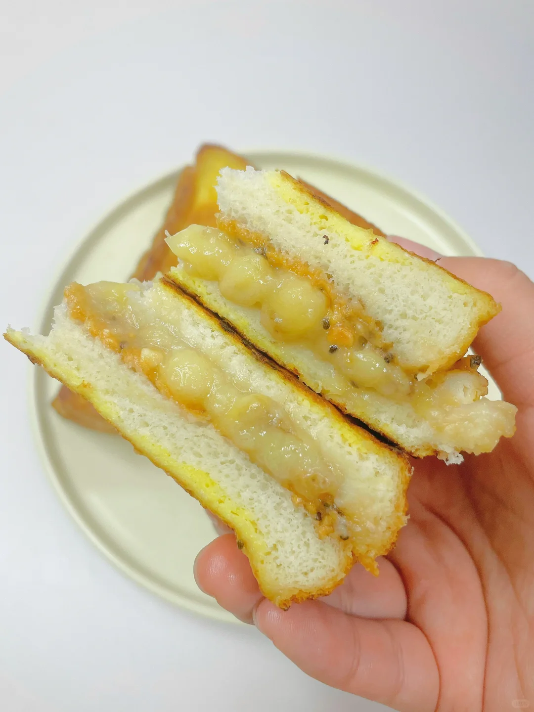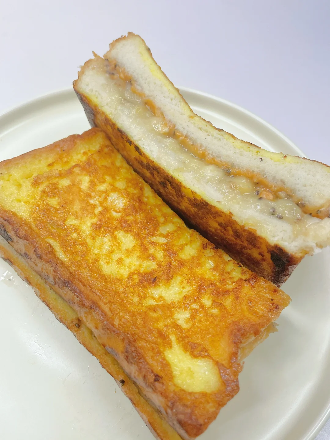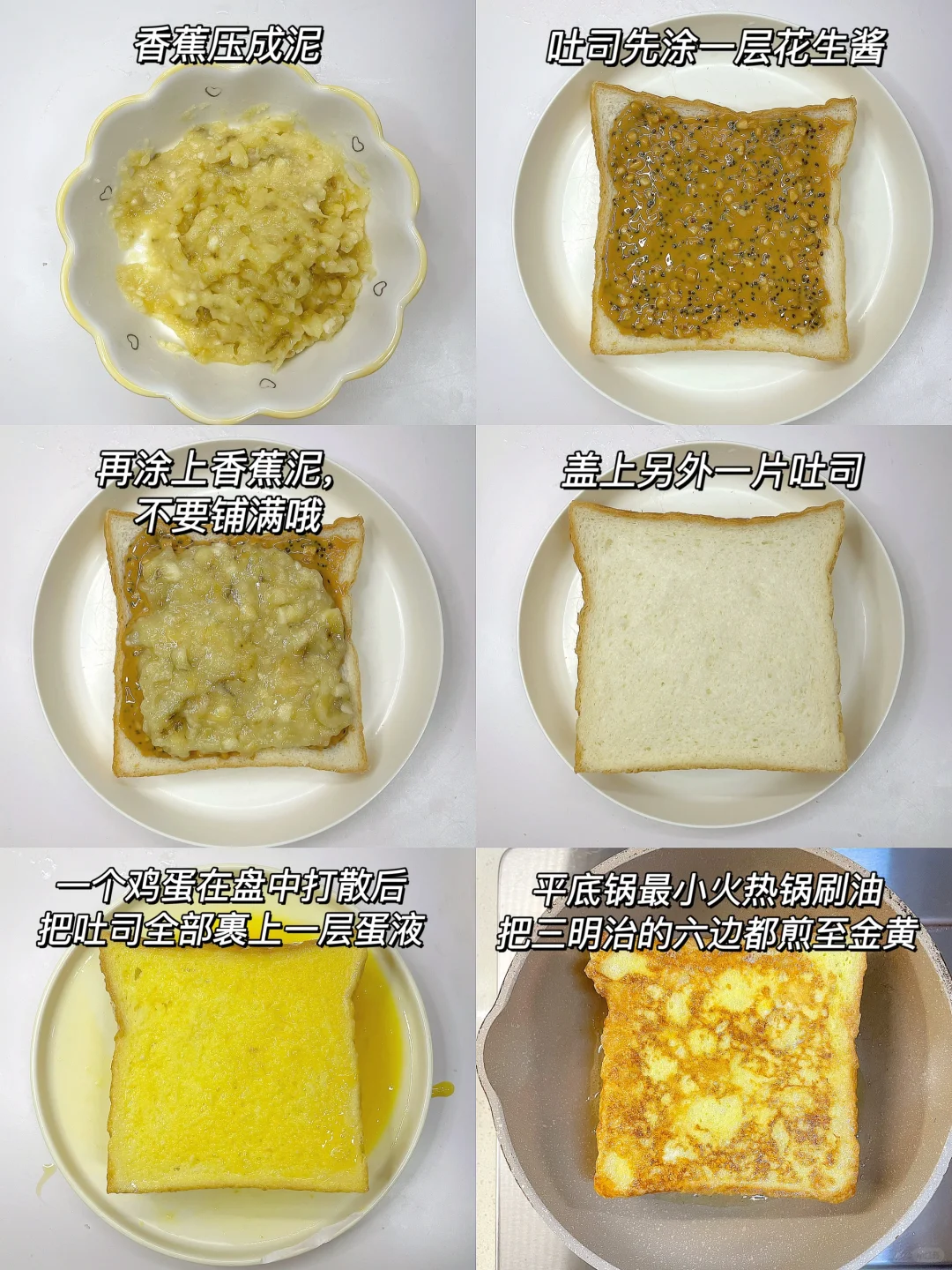 🌈巨好吃的香酥柔软又爆浆的三明治~ 🎈准备食材: 1️⃣吐司两片,香蕉一根,无糖花生酱两勺,鸡蛋一个; 🎈制作步骤: 1️⃣香蕉压成泥,吐司上先涂一层花生酱,再铺上香蕉泥,不要铺满哦,四周留点边; 2️⃣盖上另一片吐司,一个鸡蛋在盘中打散,把组装好吐司裹上一层蛋液; 3️⃣平底锅小火热锅刷油,放入三明治,煎至六面都金黄即可~