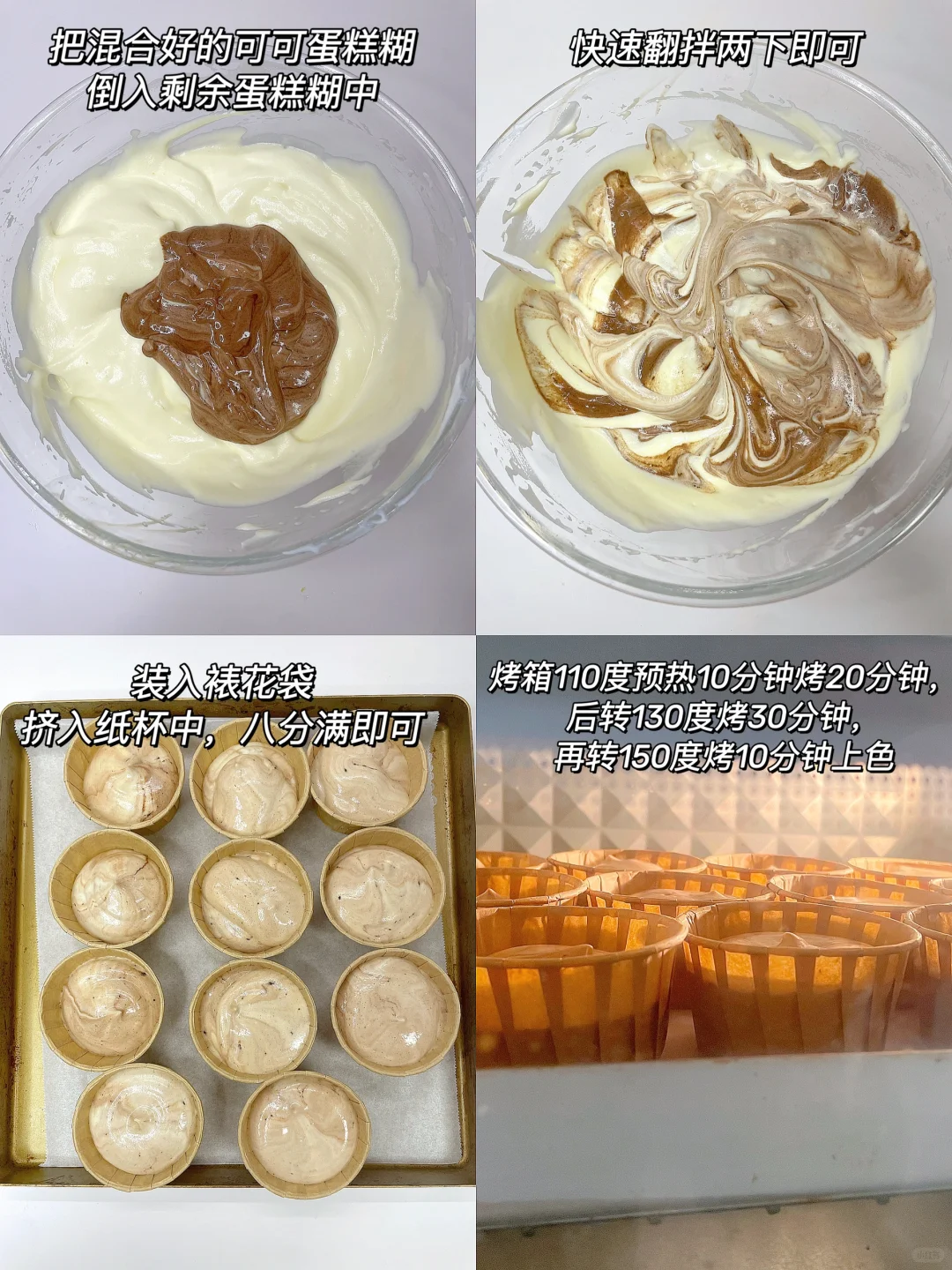 4️⃣取少许蛋糕糊和可可糊混合,然后倒回剩余蛋糕糊中翻拌两三下即可,装入裱花袋,挤入纸杯八分满即可;