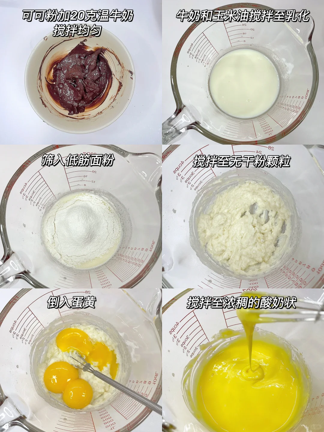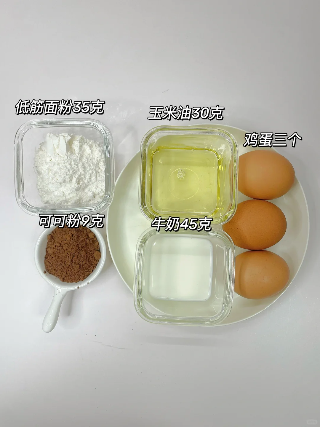 1️⃣鸡蛋三个,玉米油30克,低筋面粉35克,牛奶45克,可可粉9克;