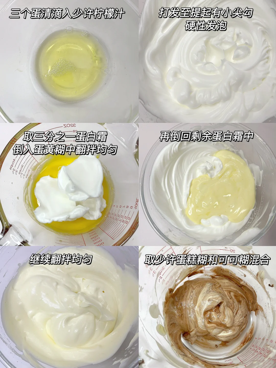 3️⃣蛋清滴入少许柠檬汁,打发至提起有小尖勾(硬性发泡),取三分之一蛋白霜倒入蛋黄糊中翻拌均匀,再倒回剩余蛋白霜中继续翻拌均匀;