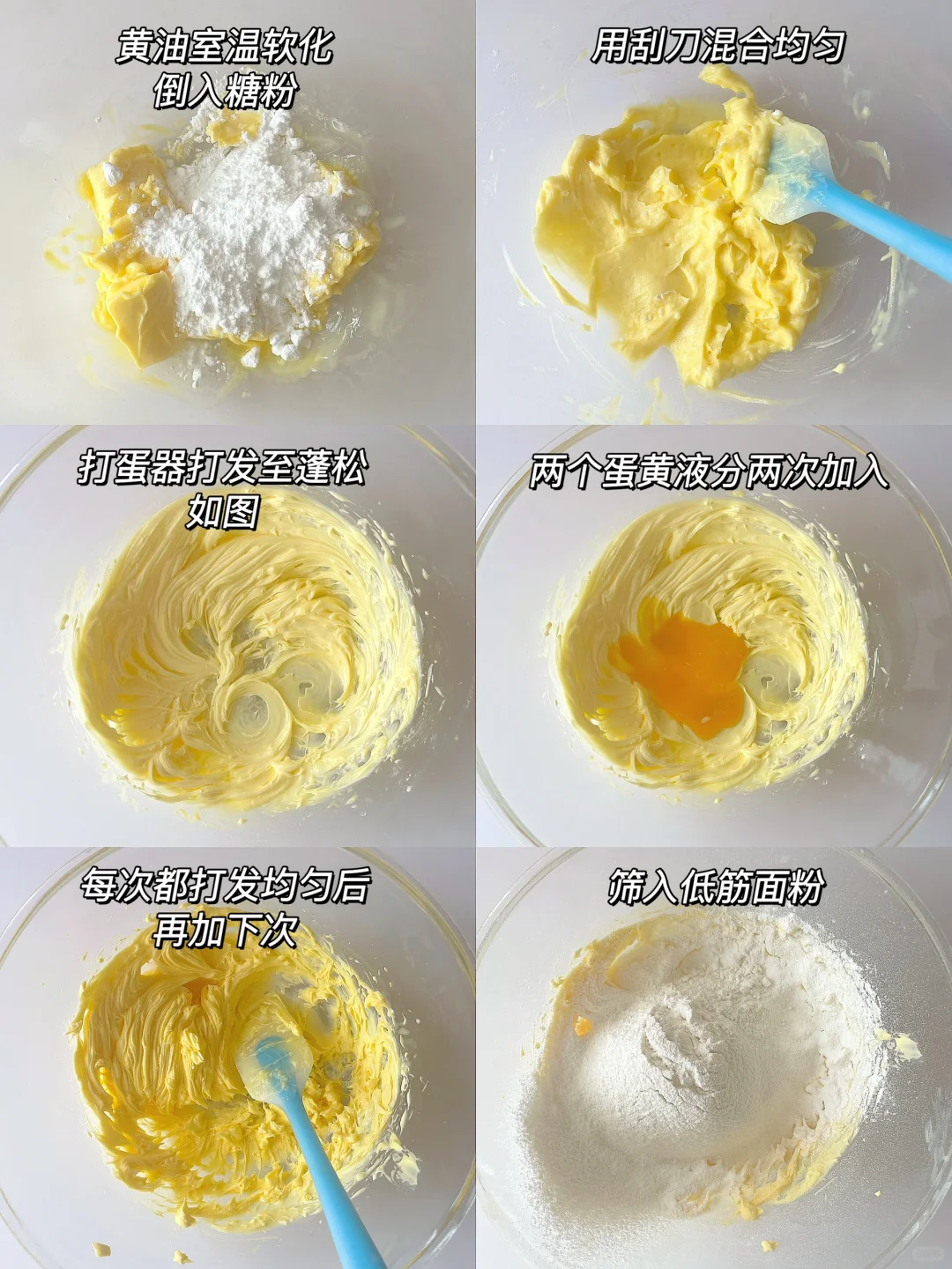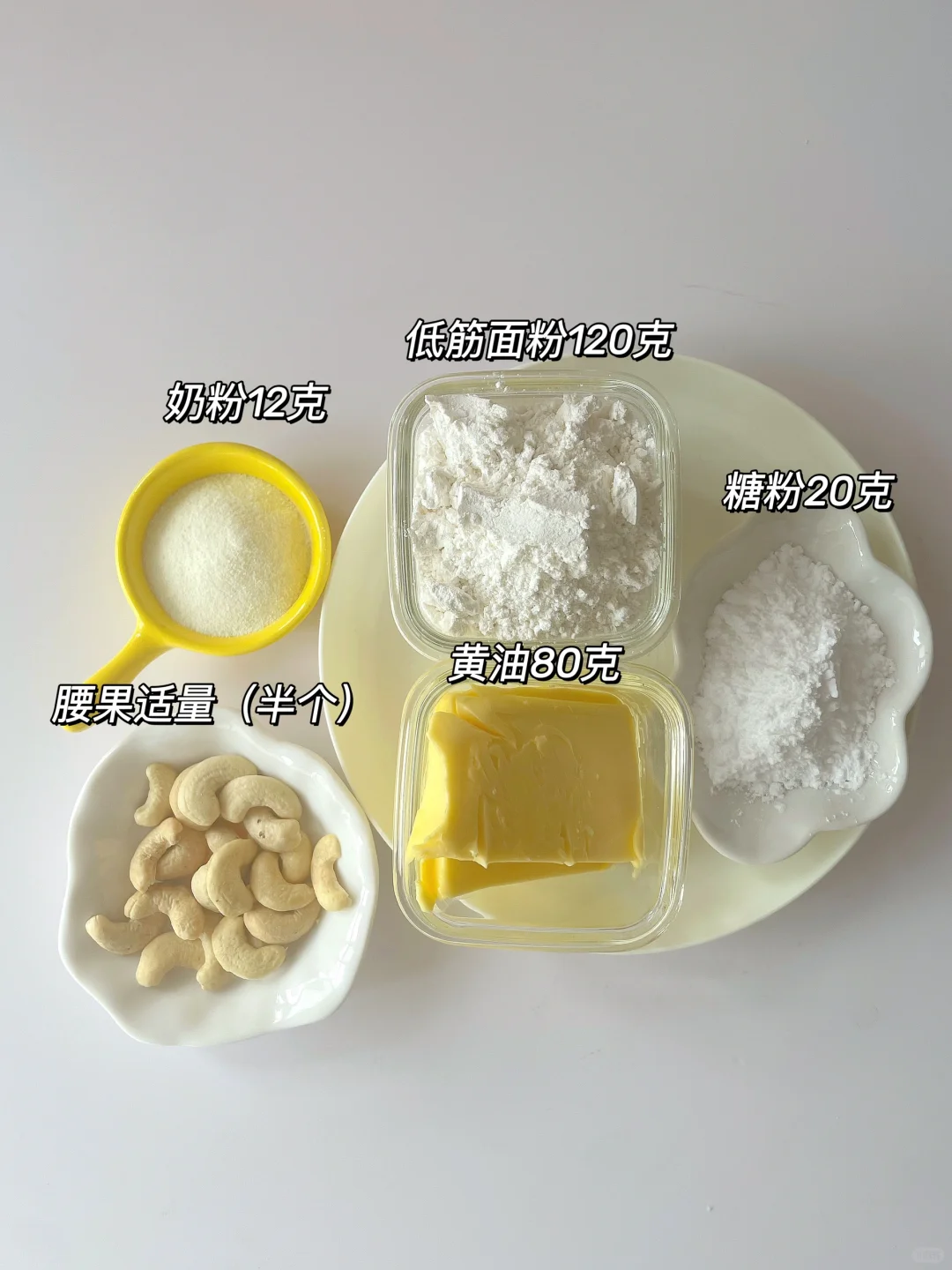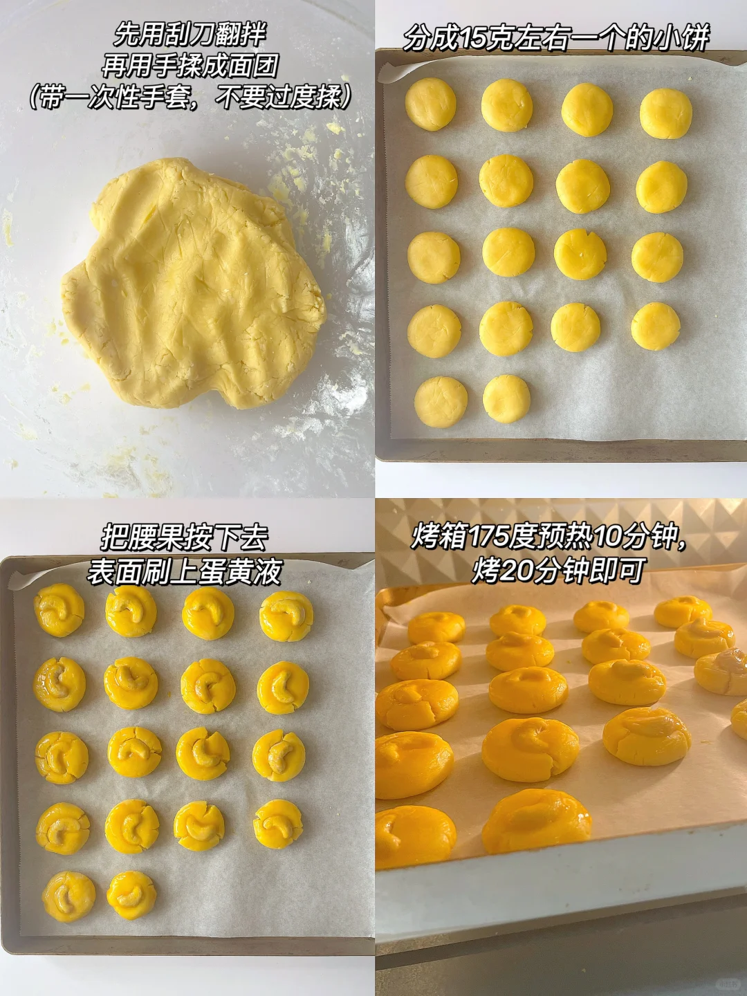 🌈酥到掉渣的小饼干,再搭配浓郁的腰果,美味翻倍~ 🎈准备食材: 1️⃣黄油80克,低筋面粉120克,奶粉12克,糖粉20克,鸡蛋两个,腰果适量(半个); 🎈制作步骤: 1️⃣黄油软化至能轻松按下去,倒入糖粉混合均匀,用打蛋器打发至蓬松(如图); 2️⃣筛入奶粉和低筋面粉,先用刮刀翻拌均匀,再带一次性手套揉匀,揉至无干粉颗粒即可,不要过度揉; 3️⃣把面团分成15克一个的小球,整理成小饼,把半个腰果按在表面,再刷上蛋黄液; 4️⃣烤箱175度预热10分钟,烤20分钟左右即可~