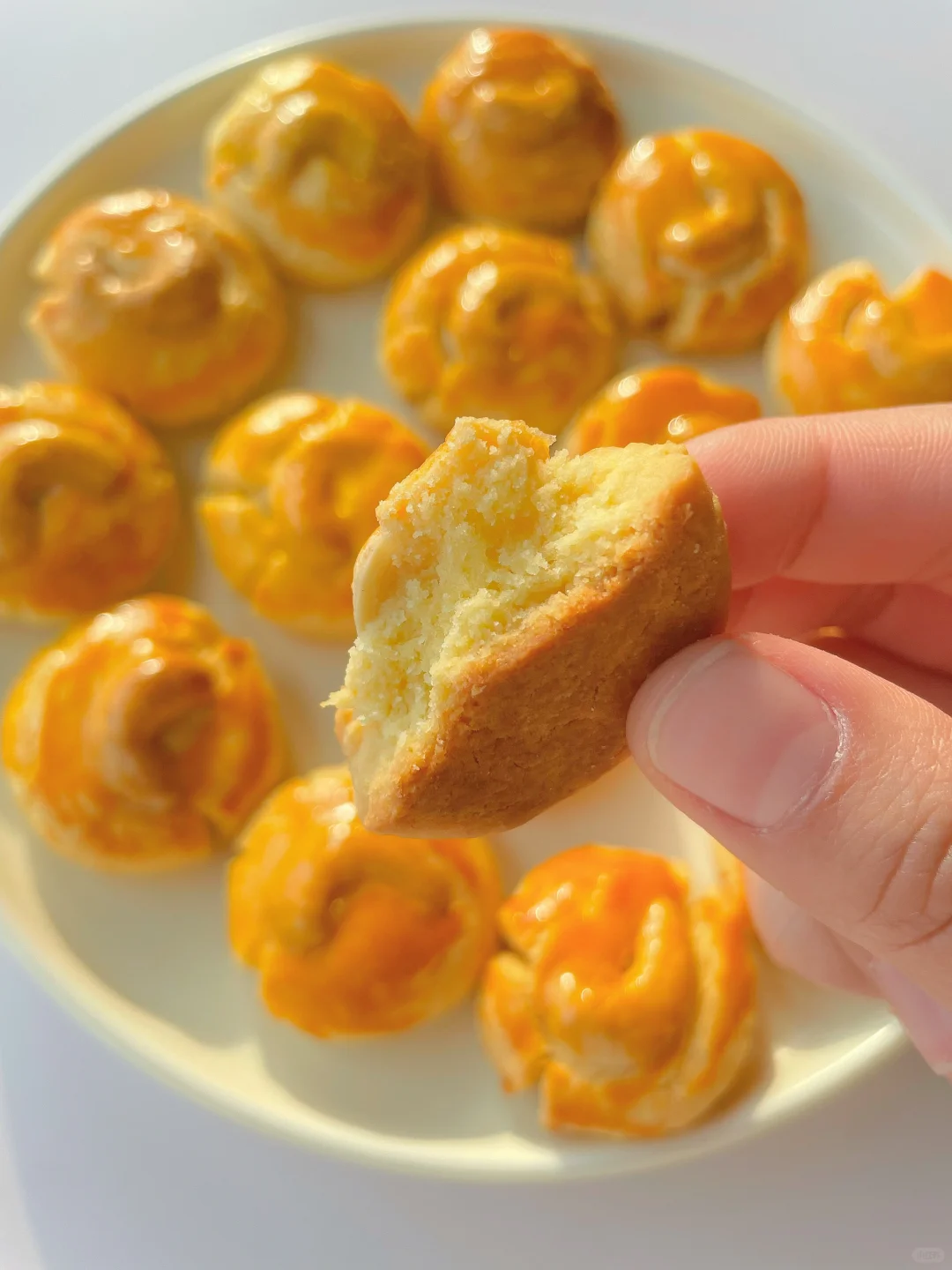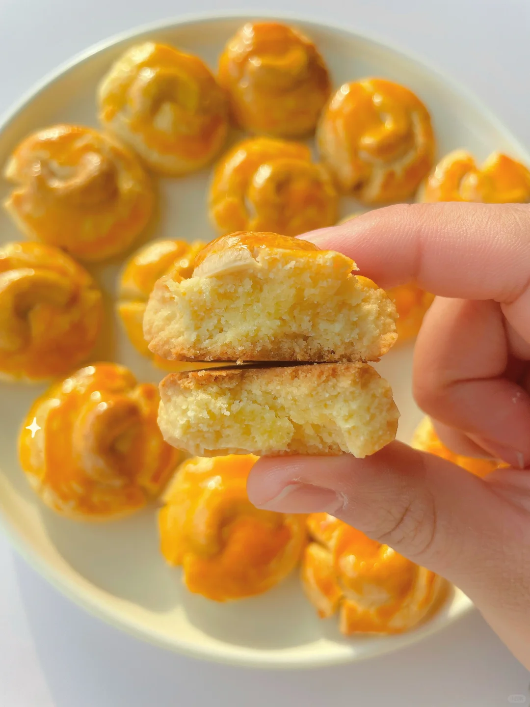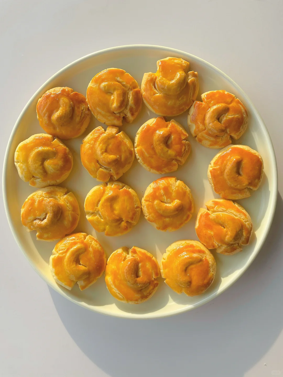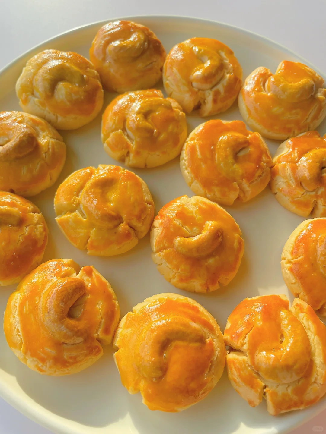 🌈酥到掉渣的小饼干,再搭配浓郁的腰果,美味翻倍~ 🎈准备食材: 1️⃣黄油80克,低筋面粉120克,奶粉12克,糖粉20克,鸡蛋两个,腰果适量(半个); 🎈制作步骤: 1️⃣黄油软化至能轻松按下去,倒入糖粉混合均匀,用打蛋器打发至蓬松(如图); 2️⃣筛入奶粉和低筋面粉,先用刮刀翻拌均匀,再带一次性手套揉匀,揉至无干粉颗粒即可,不要过度揉; 3️⃣把面团分成15克一个的小球,整理成小饼,把半个腰果按在表面,再刷上蛋黄液; 4️⃣烤箱175度预热10分钟,烤20分钟左右即可~