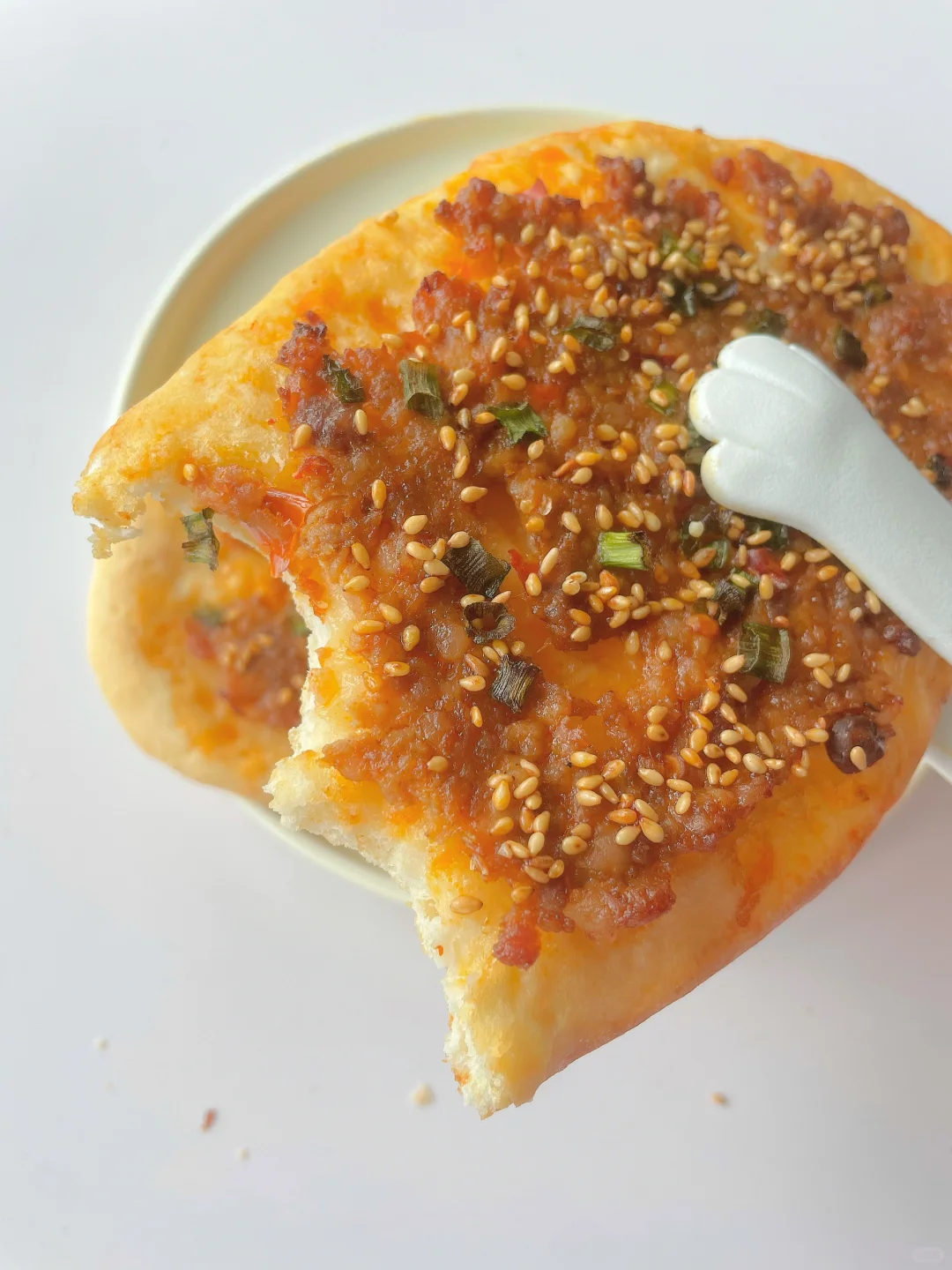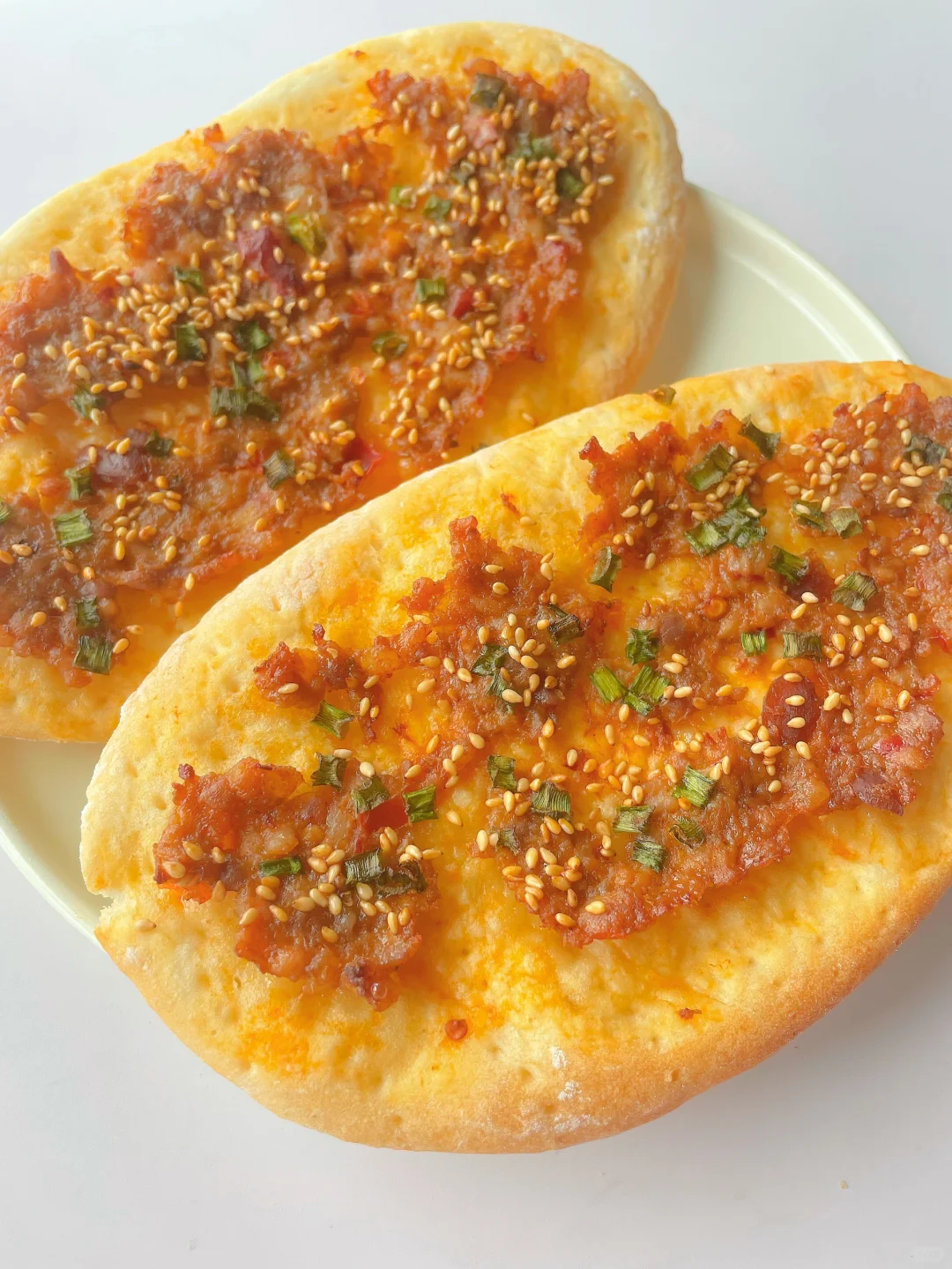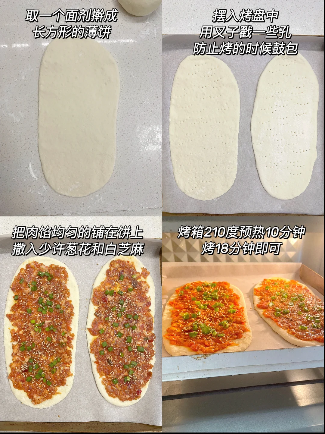 🌈小时候最爱吃的掉渣烧饼~ 🎈准备食材: 🫓烧饼部分: 1️⃣普通面粉300克,酵母3克,温水170克左右,白糖5克; 🥩肉馅部分: 1️⃣猪肉末150克(带2分肥肉),一勺耗油,一勺料酒,半勺孜然粉,少许白胡椒粉,一勺豆瓣酱,葱姜适量,桂皮一小块; 🎈制作步骤: 1️⃣面粉、酵母和白糖倒入碗中混合均匀,再倒入温水搅拌至絮状,用手揉成面团,密封醒发至两倍大,状态参考图片; 2️⃣肉末加调料搅拌均匀(除豆瓣酱和葱姜桂皮),热锅烧油,倒入葱姜和桂皮炸香捞出,倒入豆瓣酱炒香,倒入肉末中拌匀备用; 3️⃣面团醒发好后取出揉面排气,揉光滑后等分成5个面剂,取一个面剂擀成长方形的薄饼; 4️⃣把饼皮放入铺了油纸的烤盘中,用叉子戳一些洞,防止烤的时候鼓包,然后均匀的抹上肉馅,撒入少许葱花和白芝麻; 5️⃣烤箱210度预热10分钟,烤18分钟左右(根据烧饼状态增减时间)。
