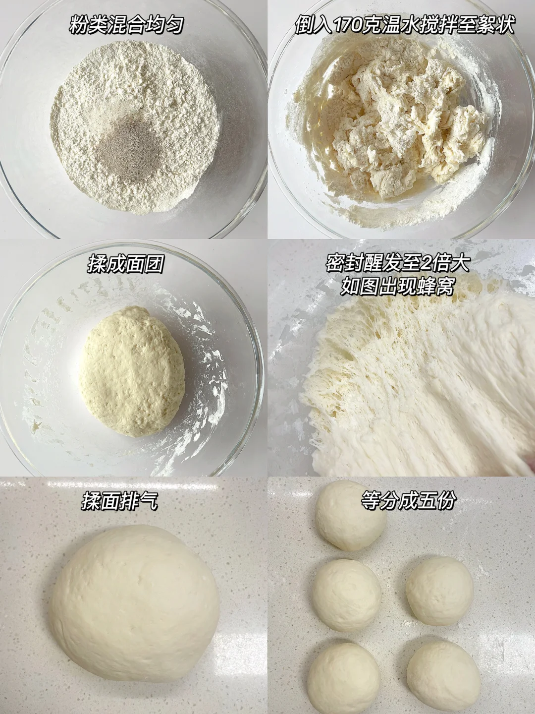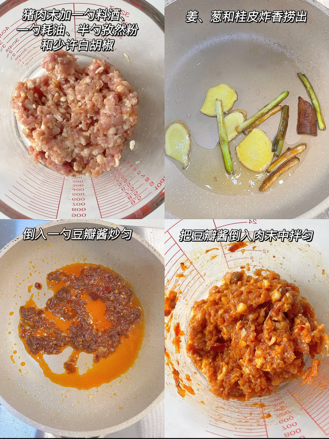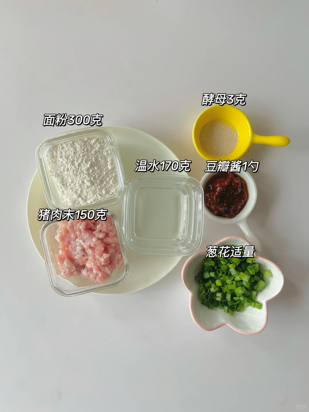 🌈小时候最爱吃的掉渣烧饼~ 🎈准备食材: 🫓烧饼部分: 1️⃣普通面粉300克,酵母3克,温水170克左右,白糖5克; 🥩肉馅部分: 1️⃣猪肉末150克(带2分肥肉),一勺耗油,一勺料酒,半勺孜然粉,少许白胡椒粉,一勺豆瓣酱,葱姜适量,桂皮一小块; 🎈制作步骤: 1️⃣面粉、酵母和白糖倒入碗中混合均匀,再倒入温水搅拌至絮状,用手揉成面团,密封醒发至两倍大,状态参考图片; 2️⃣肉末加调料搅拌均匀(除豆瓣酱和葱姜桂皮),热锅烧油,倒入葱姜和桂皮炸香捞出,倒入豆瓣酱炒香,倒入肉末中拌匀备用; 3️⃣面团醒发好后取出揉面排气,揉光滑后等分成5个面剂,取一个面剂擀成长方形的薄饼; 4️⃣把饼皮放入铺了油纸的烤盘中,用叉子戳一些洞,防止烤的时候鼓包,然后均匀的抹上肉馅,撒入少许葱花和白芝麻; 5️⃣烤箱210度预热10分钟,烤18分钟左右(根据烧饼状态增减时间)。