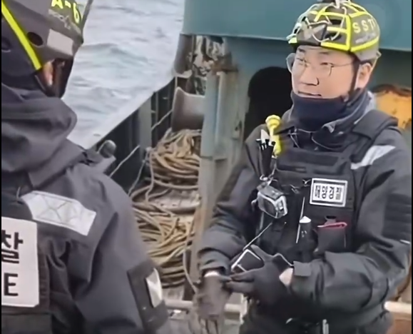 画面中上演的情景极具戏剧效果。当两位韩国海警步入中国渔船之际,他们随即着手检验船内的一切文件与设备。渔民们并未惊慌失措,而是借助手机留存这一环节,旨在捍卫自身的正当权益。然而,在中国海警船现身之后,渔民们的立场出现了彻底逆转,他们内心感到有力量支持,进而更加大胆地接近并拍摄正履行职责的韩国海警。