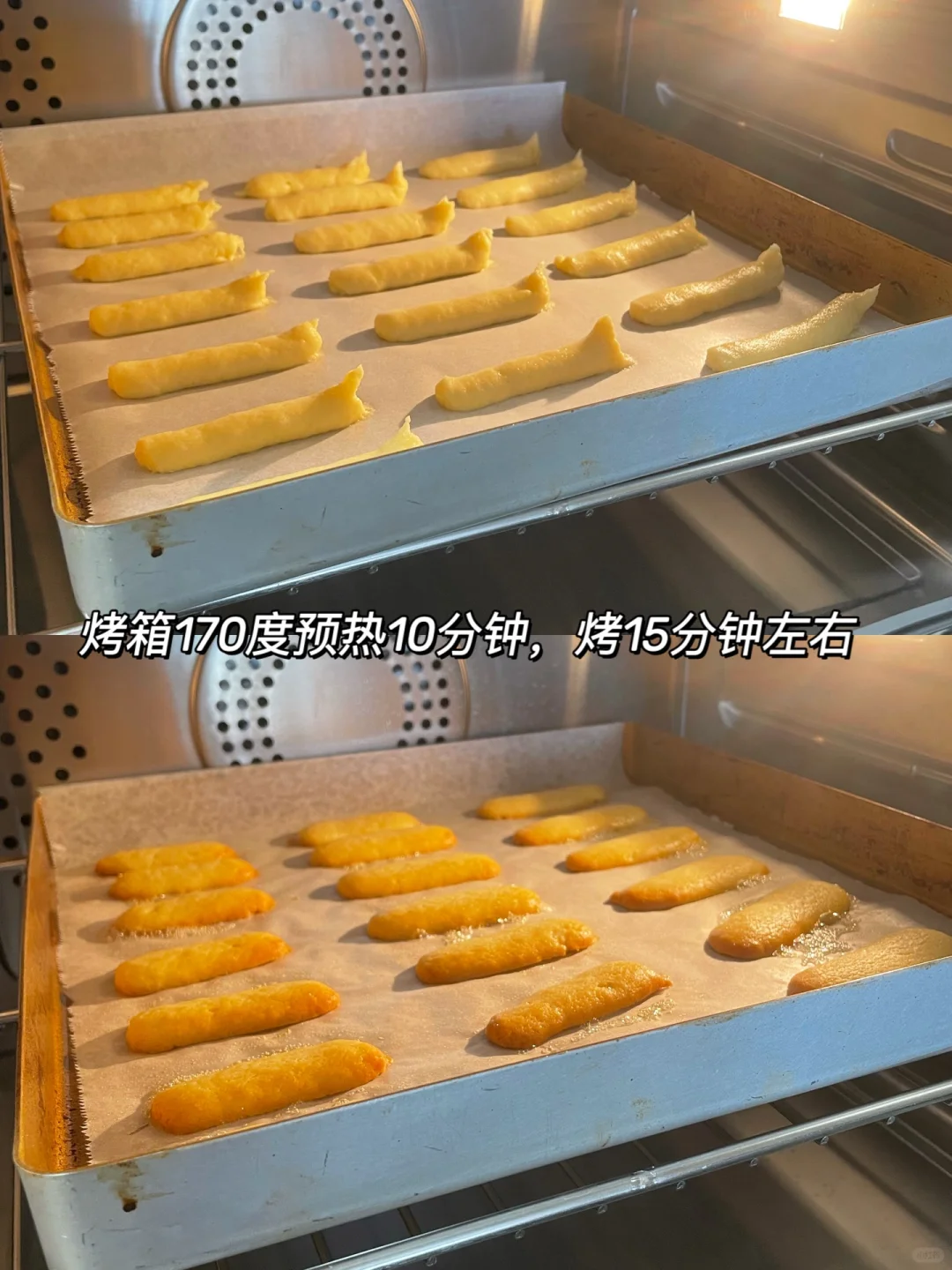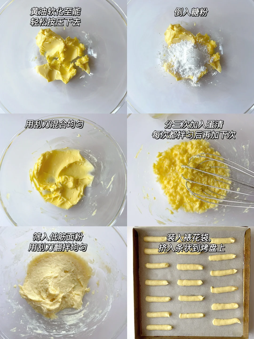 🌈搅一搅,拌一拌就可以做成功的酥脆饼干~ 🎈准备食材: 1️⃣黄油70克,蛋清70克,低筋面粉85克,糖粉20克; 🎈制作步骤: 1️⃣黄油软化至能轻松按压下去,倒入糖粉,用刮刀翻拌均匀; 2️⃣蛋清分三次加入,每次加入都要搅拌均匀后再加下次,最后筛入低筋面粉用刮刀翻拌均匀,装入裱花袋备用; 3️⃣裱花袋剪小口,挤入条状到烤盘上,每条之间留足够的空间,饼干受热后会扁; 4️⃣烤箱170度预热10分钟,烤15分钟左右即可,具体时间根据饼干的上色程度来定。 今天我用的是欧宁蒸烤一体机来烤的饼干,它的功能很多,集蒸、烤、空炸、风干、发酵等为一体,一机多用,可以代替很多家电,给厨房节省空间哦~ 它的性价比很高,如果家里经常蒸菜、烤炸,或者炖汤热菜等真的很合适,而且还自带清洁杀菌的功能,32升的大容量,可以满足一家8人所需哦。