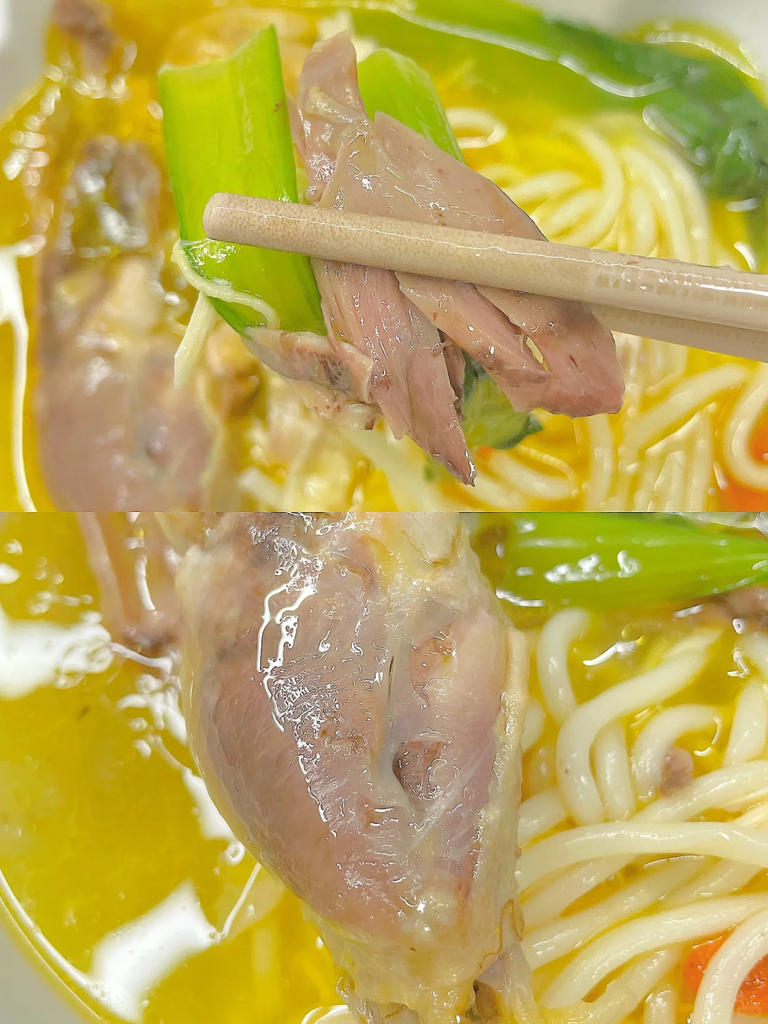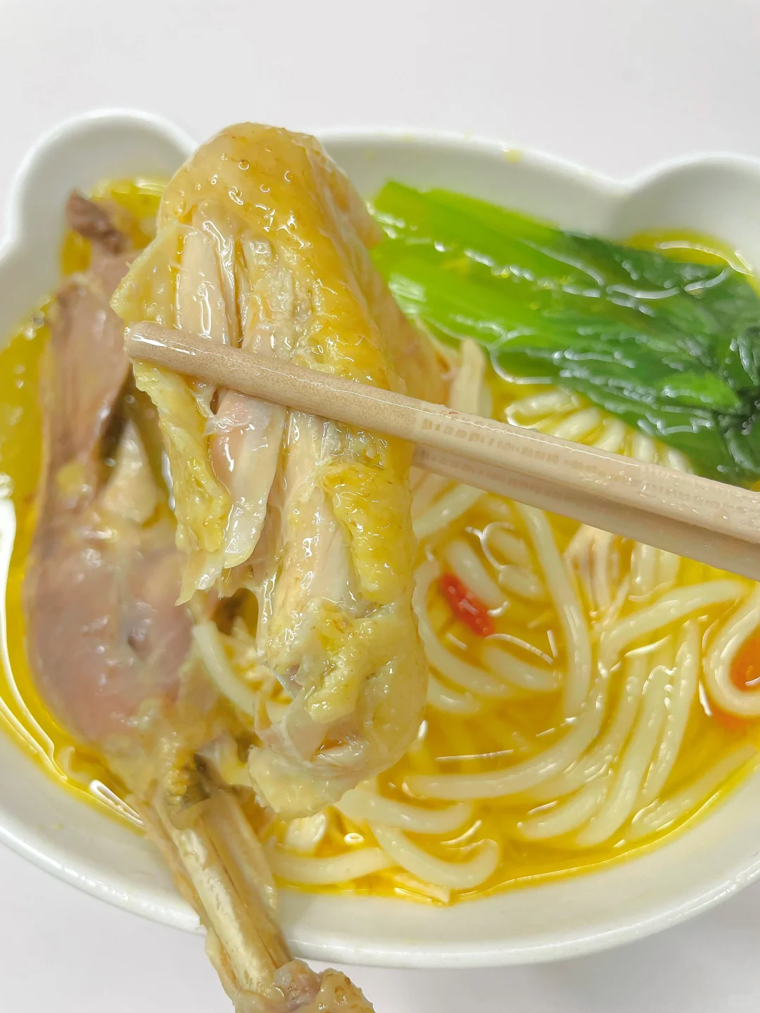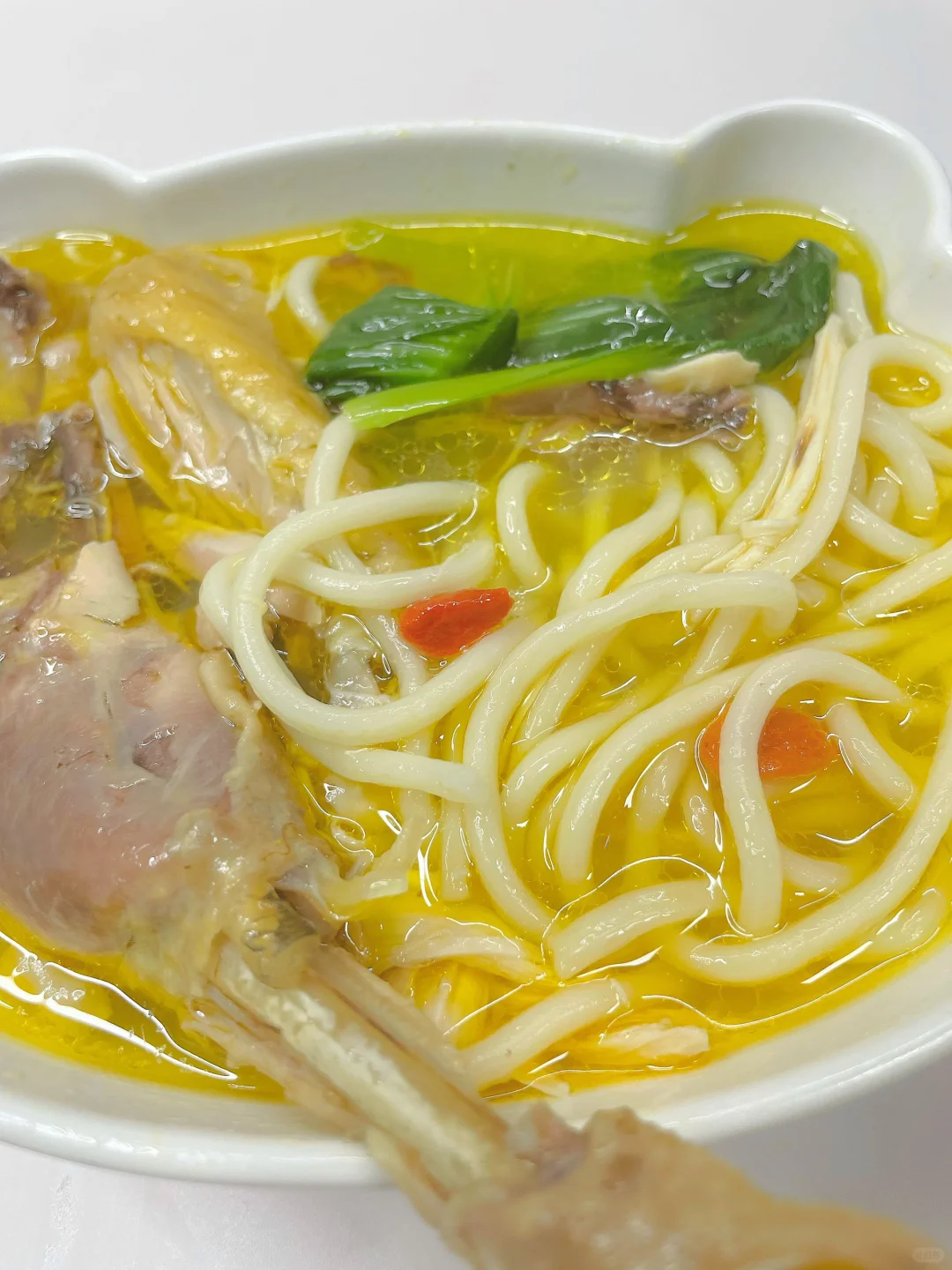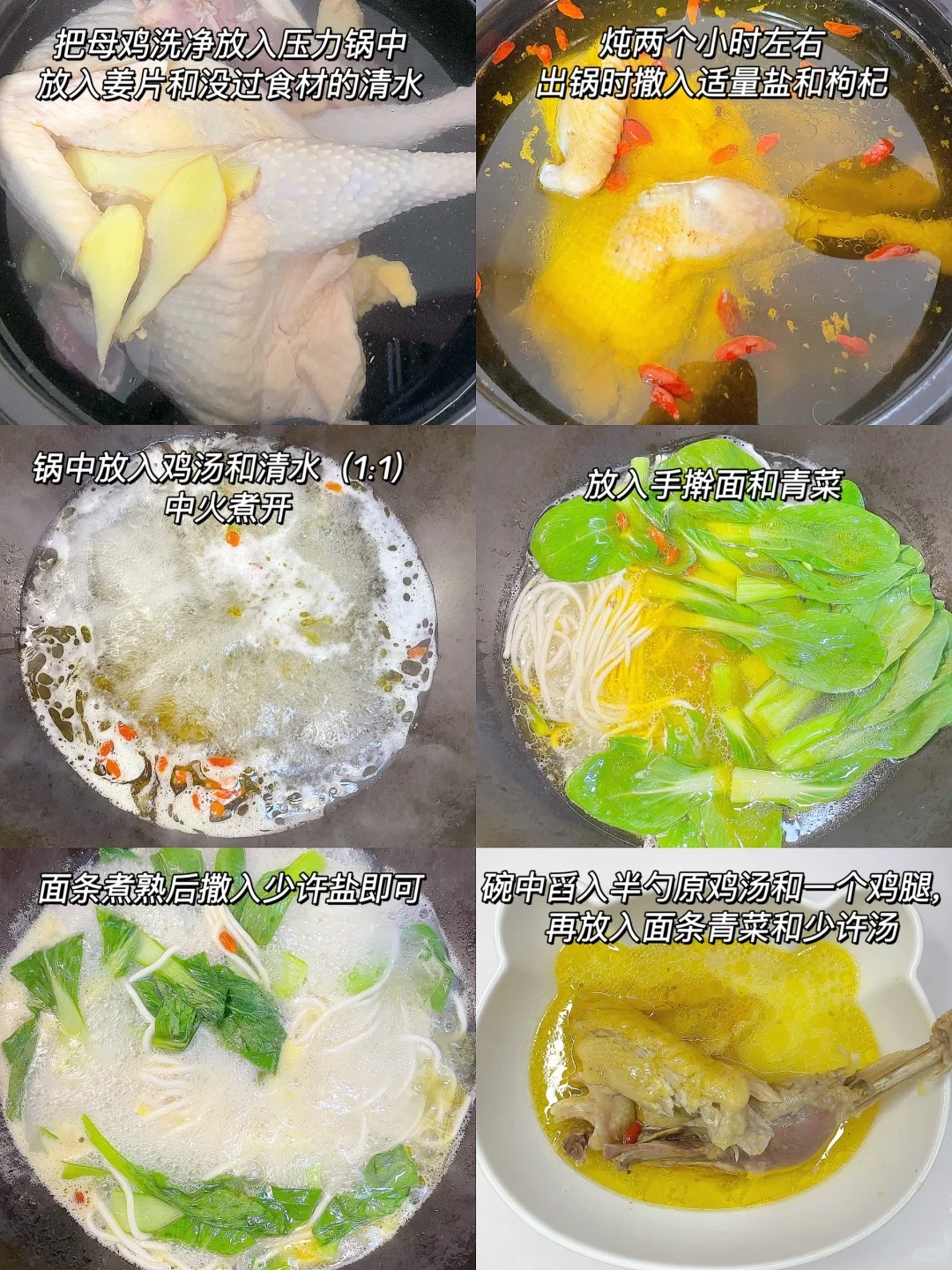 🌈鲜香浓郁的鸡汤,配上手擀面~ 🎈准备食材: 1️⃣老母鸡一只,姜片适量,青菜和手擀面适量; 🎈制作步骤: 1️⃣新鲜的老母鸡处理好洗净,放入电压力锅中,加姜片和没过食材的清水,炖两个小时左右,出锅时加适量盐和枸杞; 2️⃣锅中加入鸡汤和清水(1∶1),中火煮开,放入青菜和手擀面,煮熟后加少许盐即可; 3️⃣碗中放入半勺原鸡汤和鸡腿,再放入面条、青菜和面汤即可。