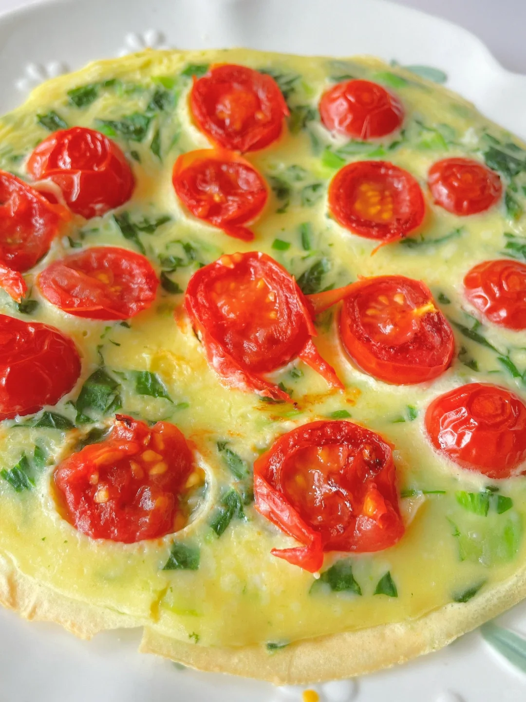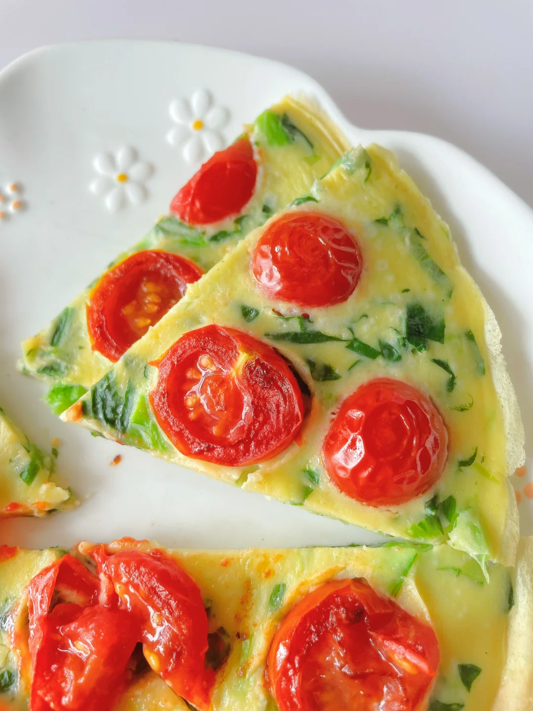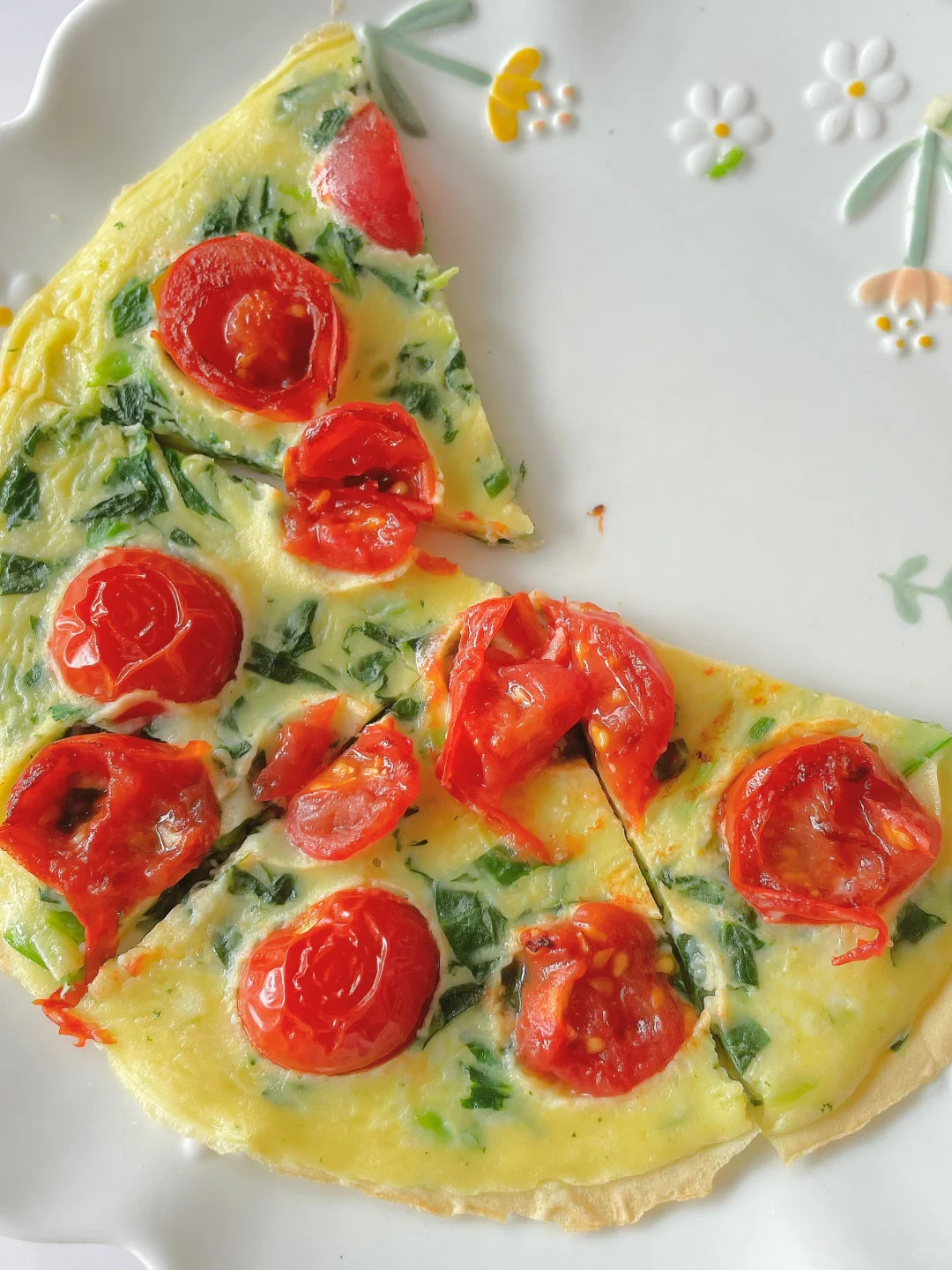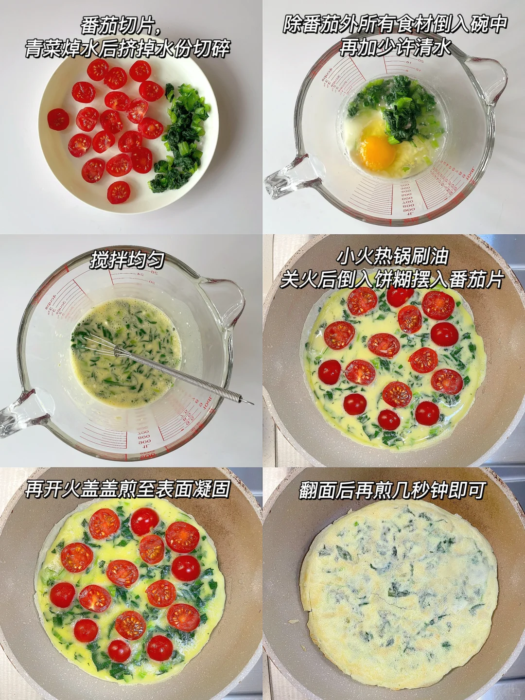 🌈鲜香可口,酸甜开胃的小饼~ 🎈准备食材: 1️⃣小番茄四颗,鸡蛋一个,青菜叶两片,面粉20克,核桃油适量; 🎈制作步骤: 1️⃣小番茄切片,青菜切碎,鸡蛋、面粉、青菜加少许清水搅拌均匀; 2️⃣热锅刷油,放入番茄片,再倒入面糊,煎至两面金黄熟透即可;