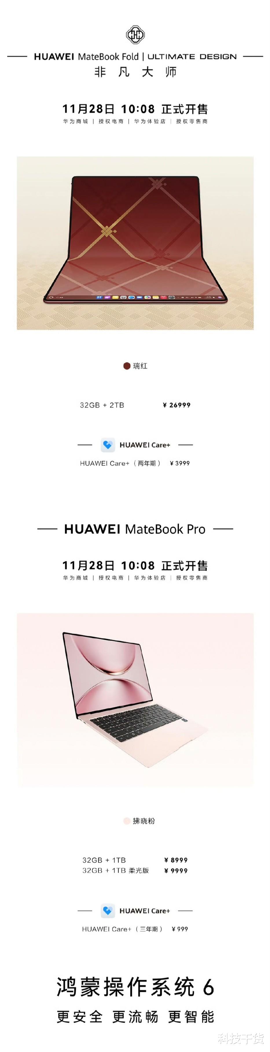 售价方面,全新配色华为MateBook Fold 非凡大师 瑞红32GB / 2TB版售价26999元;华为MateBook Pro 拂晓粉32GB/1TB版本售价为8999元,32GB/1TB柔光版售价9999。