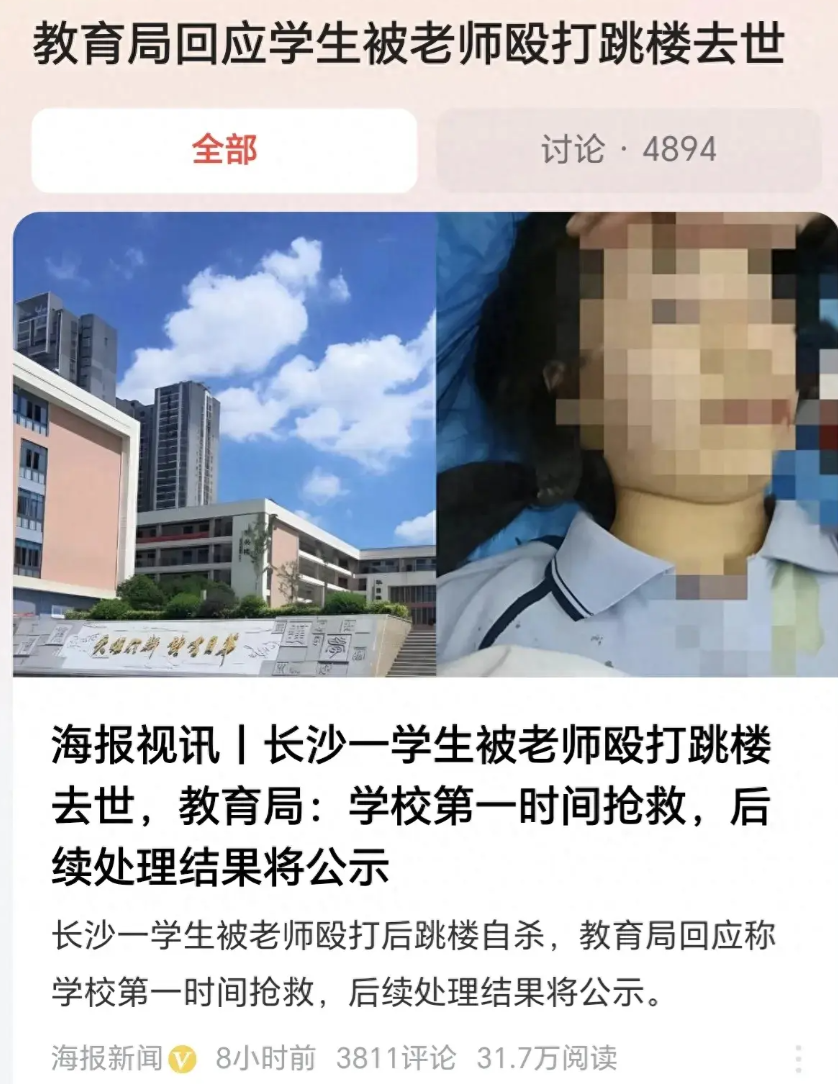 女生被男老师殴打辱骂5分钟后,冲出教室,冲到5楼,翻过栏杆、跳楼。 目前教育局已经回应,第一时间抢救,后续结果将公示。