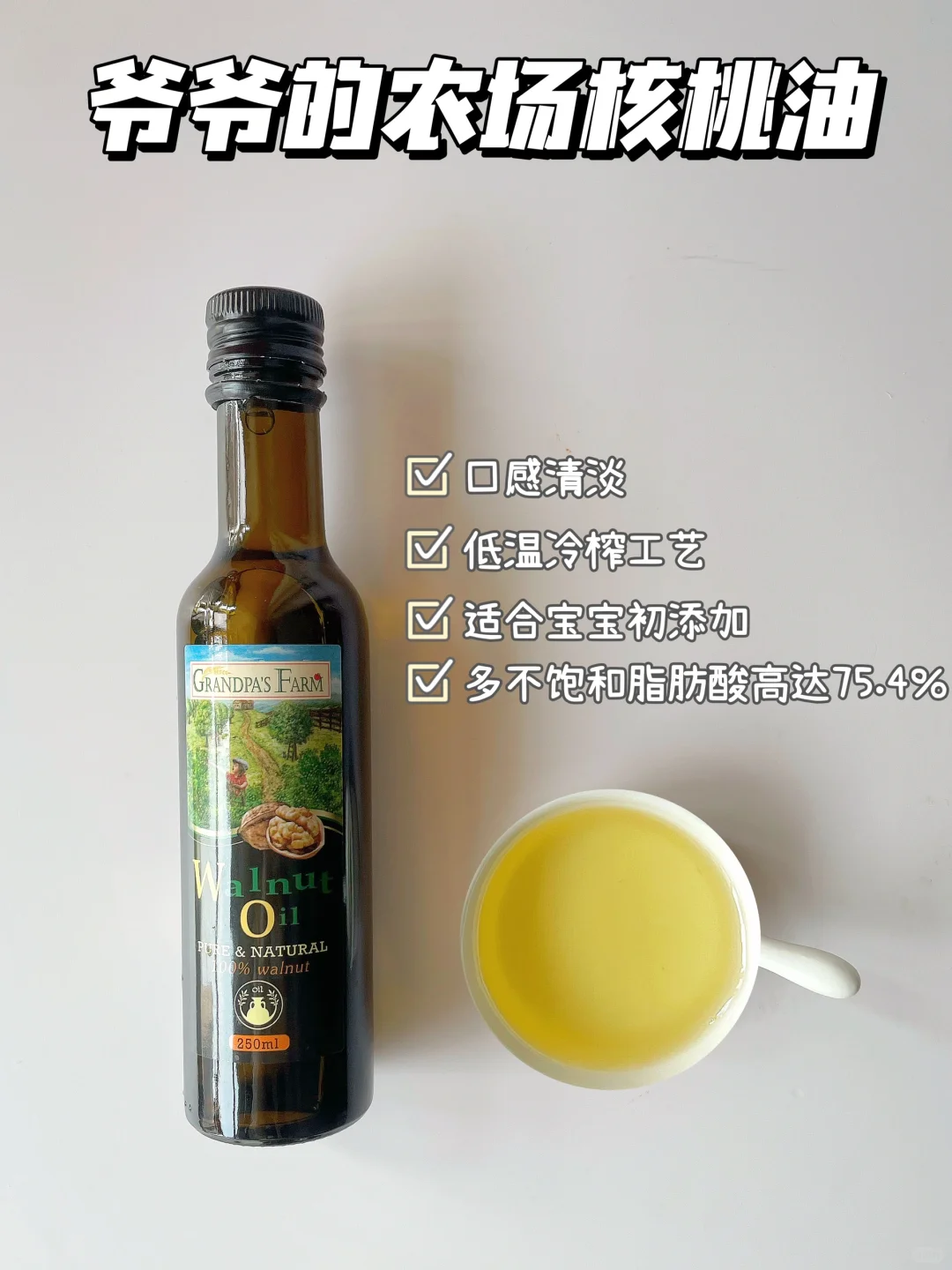 他家的核桃油口感清淡,凉拌和热炒都可以,特别适合宝宝初添加,多不饱和脂肪酸高达75.4%,营养也高。
