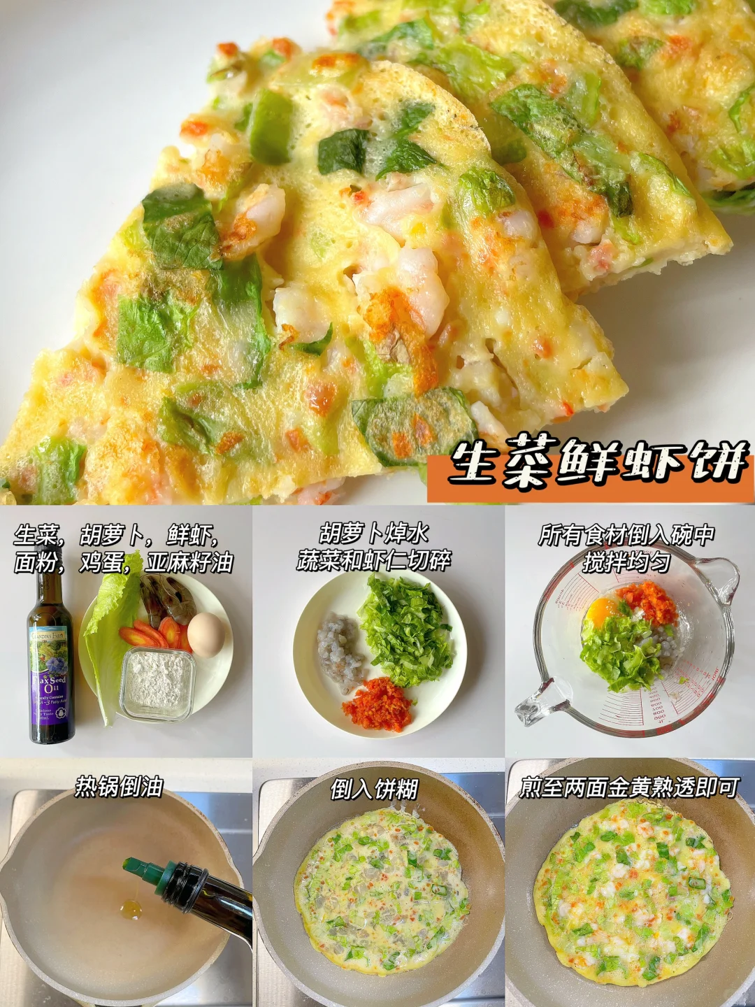 食材:生菜两片,鲜虾四五只,鸡蛋两个,胡萝卜一小块,面粉20克,亚麻籽油适量;