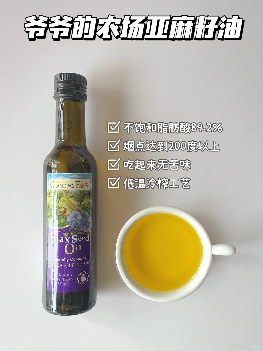 还有亚麻籽油,不饱和脂肪酸89.2%,吃起来没有苦味,烟点达到200度以上,凉拌热炒都可以是不错的选择,可与核桃油交替使用。