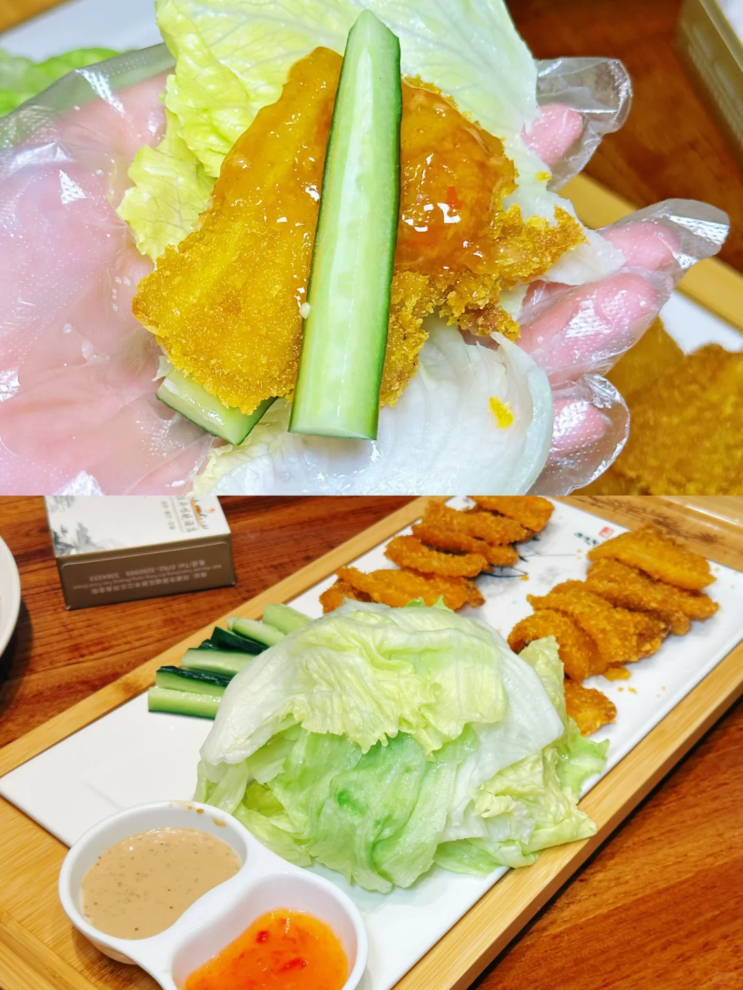 我真的觉得这里的大厨有点🐮,我一个从小都不爱吃肥肉的人,这道菜我竟然连吃了好几块,裹粉炸过的五花肉吃起来一点都不肥,反而香味十足,酥脆可口,而且很有特色,因为它是用生菜🥬包着肉吃的,蘸上酱料口感丰富,很下饭,是一道很不错的创新菜🌟
