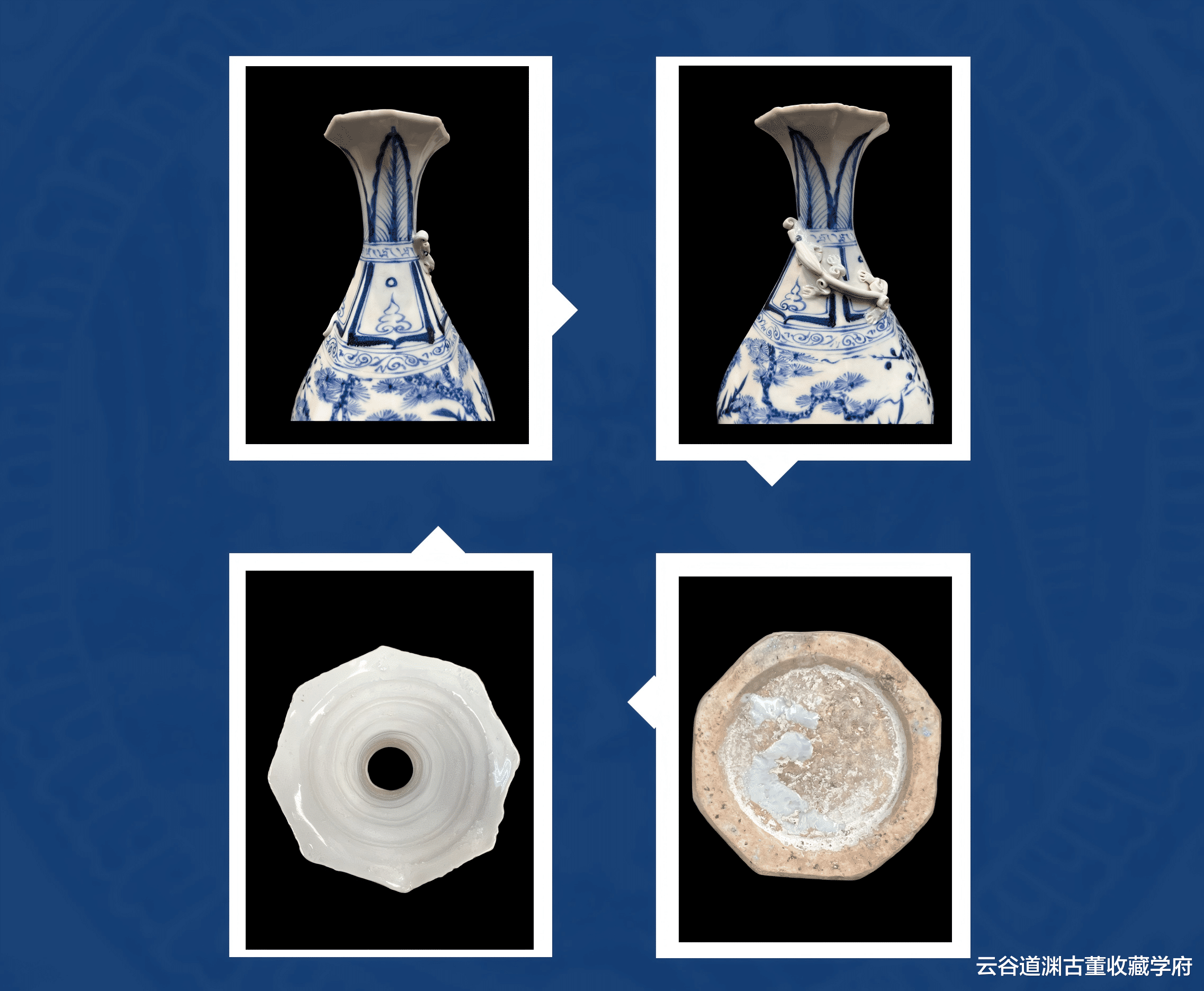 此件元青花松竹梅纹玉壶春瓶,集造型创新、立体装饰与文人题材于一体,是元青花中的珍稀品类。其独特的瓜棱造型、精美的青花纹饰以及深厚的文化内涵,不仅展现了元代瓷器的艺术高度,更反映了当时的社会文化风貌和工艺技术水平。