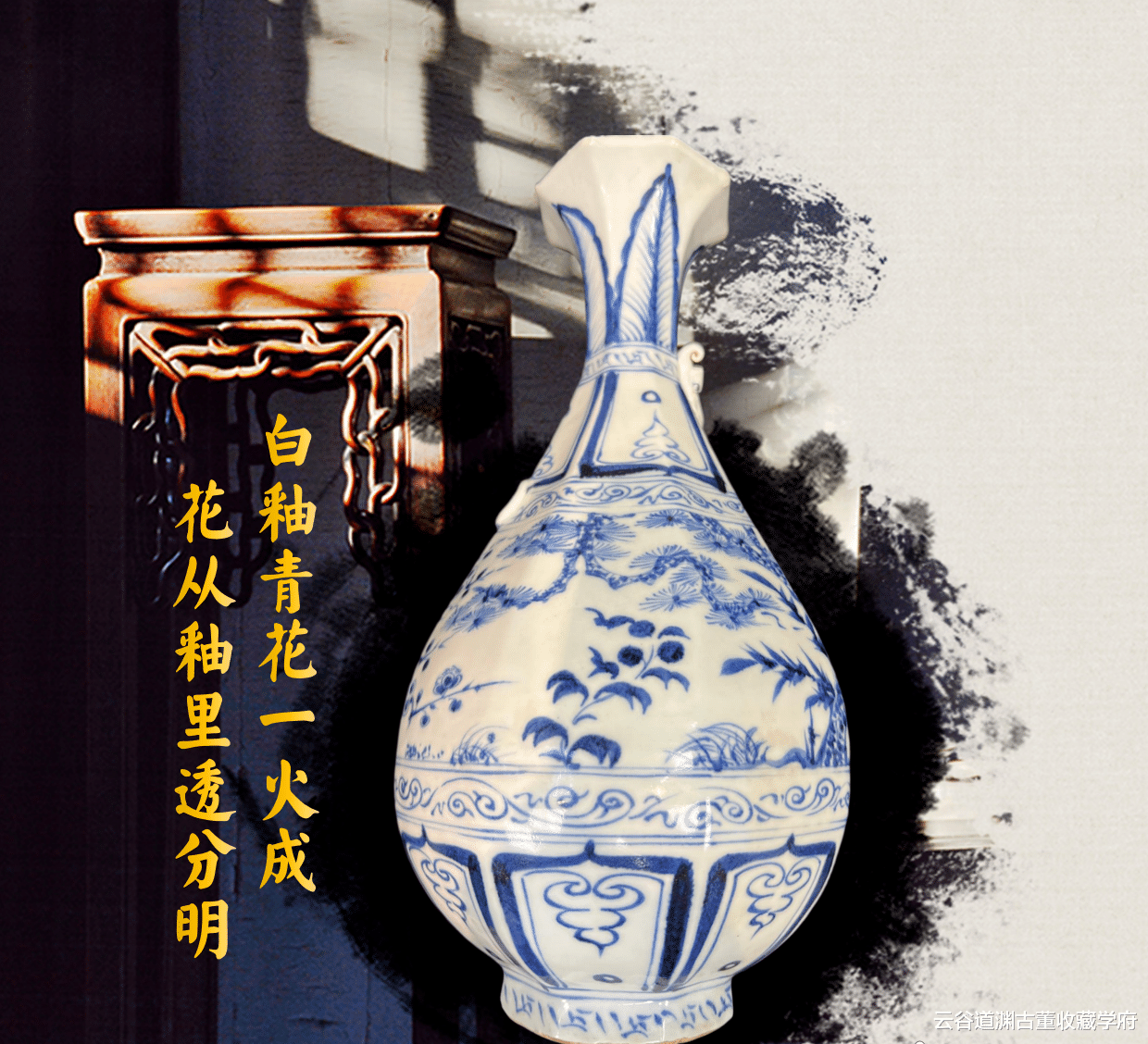 四、文化之蕴:多元交融的时代印记元代是一个多元文化交融的时代,蒙古族的游牧文化与汉族的农耕文化相互碰撞、融合,形成了独特的文化风貌。此件青花松竹梅纹玉壶春瓶便深刻反映了这一时代特征。元青花瓷器以出口中东为主,其造型和纹饰在一定程度上受到中东地区文化的影响。然而,此类文房器或陈设器,可能更多地供元代贵族或文人使用,其题材和审美趣味又体现了汉族传统文化的影响。