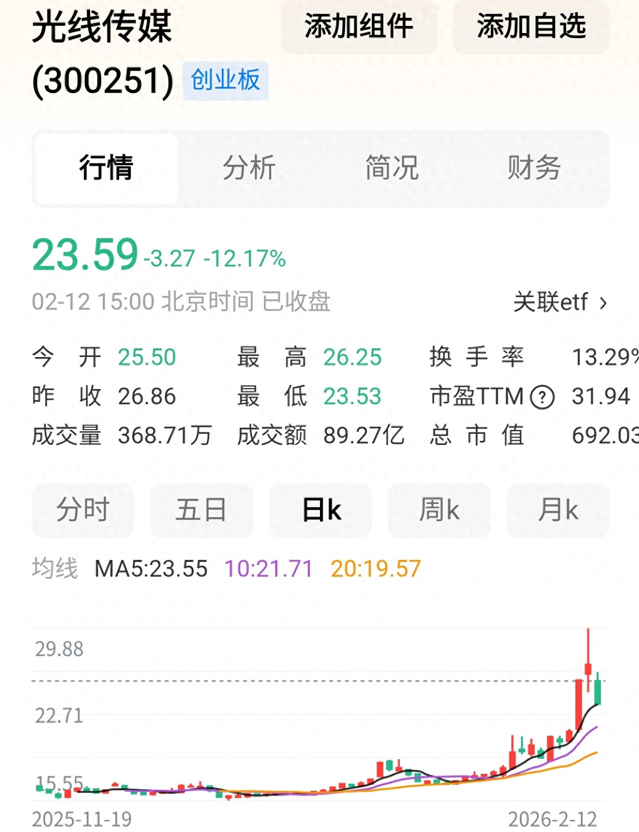 2月12号那天光线传媒股价突然暴跌12%,当天收盘价23.59元,成交额89亿。这已经不是孤立事件了,前一天影视院线板块就跌了5%以上,两天内横店影视博纳影业这些股票全跌停了。春节前大家抢电影票的钱还没到位,资本市场倒先凉了。