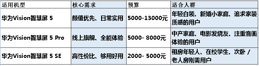 从 2000多元的刚需款到旗舰级的全能款,华为Vision智慧屏 5 系列用三款定位清晰的机型,覆盖了各个用户群体的需求。不管你是追求高性价比,还是看重颜值与社交属性,亦或是想要理想的影院级体验,都能从中找到适合的型号!