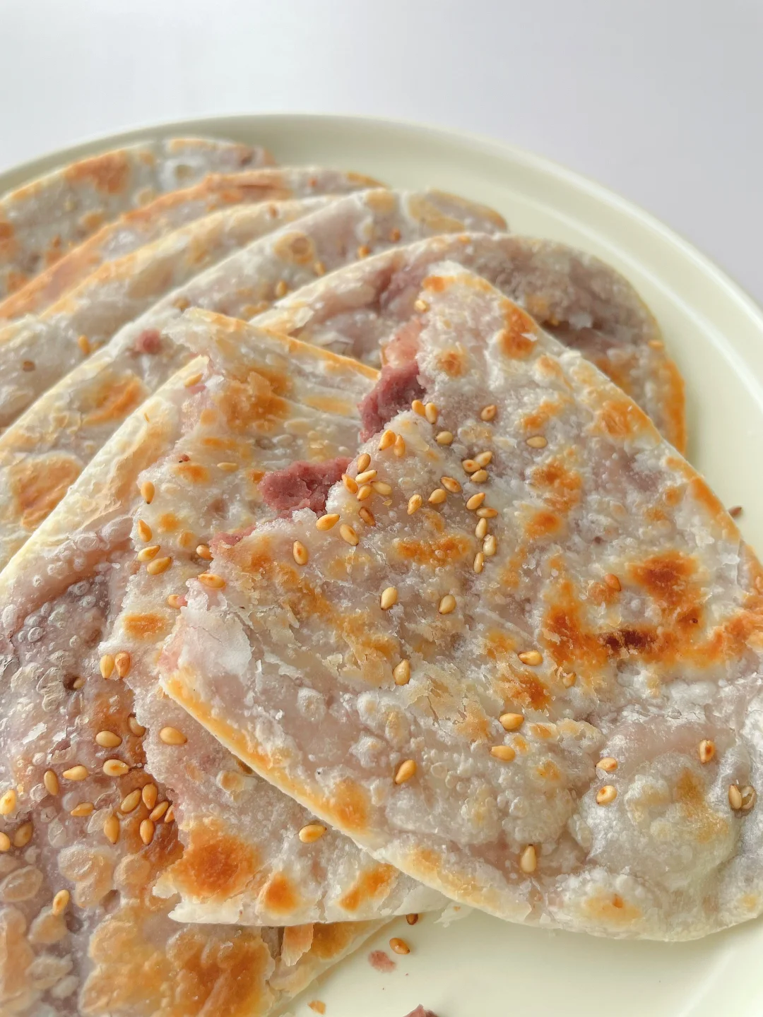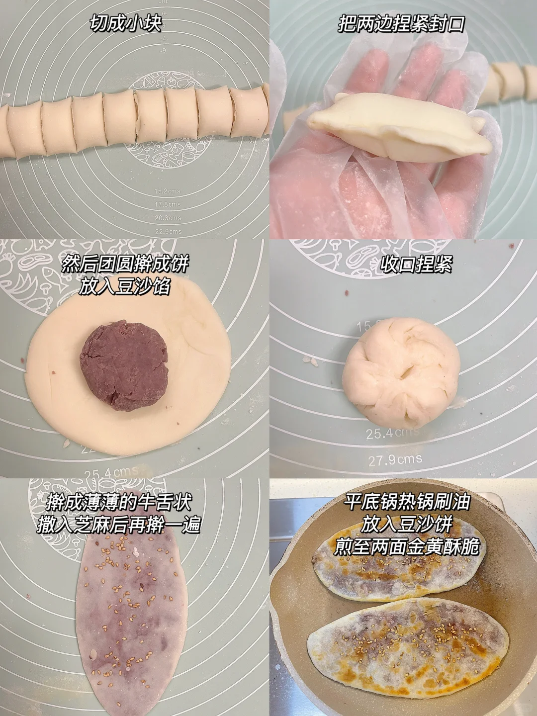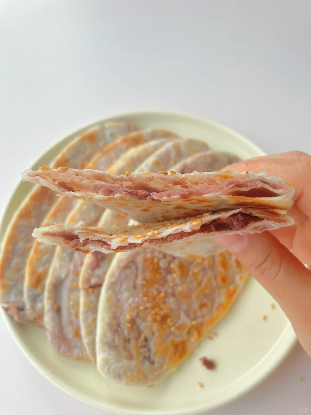 🌈酥脆香甜的豆沙薄饼,宝宝吃了两块~ 🎈准备食材: 1️⃣面粉200克,热水(75度左右)115克左右,玉米油12克,豆沙150克; 2️⃣油酥:面粉20克,玉米油20克; 🎈制作步骤: 1️⃣200克面粉加115克热水,搅拌成絮状,再倒入12克玉米油,揉成光滑的面团,密封醒30分钟; 2️⃣油酥:20克油加热后倒入面粉中,搅拌均匀即可; 3️⃣面团醒好取出,擀成长方形薄饼,均匀的抹上油酥,四周留白,沿着长的一边卷起卷紧,然后切成小块; 4️⃣小面剂两边捏紧,揉圆后擀成饼,放入适量豆沙馅,收口捏紧,擀成牛舌状的薄饼,撒成芝麻后再擀一遍; 5️⃣平底锅热锅刷油,放入小饼煎至两面金黄酥脆即可。