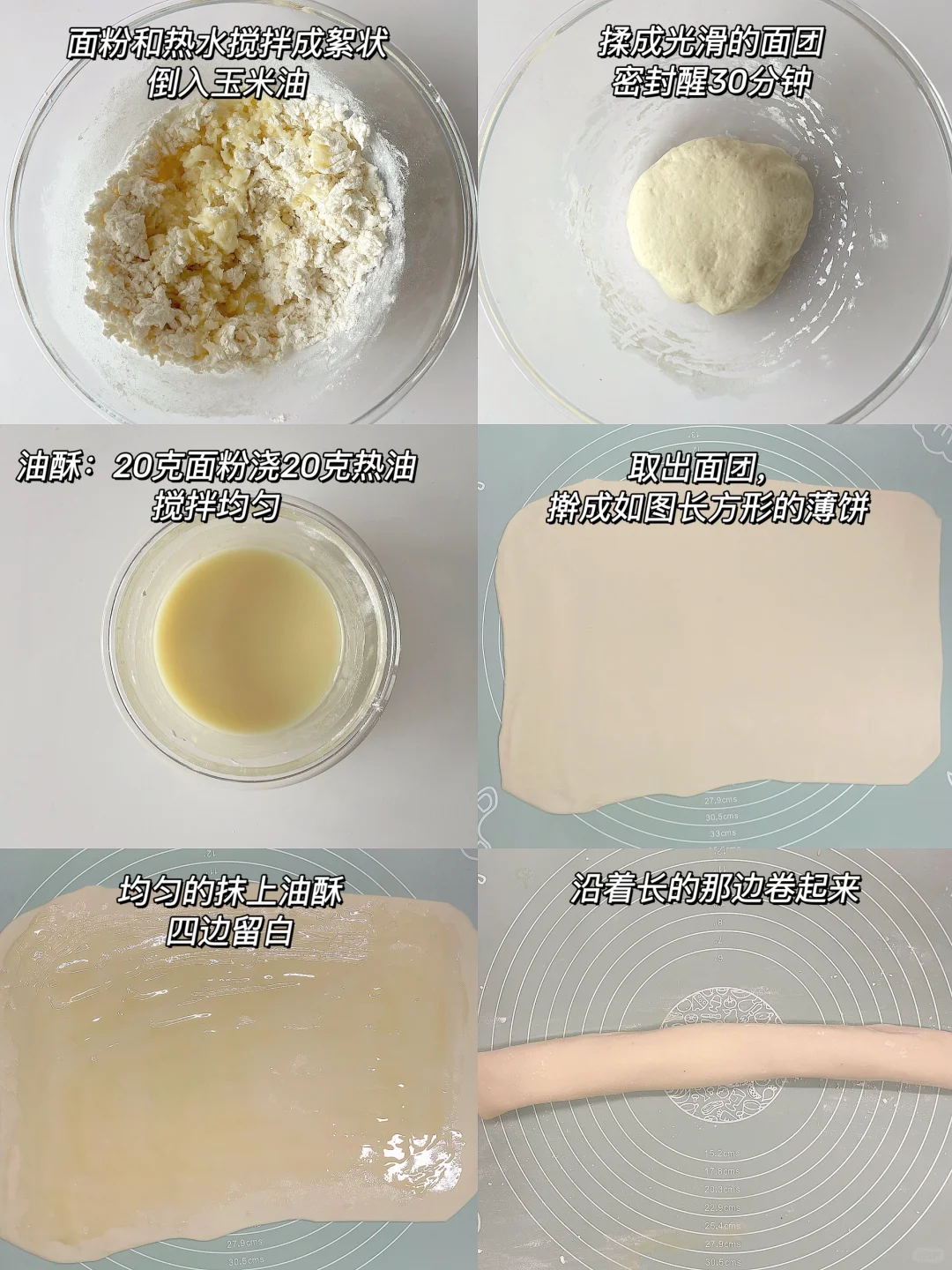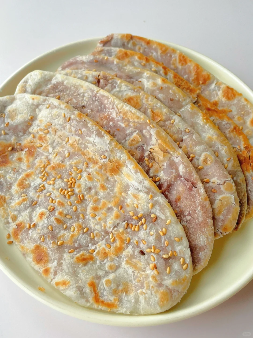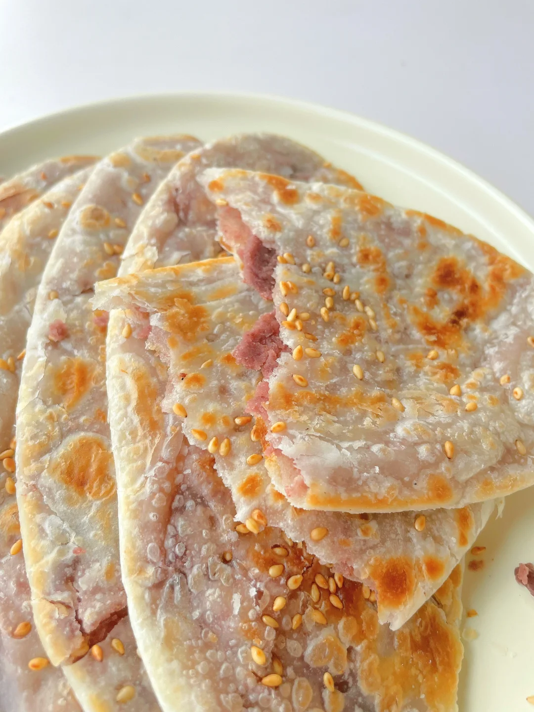 🌈酥脆香甜的豆沙薄饼,宝宝吃了两块~ 🎈准备食材: 1️⃣面粉200克,热水(75度左右)115克左右,玉米油12克,豆沙150克; 2️⃣油酥:面粉20克,玉米油20克; 🎈制作步骤: 1️⃣200克面粉加115克热水,搅拌成絮状,再倒入12克玉米油,揉成光滑的面团,密封醒30分钟; 2️⃣油酥:20克油加热后倒入面粉中,搅拌均匀即可; 3️⃣面团醒好取出,擀成长方形薄饼,均匀的抹上油酥,四周留白,沿着长的一边卷起卷紧,然后切成小块; 4️⃣小面剂两边捏紧,揉圆后擀成饼,放入适量豆沙馅,收口捏紧,擀成牛舌状的薄饼,撒成芝麻后再擀一遍; 5️⃣平底锅热锅刷油,放入小饼煎至两面金黄酥脆即可。