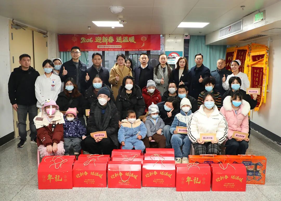 寒冬虽至,温暖同行。在农历新年来临之际,湖南省绿之韵公益基金会携手湖南省民政厅、湖南省慈善总会、民盟长沙市委会、芒果TV、芒果公益平台、芒果V基金等爱心单位共同发起了2026“迎新春 送温暖”关爱湖南省困难地贫家庭公益活动。2月9日上午,长沙市政协副主席、民盟长沙市委会主委刘志红,民盟长沙市委会专职副主委李兰宏,湖南省慈善总会办公室主任、省慈善总会秘书长谭显润,芒果TV宣管中心高级副总监、芒果公益平台负责人刘慧,湖南省政协委员、绿之韵集团总裁、绿之韵公益基金会理事长劳嘉,浏阳市政协委员、绿之韵公益基金会秘书长蒋文带领爱心志愿者先后来到中南大学湘雅医院、湖南省人民医院,为正在接受治疗或定期复查的地中海贫血患儿及其家庭送来爱心慰问金和新春物资。活动还为全省地贫患儿家庭准备了100份新春大礼包,正陆续发出,将节日温暖送达更多家庭。