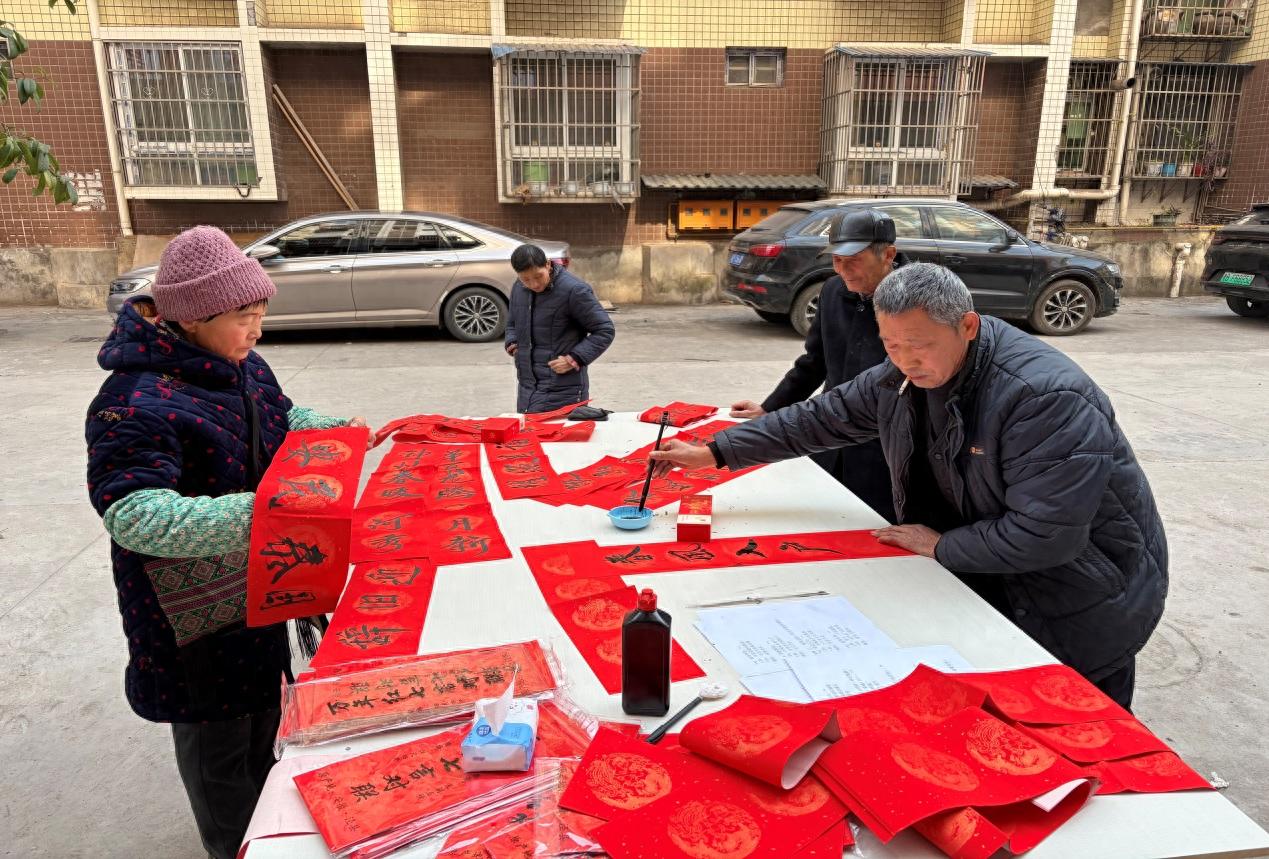 下午三时,春联书写区人气高涨。社区书法爱好者挥毫泼墨,将“春回大地福满门”“邻里和睦万事兴”等吉祥话语凝于笔端,将新春祝福送到居民手中。红纸黑字间,墨香氤氲出浓浓年味。
