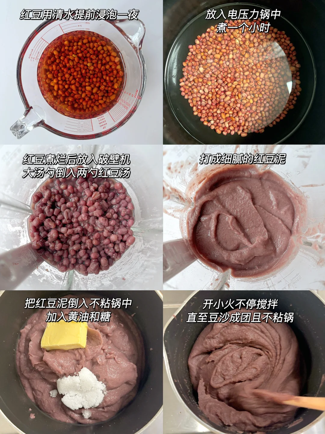 🎈准备食材: 1️⃣红豆200克,黄油40克,白糖20克; 🎈准备食材: 1️⃣红豆提前一晚浸泡,豆子泡大后倒入电压力锅中,放入没过豆子的清水,煮一个小时; 2️⃣红豆煮烂后捞出,放入破壁机中,倒入两大勺红豆汤,打成细腻的红豆泥; 3️⃣把红豆泥倒入不粘锅中,放入黄油和白糖,开小火煮,期间要不停搅拌,炒至豆沙报团且不粘锅即可。