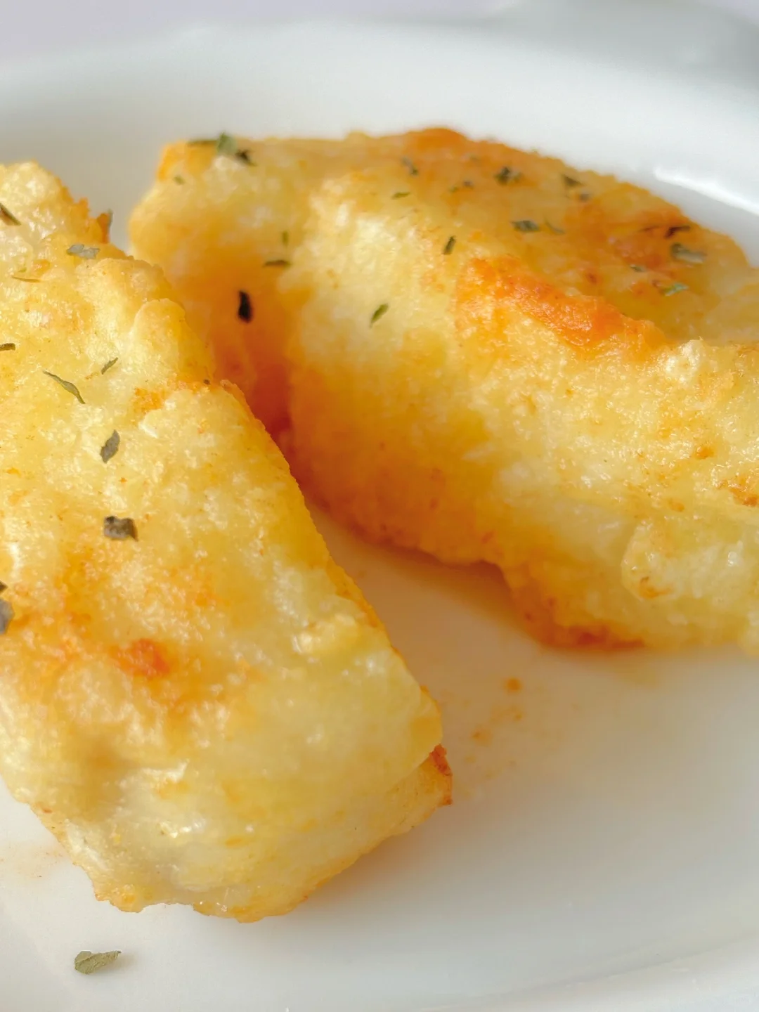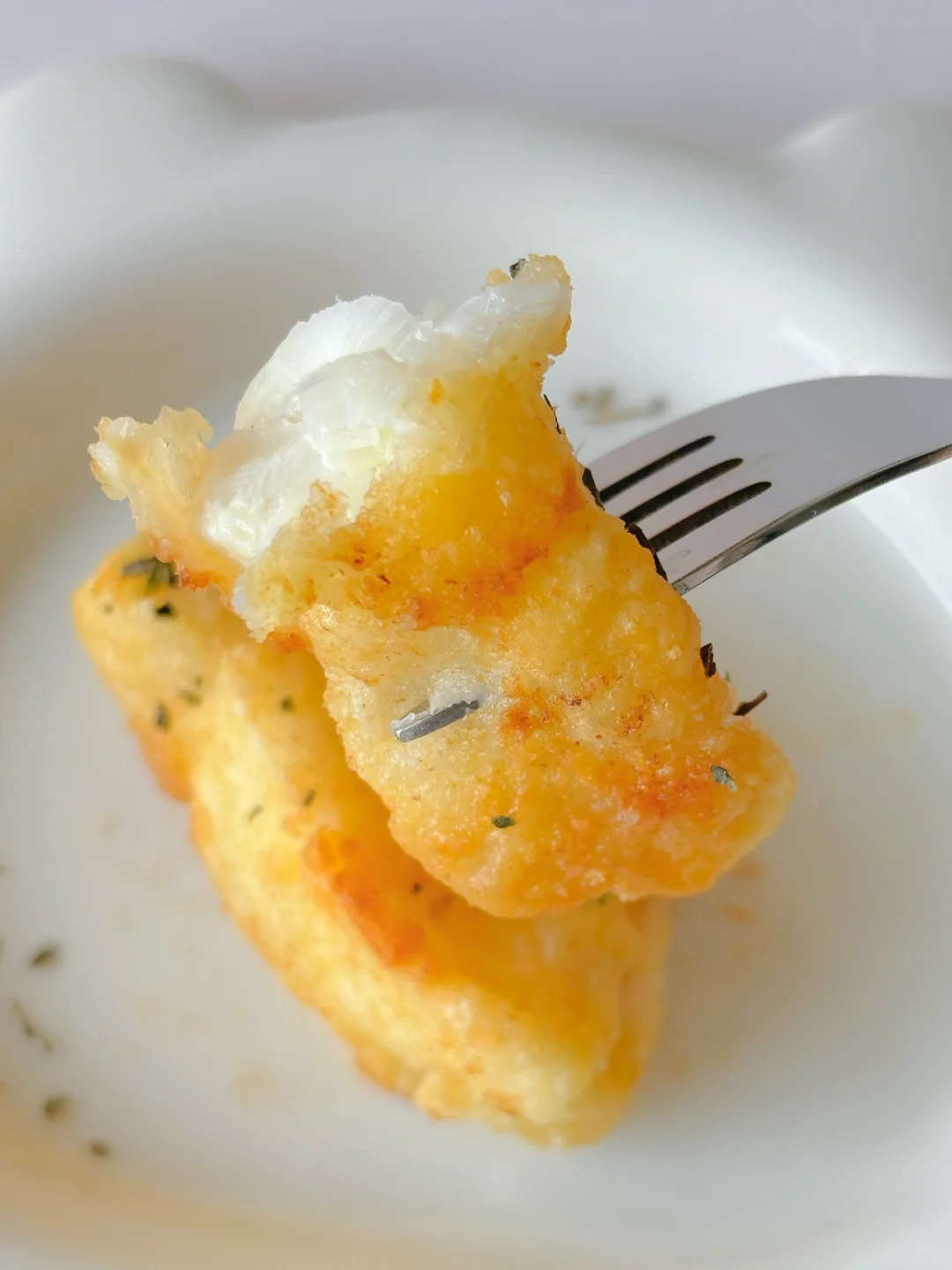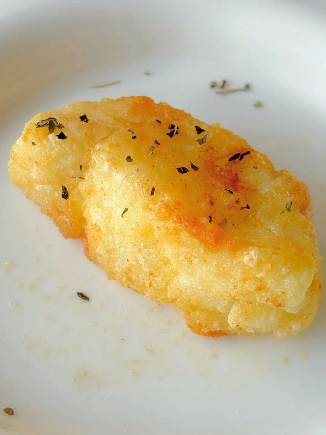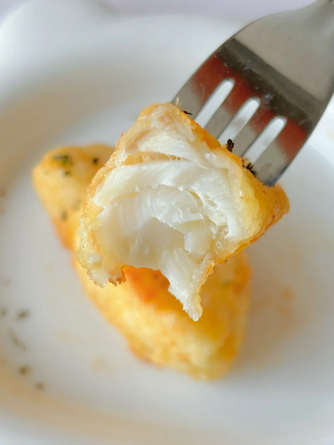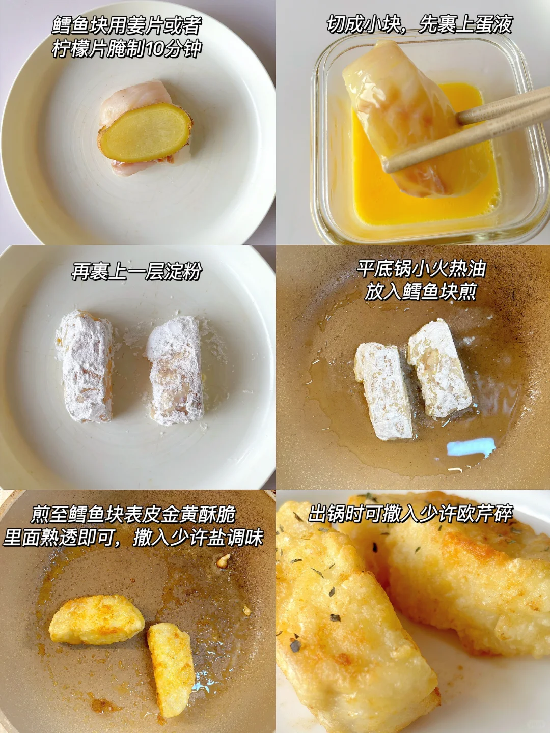 🌈表皮酥脆,里面鲜嫩的鳕鱼块,宝宝特别爱吃~ 🎈准备食材: 1️⃣无骨无刺的鳕鱼一块,鸡蛋一个,淀粉适量; 🎈制作步骤: 1️⃣ 鳕鱼块擦干水分,加生姜片或柠檬腌制10分钟,切成小块; 2️⃣鳕鱼先裹蛋液再裹淀粉,小火热锅刷油,放入鳕鱼块煎至表皮金黄酥脆里面熟透,加少许盐和欧芹碎调味即可;