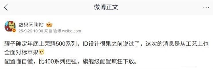 另外,该博主早在今年9月就曾爆料称,荣耀500系列确定年底发布,基本延续了前代的“爆款思路”,ID 设计“也很果”,“这次的消息是从工艺上也全面对标苹果”。此外,荣耀500系列配置比400系列更强,“旗舰级配置疯狂下放”。另外,近期还有多位博主曝光了该机的众多消息。
