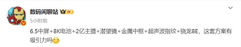 日前,数码博主“数码闲聊站”再次曝光了一款新机的部分核心配置,据爆料看,该机采用6.5英寸中屏,内置8000mAh大电池,配备2亿像素主摄+潜望长焦、采用金属中框、超声波指纹识别以及搭载高通骁龙8至尊版处理器。虽然博主并未透露该新机的型号,但是在该条微博评论区可以看到网友大多猜测该机很可能来自荣耀500 Pro。