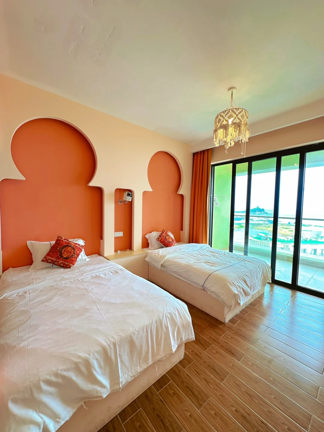 我们是从河源出发坐的是顺风车🚗来回的话是200左右一个人,民宿定的是虹海湾附近的,近礁石酒吧🍺淡季出行真的很划算,两天一晚一百多真的很香,是可以直接看到海的房间🌊风格是民宿那种风格的🌟