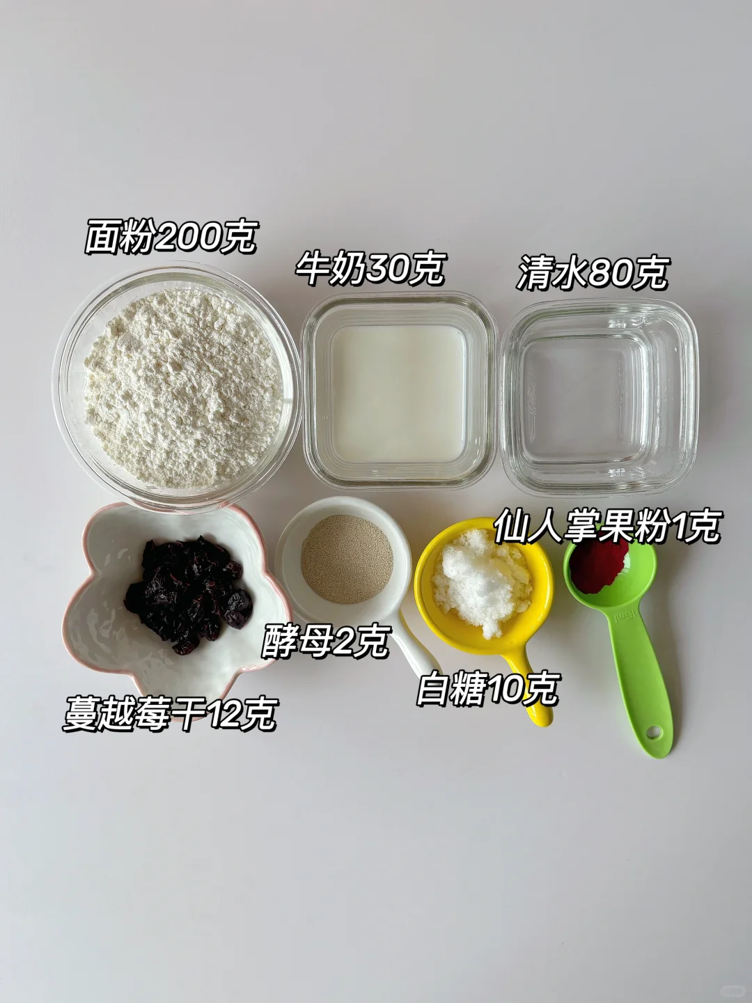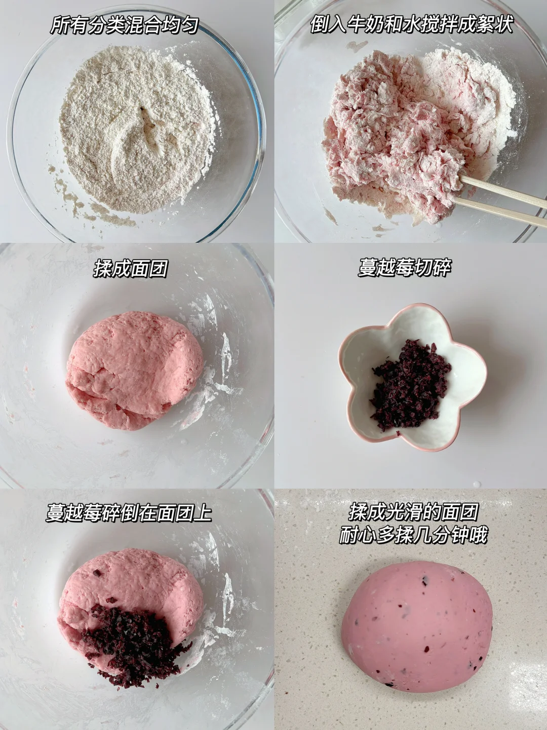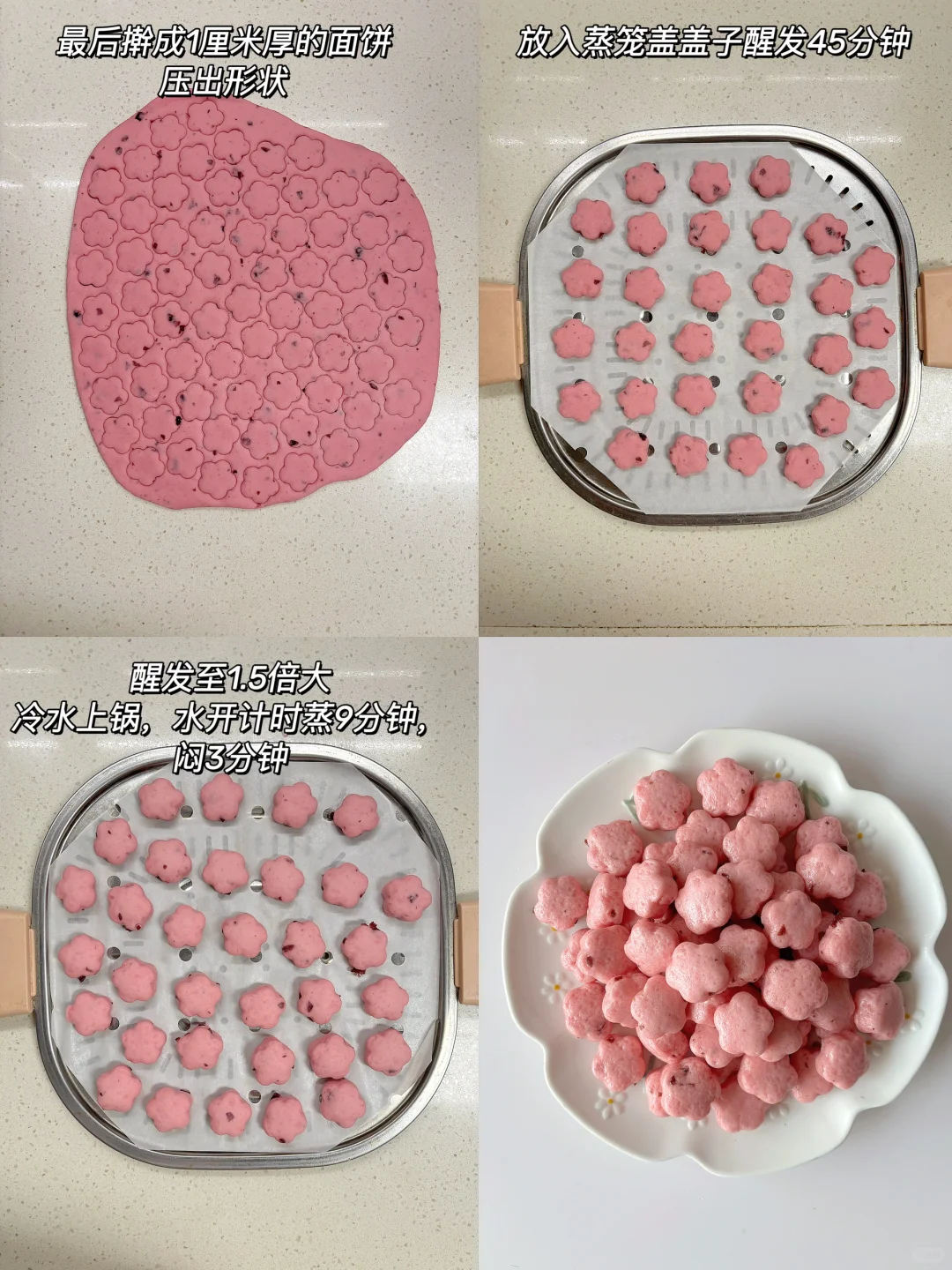 🌈香甜暄软的小馒头,一口一个~ 🎈准备食材: 1️⃣普通面粉200克,酵母2克,仙人掌果粉1克,糖10克,蔓越莓干12克,牛奶30克,清水80克; 🎈制作步骤: 1️⃣所有粉类混合均匀,倒入牛奶和清水搅拌成絮状,揉成面团后倒入切碎的蔓越莓干; 2️⃣揉成光滑的面团,多揉几分钟,确保最后面团是光滑的,然后如图折叠压面擀面,折叠擀面重复三,最后擀成1厘米厚的面饼; 3️⃣用压花器压出自己想要的形状,放入蒸笼盖盖,锅中放入温水,醒发45分钟,至1.5倍大; 4️⃣直接开火,水开计时蒸9分钟,闷3分钟即可。