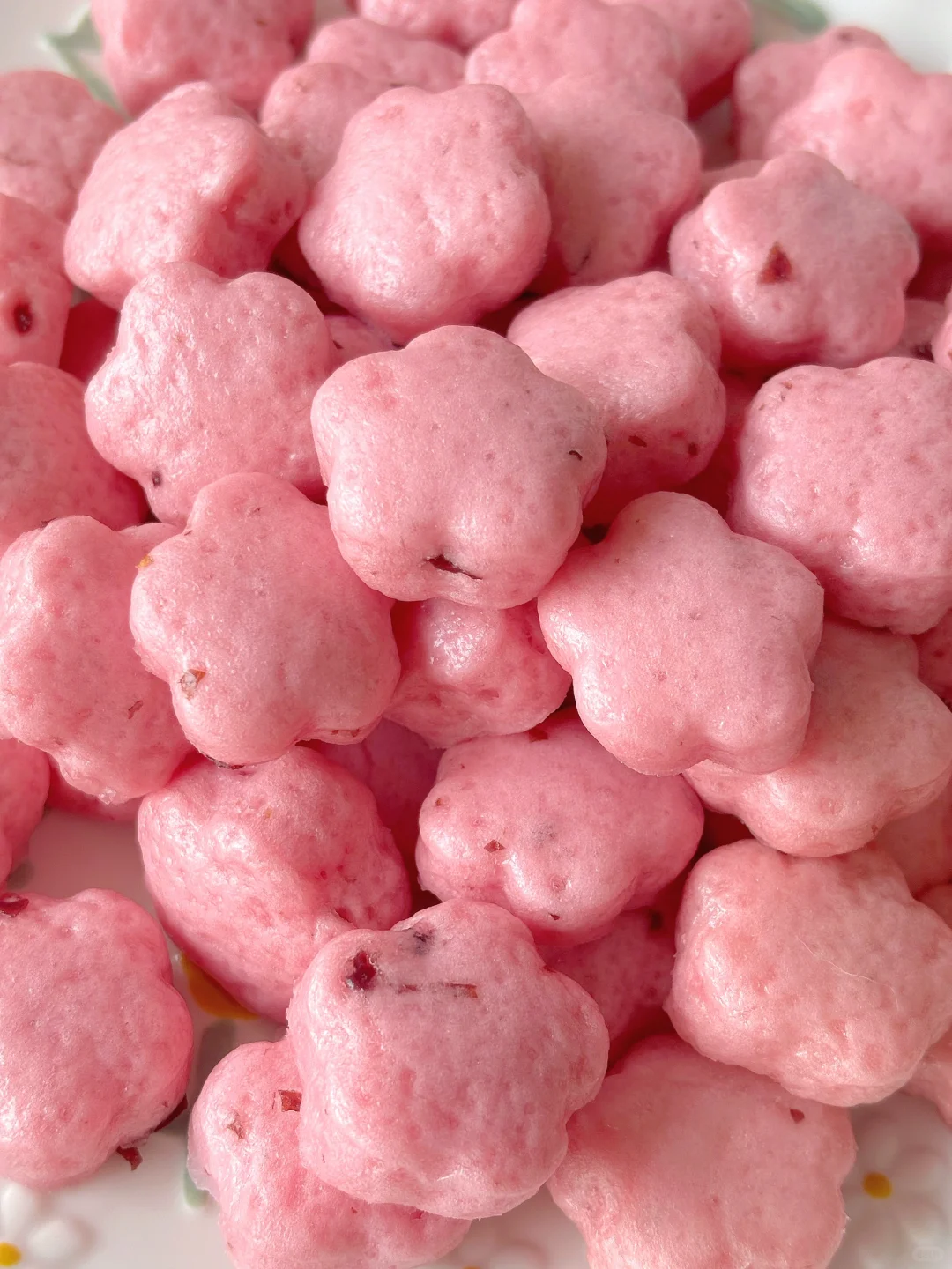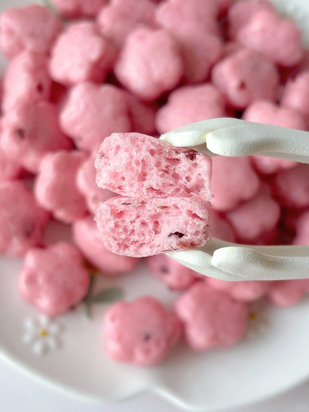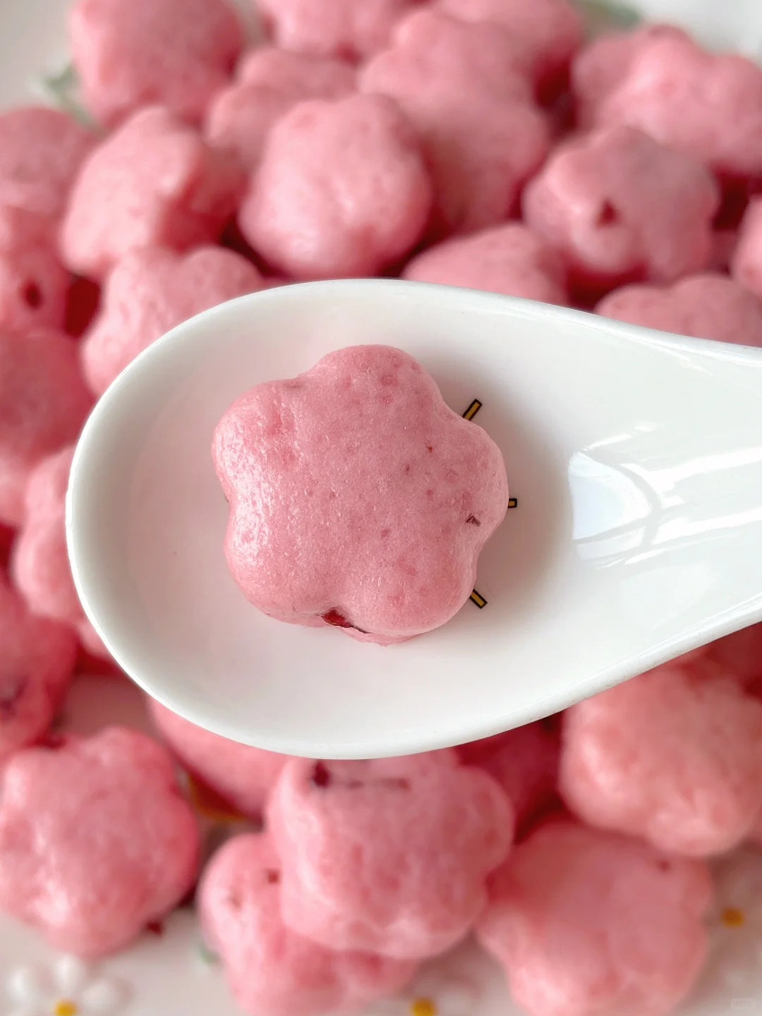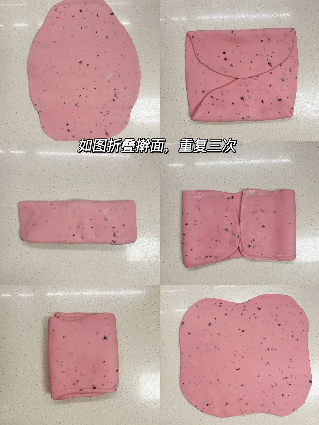 🌈香甜暄软的小馒头,一口一个~ 🎈准备食材: 1️⃣普通面粉200克,酵母2克,仙人掌果粉1克,糖10克,蔓越莓干12克,牛奶30克,清水80克; 🎈制作步骤: 1️⃣所有粉类混合均匀,倒入牛奶和清水搅拌成絮状,揉成面团后倒入切碎的蔓越莓干; 2️⃣揉成光滑的面团,多揉几分钟,确保最后面团是光滑的,然后如图折叠压面擀面,折叠擀面重复三,最后擀成1厘米厚的面饼; 3️⃣用压花器压出自己想要的形状,放入蒸笼盖盖,锅中放入温水,醒发45分钟,至1.5倍大; 4️⃣直接开火,水开计时蒸9分钟,闷3分钟即可。