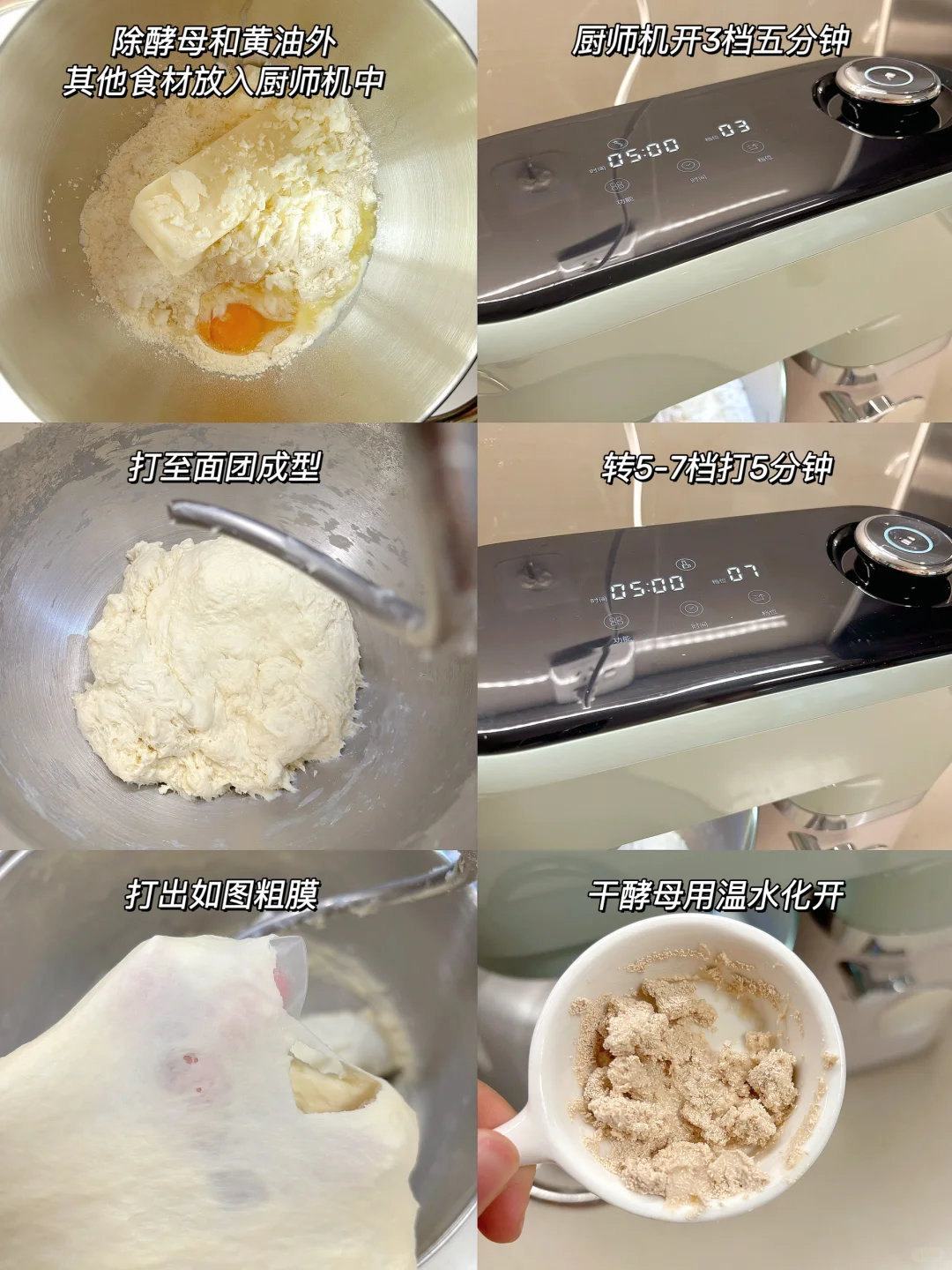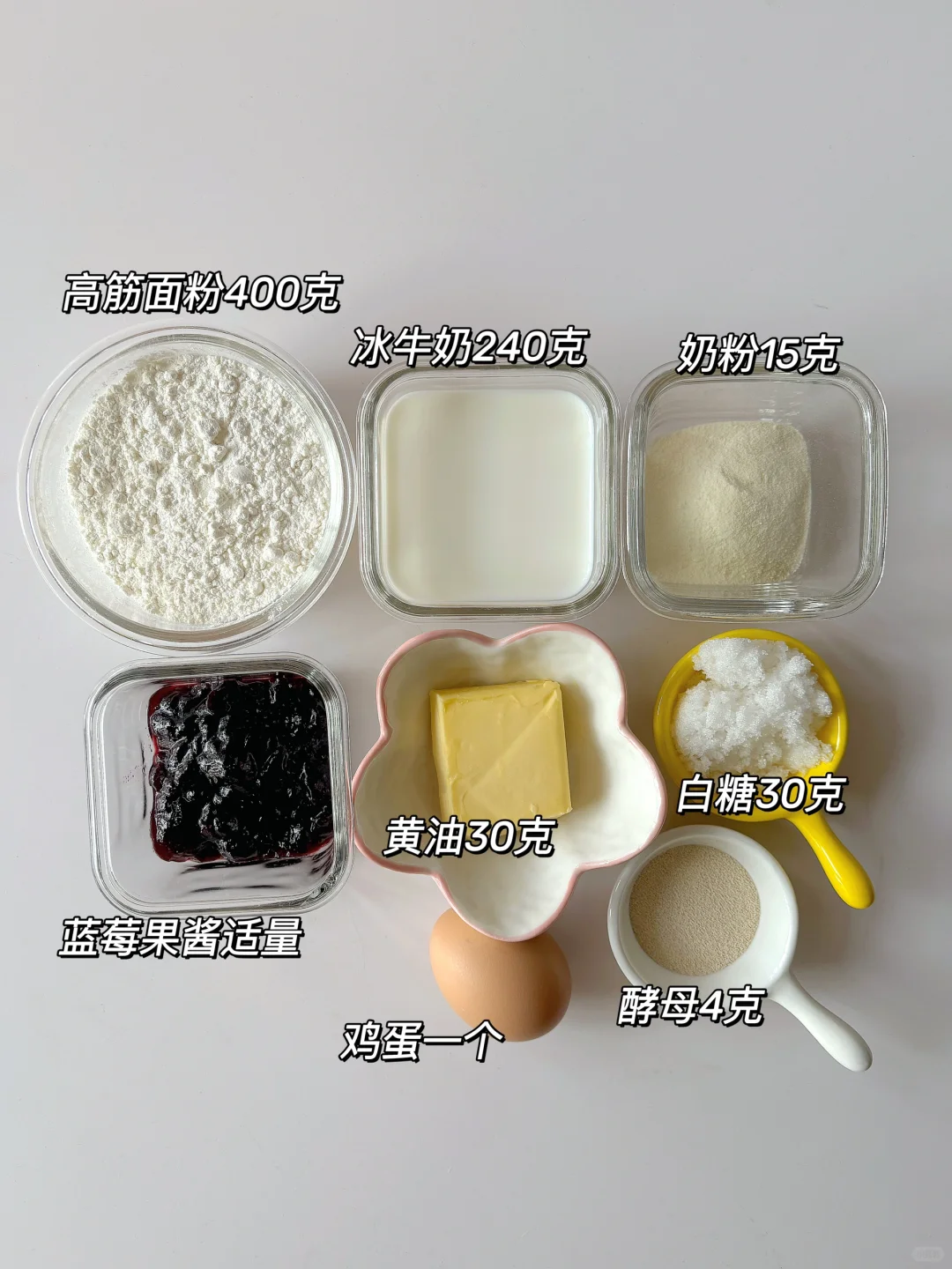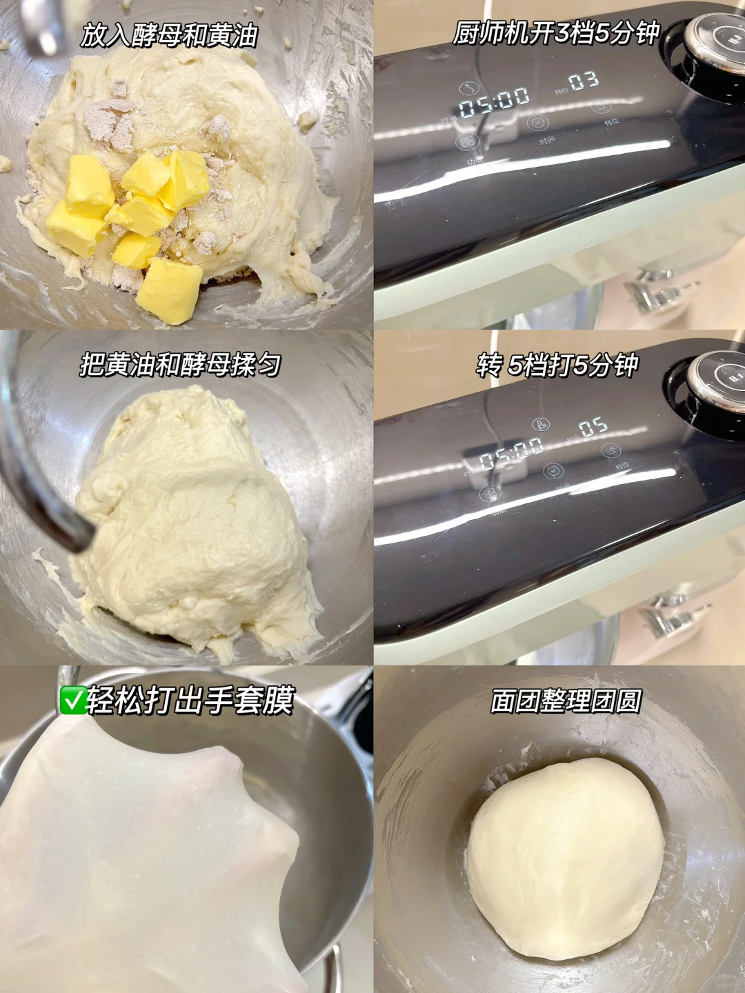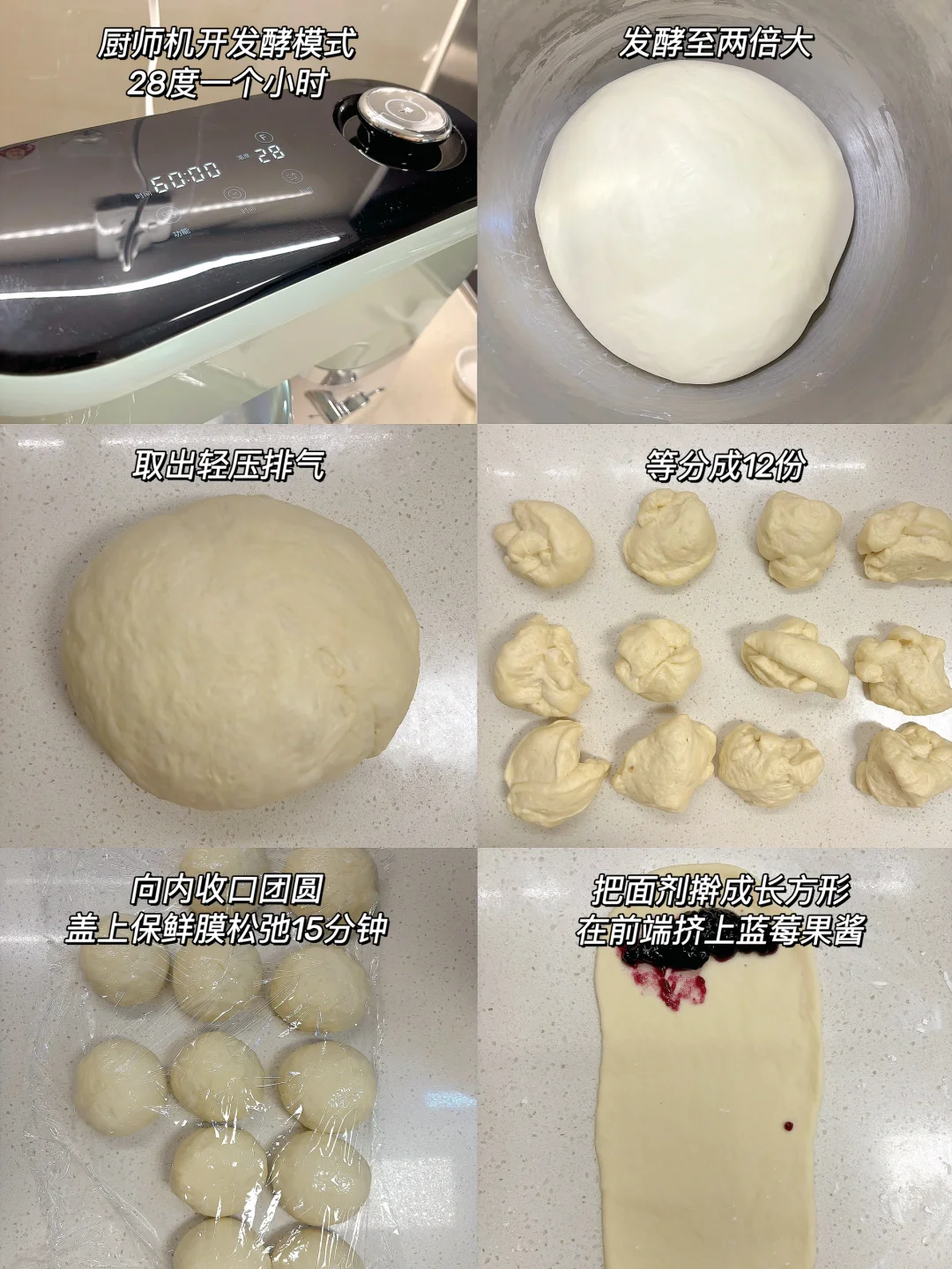 🎈准备食材: 1️⃣高筋面粉400克,奶粉15克,白糖30克,酵母4克,冰牛奶240克,鸡蛋一个,黄油30克,蓝莓果酱适量; 🎈制作步骤: 1️⃣ 除酵母和黄油外,其他食材放入厨师机中 厨师机开3档五分钟打至面团成型,转5-7档打5分钟功能,打出如图粗膜; 2️⃣干酵母用温水化开,放入酵母和黄油,厨师机开3档5分钟,把黄油和酵母揉匀,转5档打5分钟,轻松打出手套膜,面团整理团圆; 3️⃣ 厨师机开发酵模式,28度一个小时,发酵至两倍大,取出轻压排气,等分成12份,向肉收口团圆,盖上保鲜膜松弛15分钟; 4️⃣把面剂擀成长方形在前端挤上蓝莓果酱,从生胚中间开始如图分割,底部压扁,继续卷起,收口处捏紧; 5️⃣收口处朝下摆入烤盘,二次发酵至1.5倍大表面刷全蛋液(35度45分钟,旁边放碗热水),烤箱160度烤25分钟左右。 这次做面包用的是焙士达E5家用厨师机,它是顶置触控屏,而且操作简单、免弯腰设计、不占空间,对新手小白特别友好,用它做面包可以轻松揉出手套膜哦~ 而且它的颜值很高,而且性能高,使用的时候噪音也很低。它不仅可以和面,还有发酵、打发、压面、灌肠多功能哦,天气冷面团不好发酵的问题迎刃而解啦~ 🎈马上就要618了,有最新低价哦,前一百名购买厨师机的宝宝送烤箱~