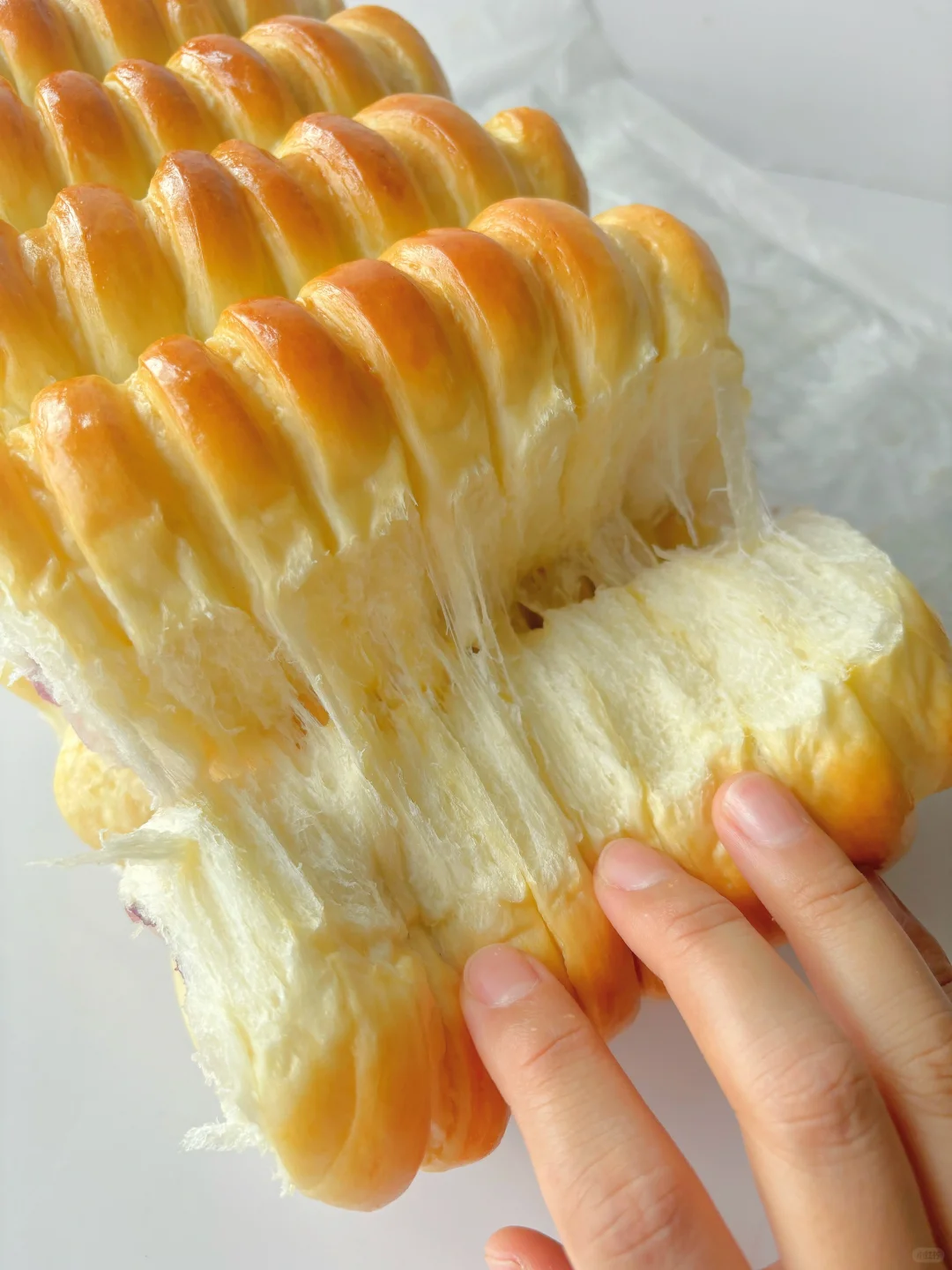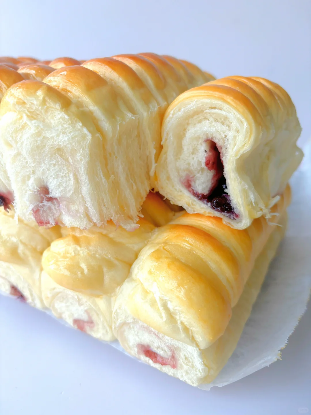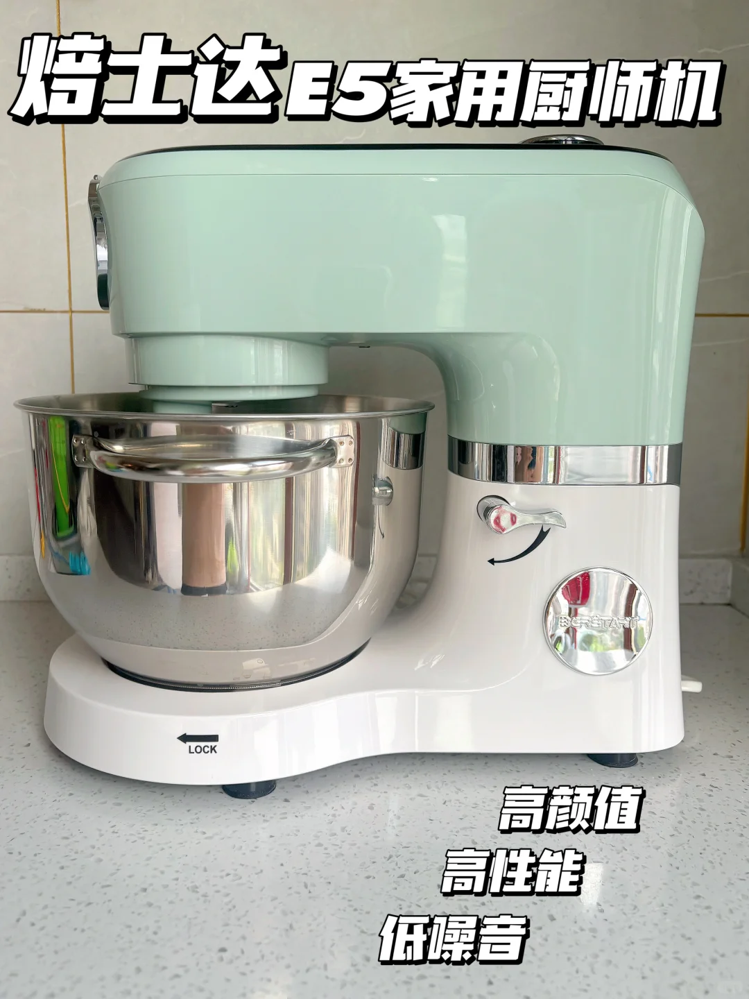 🎈准备食材: 1️⃣高筋面粉400克,奶粉15克,白糖30克,酵母4克,冰牛奶240克,鸡蛋一个,黄油30克,蓝莓果酱适量; 🎈制作步骤: 1️⃣ 除酵母和黄油外,其他食材放入厨师机中 厨师机开3档五分钟打至面团成型,转5-7档打5分钟功能,打出如图粗膜; 2️⃣干酵母用温水化开,放入酵母和黄油,厨师机开3档5分钟,把黄油和酵母揉匀,转5档打5分钟,轻松打出手套膜,面团整理团圆; 3️⃣ 厨师机开发酵模式,28度一个小时,发酵至两倍大,取出轻压排气,等分成12份,向肉收口团圆,盖上保鲜膜松弛15分钟; 4️⃣把面剂擀成长方形在前端挤上蓝莓果酱,从生胚中间开始如图分割,底部压扁,继续卷起,收口处捏紧; 5️⃣收口处朝下摆入烤盘,二次发酵至1.5倍大表面刷全蛋液(35度45分钟,旁边放碗热水),烤箱160度烤25分钟左右。 这次做面包用的是焙士达E5家用厨师机,它是顶置触控屏,而且操作简单、免弯腰设计、不占空间,对新手小白特别友好,用它做面包可以轻松揉出手套膜哦~ 而且它的颜值很高,而且性能高,使用的时候噪音也很低。它不仅可以和面,还有发酵、打发、压面、灌肠多功能哦,天气冷面团不好发酵的问题迎刃而解啦~ 🎈马上就要618了,有最新低价哦,前一百名购买厨师机的宝宝送烤箱~